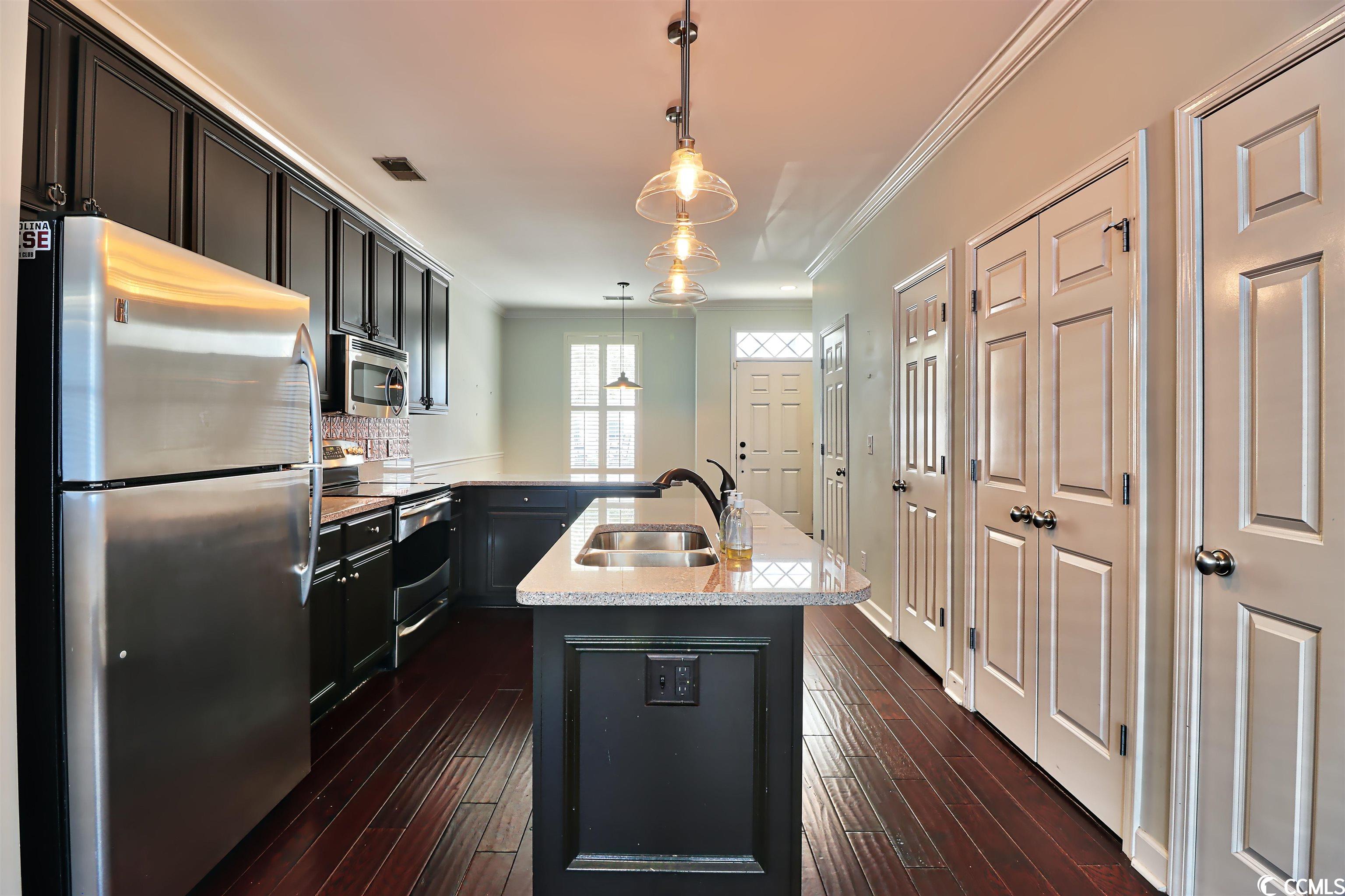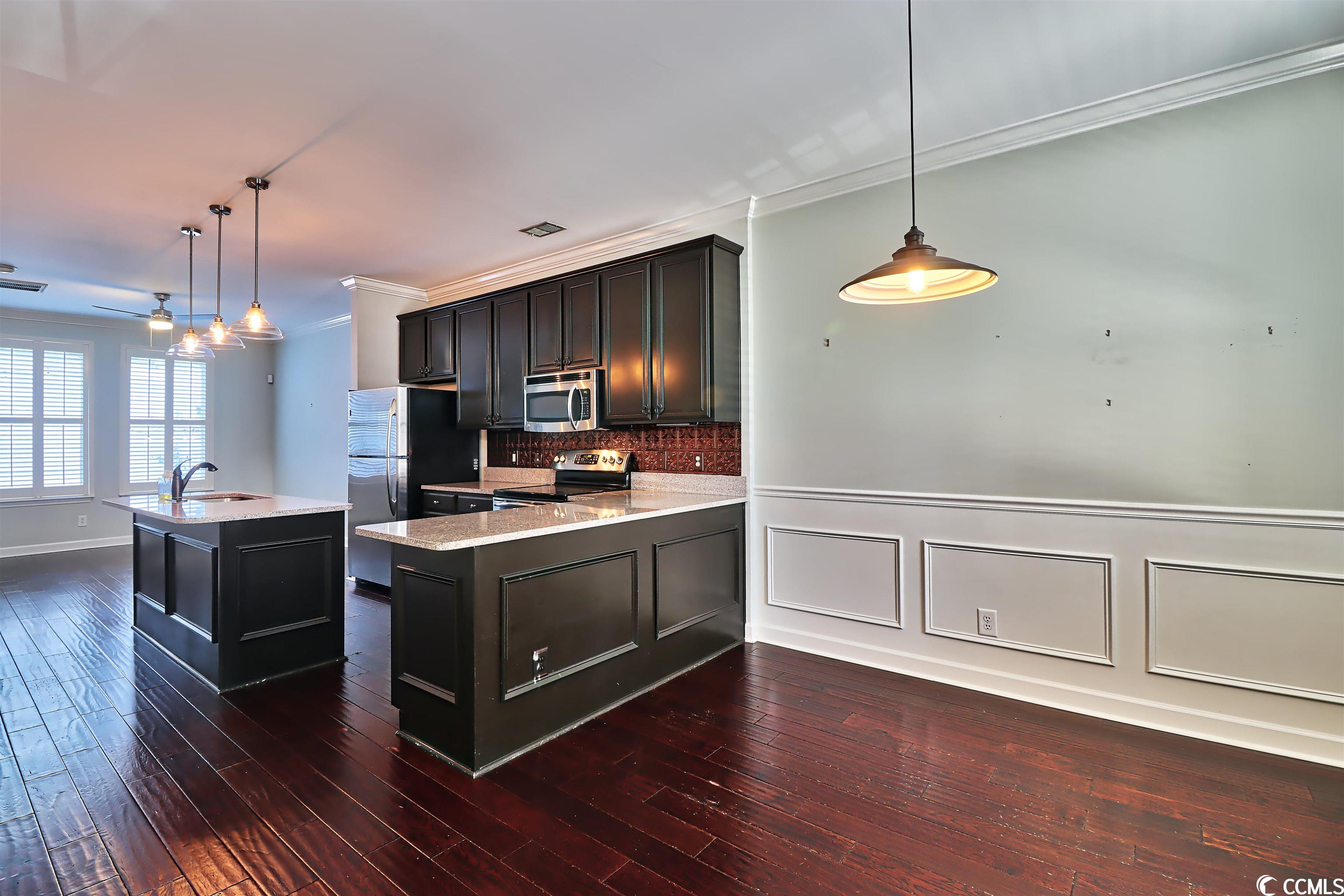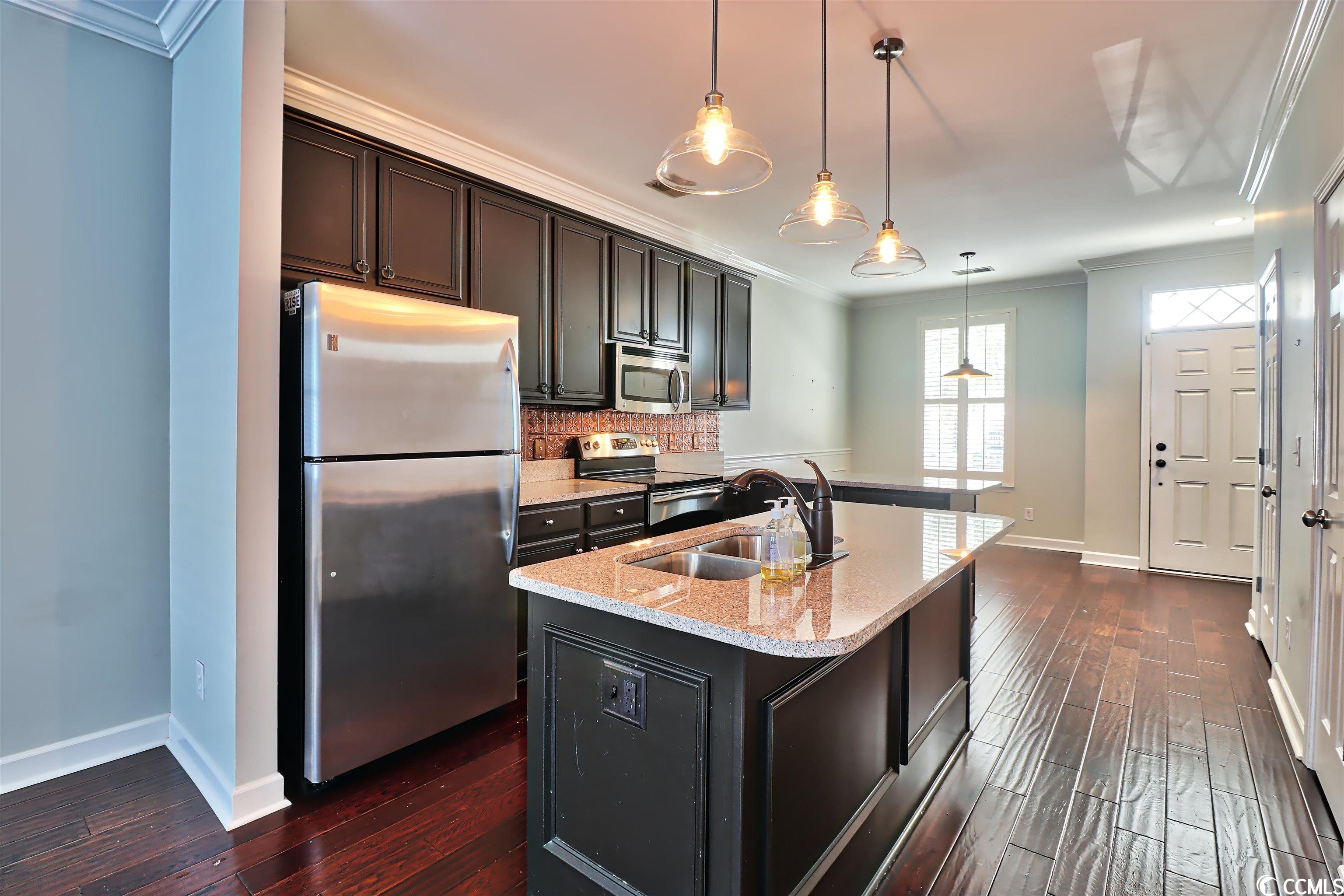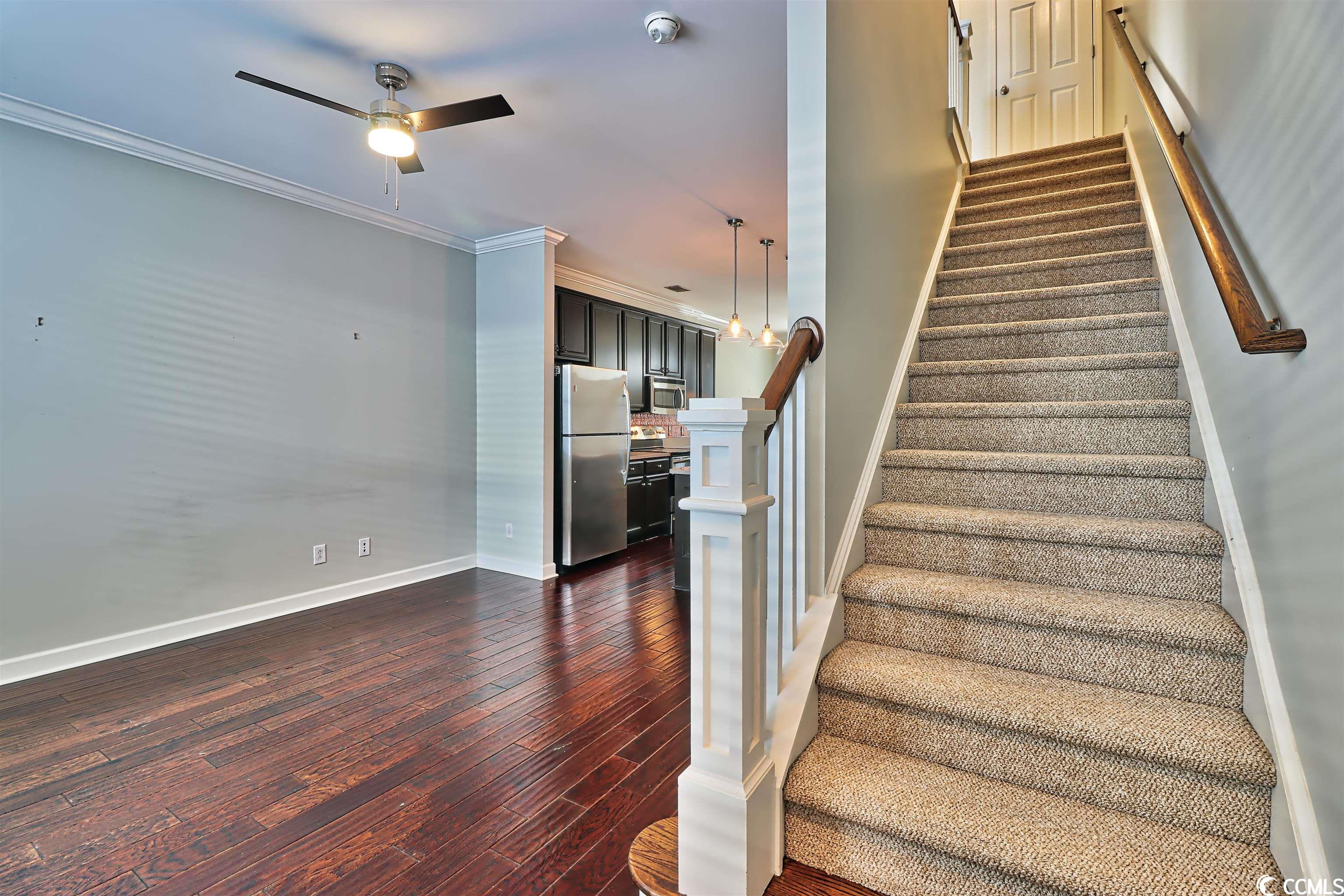 Welcome home! Unique townhouse in the heart of Myrtle Beach! At the end of a quiet street, this unit is in a walkable community. St. James Place includes restaurants, coffee shops, hair salons, a bank, and boutiques. This property features granite countertops, stainless appliances, a copper backsplash! Designer lighting and upgraded cabinets add to its charm. Hardwood flooring, neutral walls, plantation shutters and wood blinds are a bonus. The green space between the townhouse and the garage is very private and includes outdoor lighting. The garage is painted and the ceiling is finished. Call today for a tour! This townhouse is a gem.