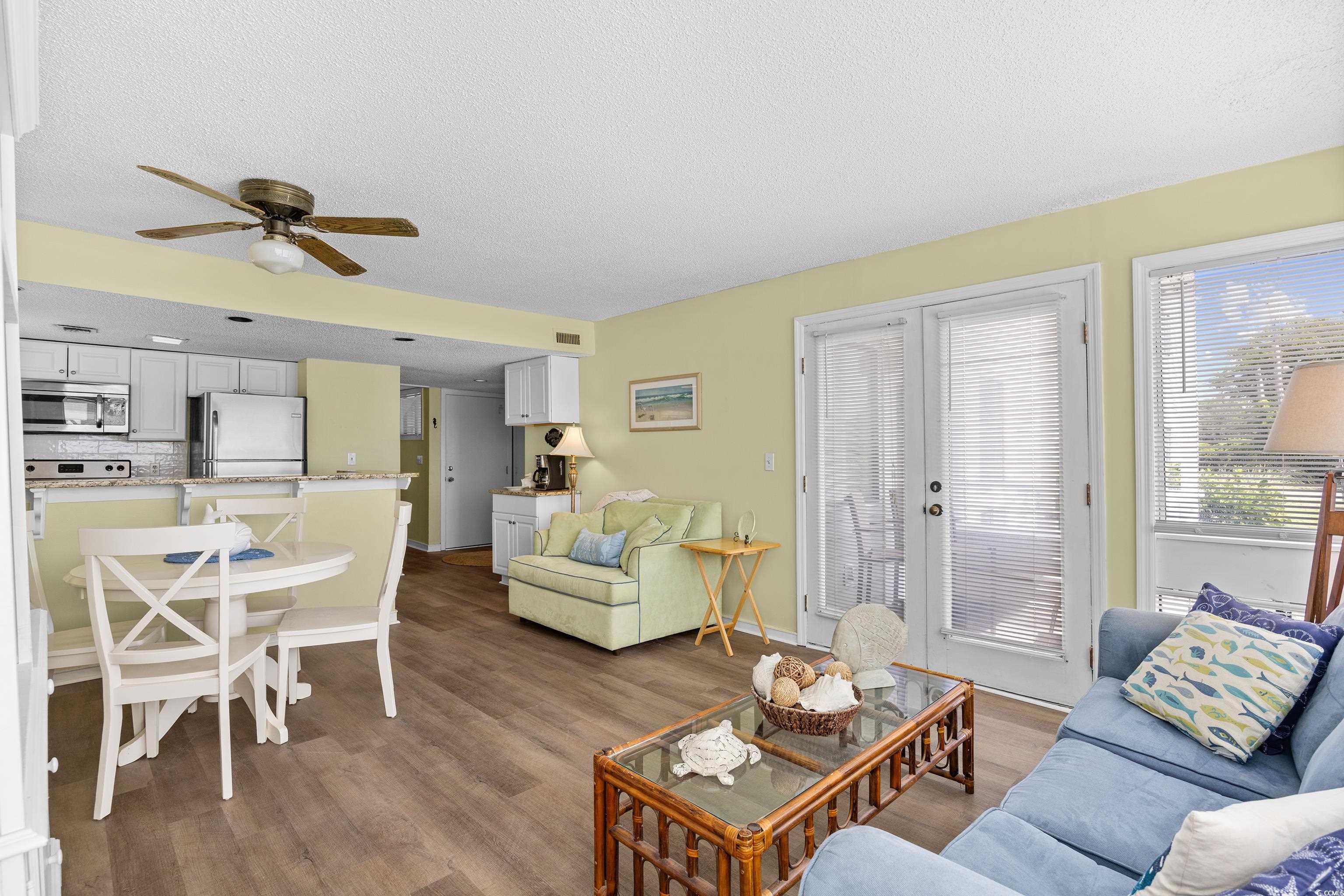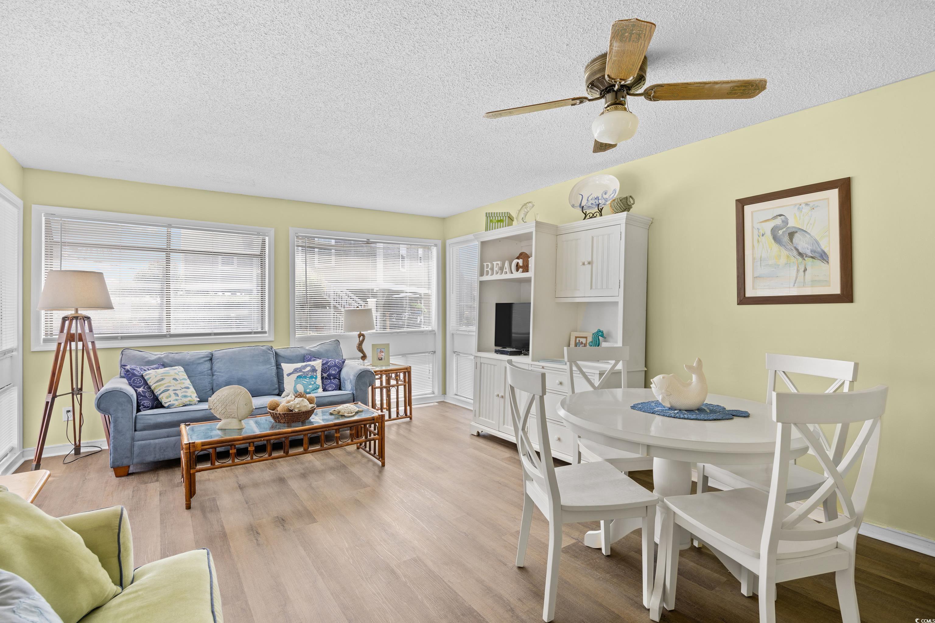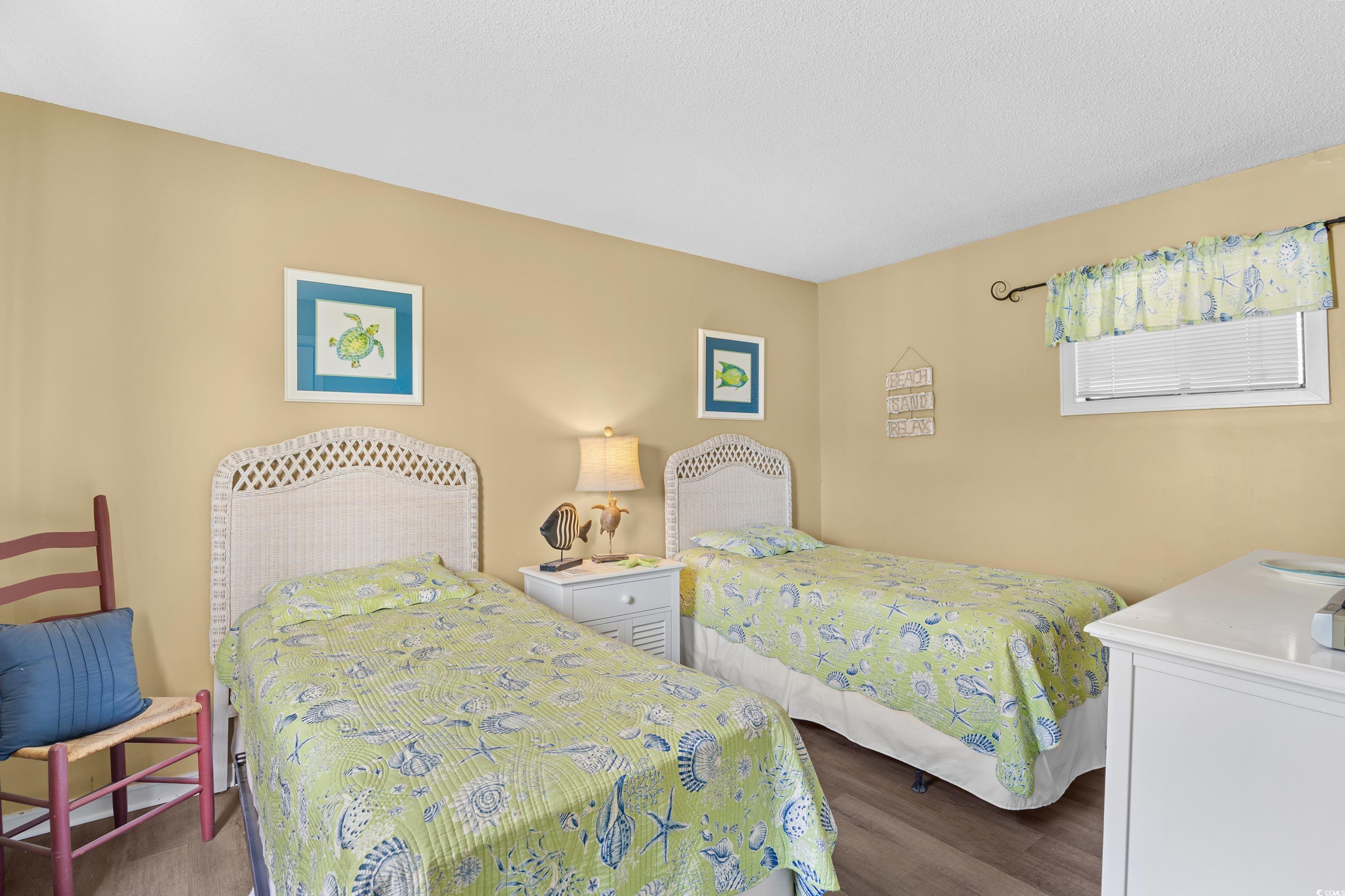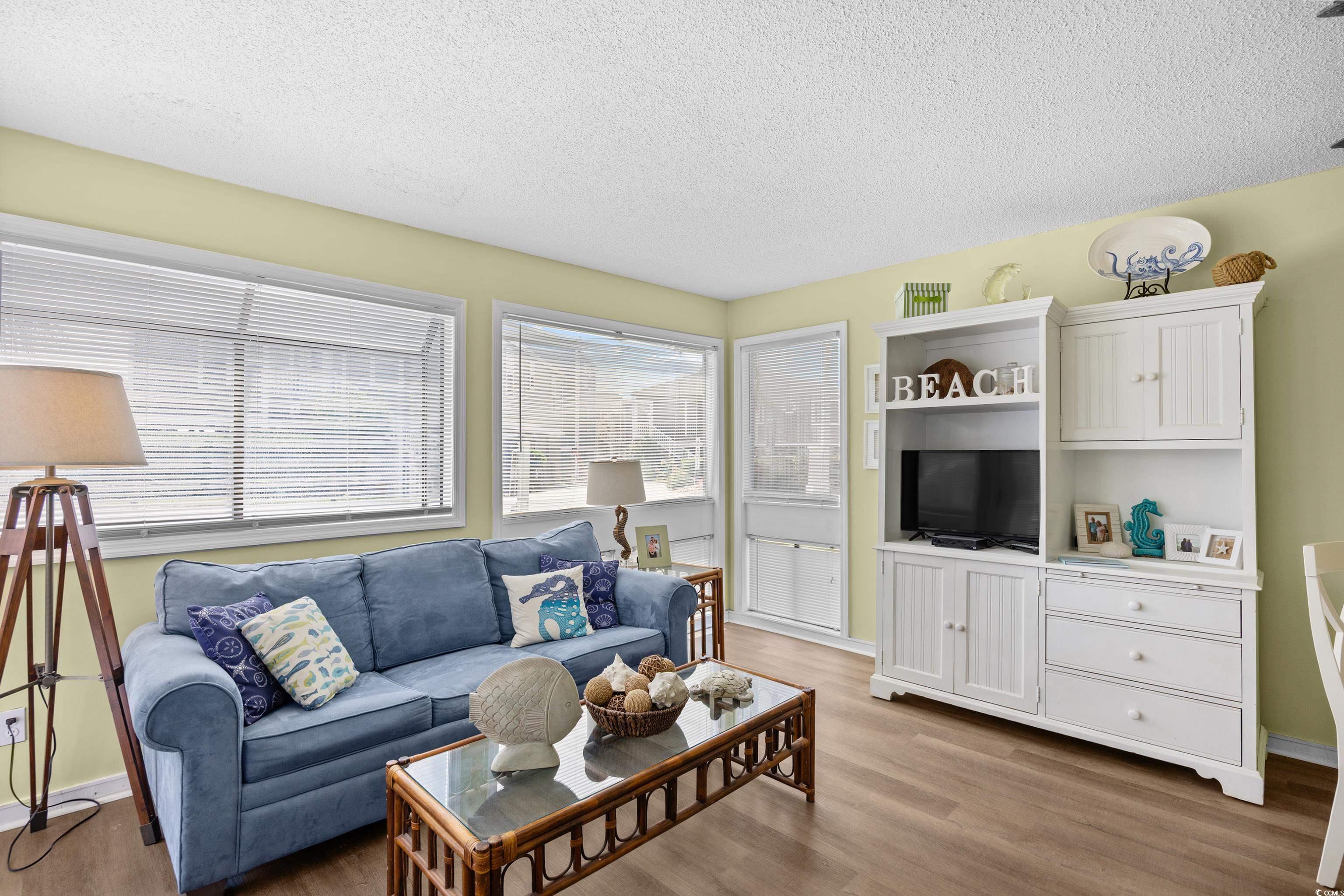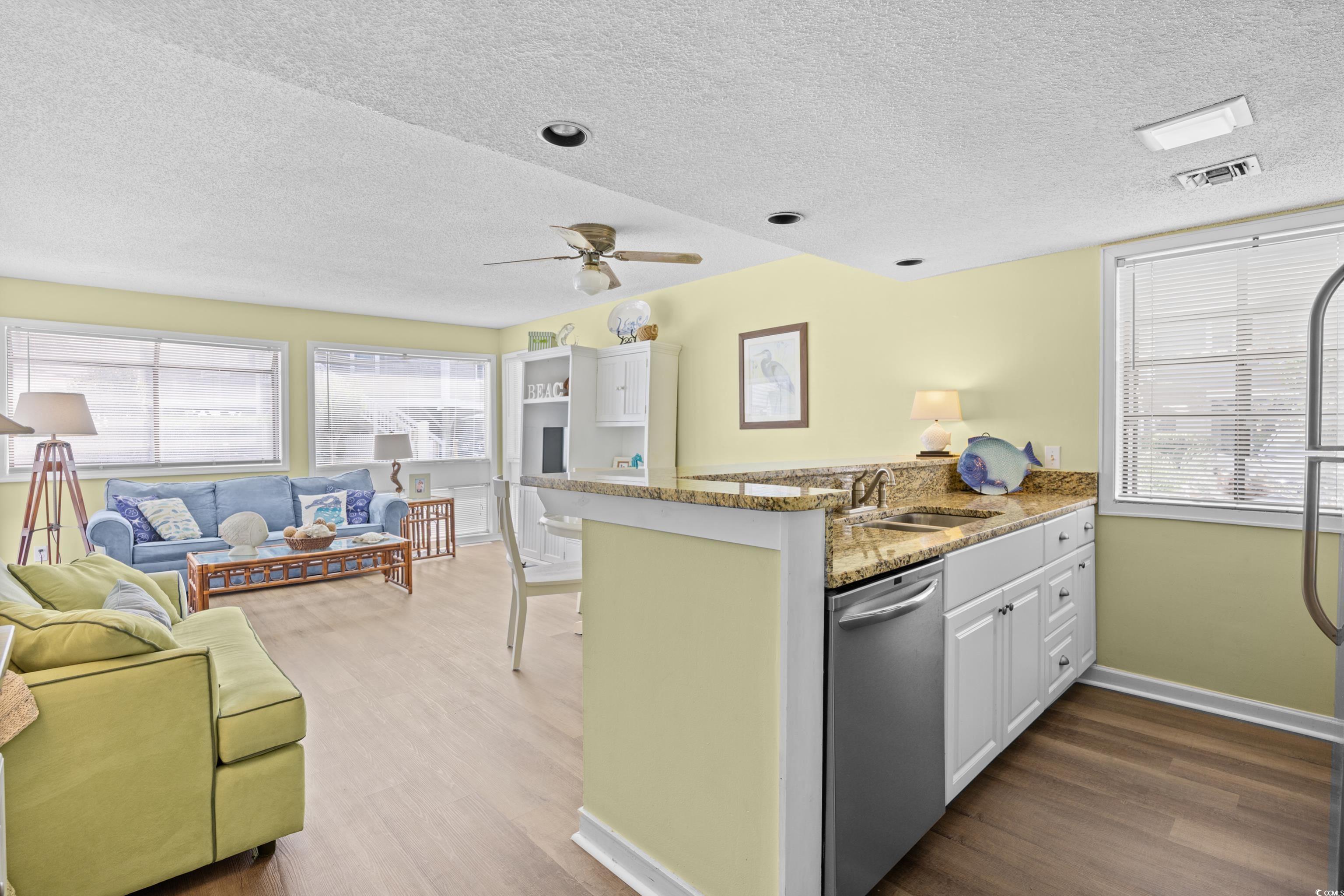 Updated and ready for summer and a new owner! See this move-in ready first floor condominium, fully furnished, with new LVP flooring in all rooms (tile in baths), and a great layout. Enter the foyer and there is a large storage closet on the left. Beyond is the primary suite with full bath and new door to porch. Back to entry and living/dining/kitchen and see upgraded cabinets, granite counters, and stainless appliances. The living/Dining area is nicely furnished and there is a new sliding door to the porch. The 2nd bedroom and bath are ready for your family or friends. Arcadian Dunes is loaded with amenities including two pools, one of which is directly behind building 4, a hot tub, sauna, steam room, tennis courts, and a playground. On-site picnic areas with grills and Harry the Hat Bar & Grill, don't have to leave the neighborhood! But you will want to! Check out Apache Pier, Ocean Annies, and Broadway at the Beach, and the Beach!!