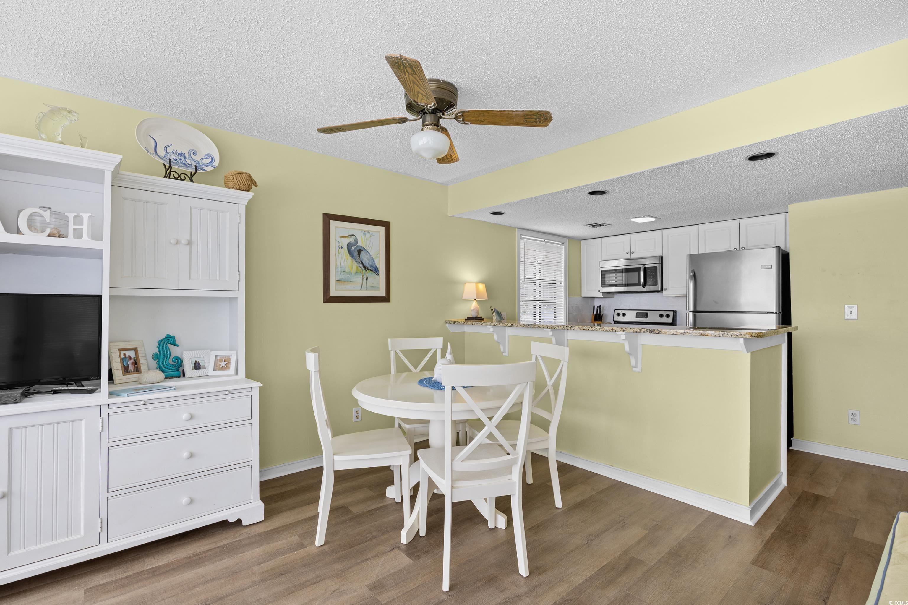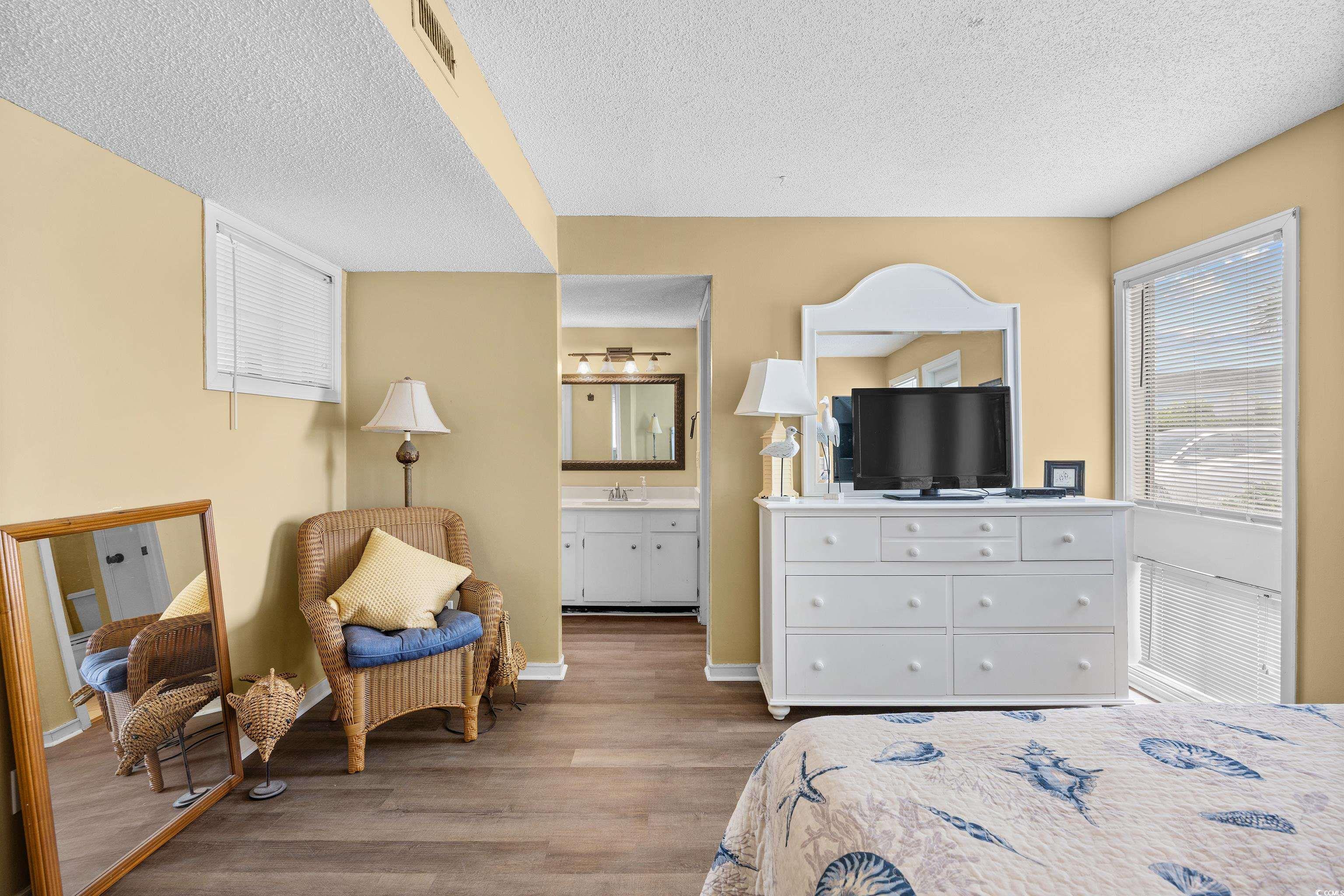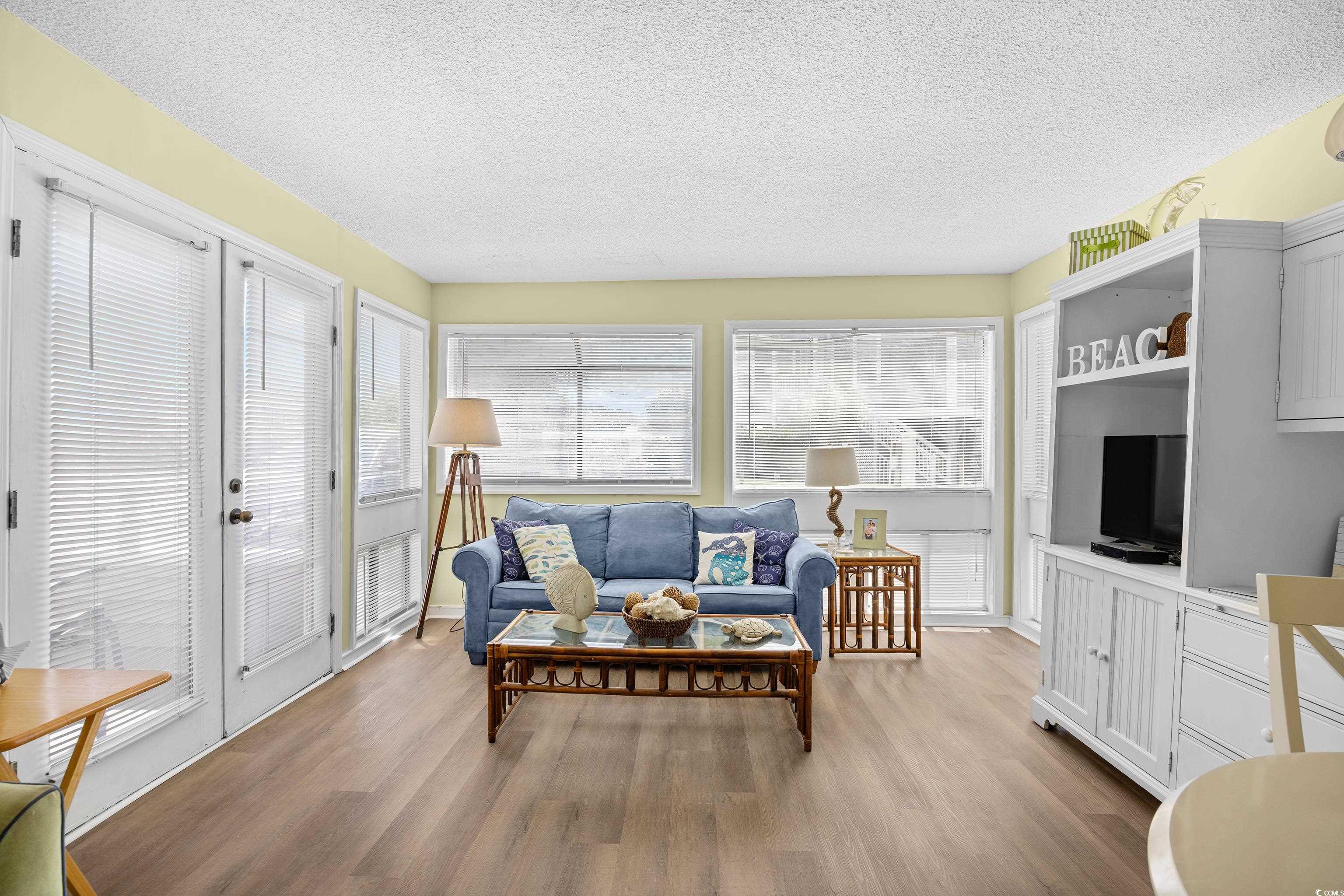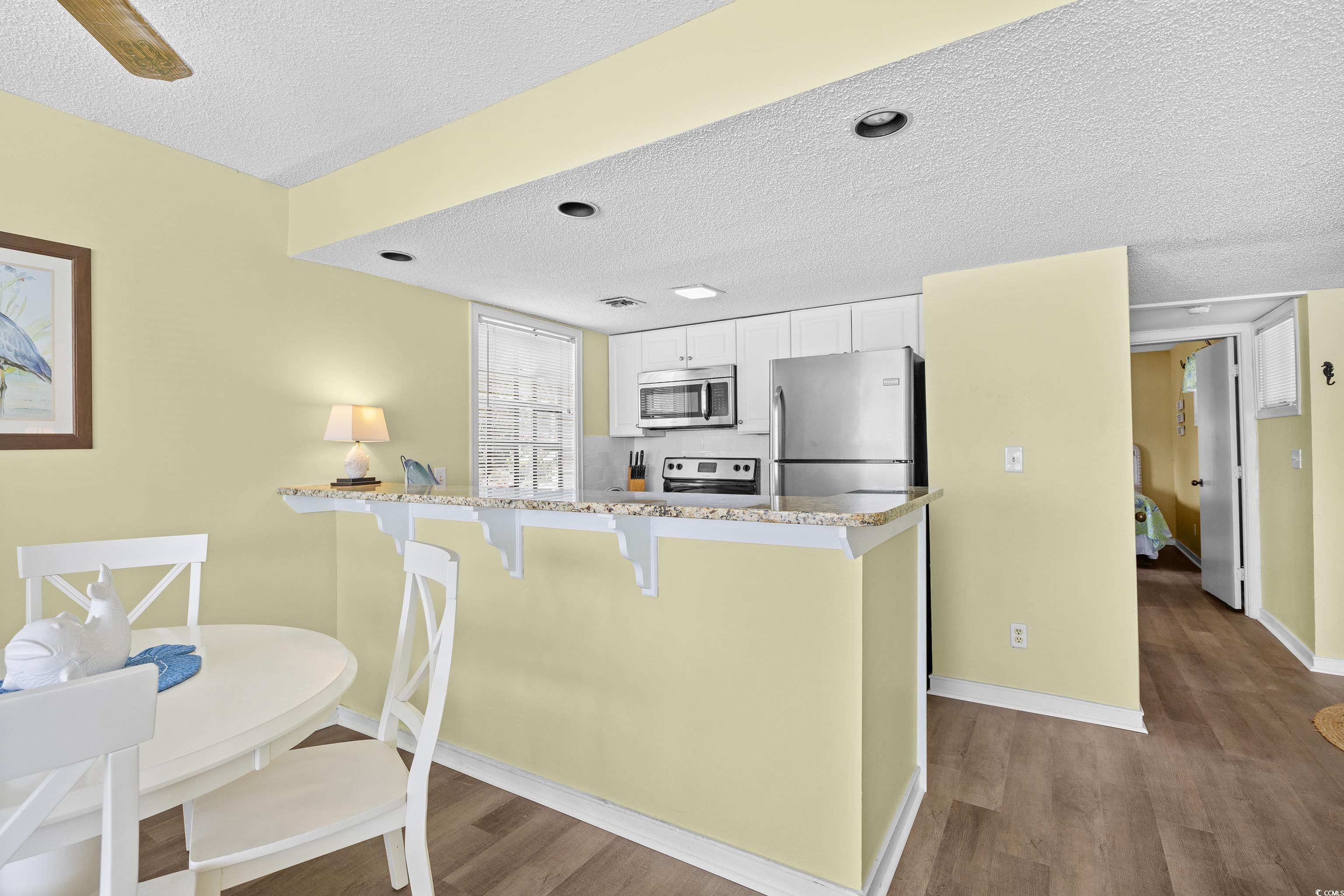 Updated and ready for summer and a new owner! See this move-in ready first floor condominium, fully furnished, with new LVP flooring in all rooms (tile in baths), and a great layout. Enter the foyer and there is a large storage closet on the left. Beyond is the primary suite with full bath and new door to porch. Back to entry and living/dining/kitchen and see upgraded cabinets, granite counters, and stainless appliances. The living/Dining area is nicely furnished and there is a new sliding door to the porch. The 2nd bedroom and bath are ready for your family or friends. Arcadian Dunes is loaded with amenities including two pools, one of which is directly behind building 4, a hot tub, sauna, steam room, tennis courts, and a playground. On-site picnic areas with grills and Harry the Hat Bar & Grill, don't have to leave the neighborhood! But you will want to! Check out Apache Pier, Ocean Annies, and Broadway at the Beach, and the Beach!!