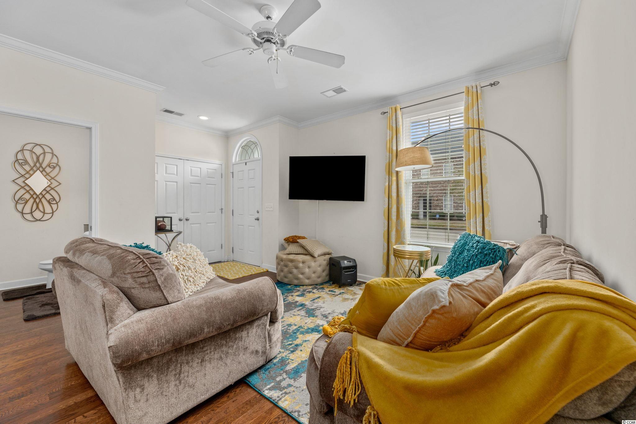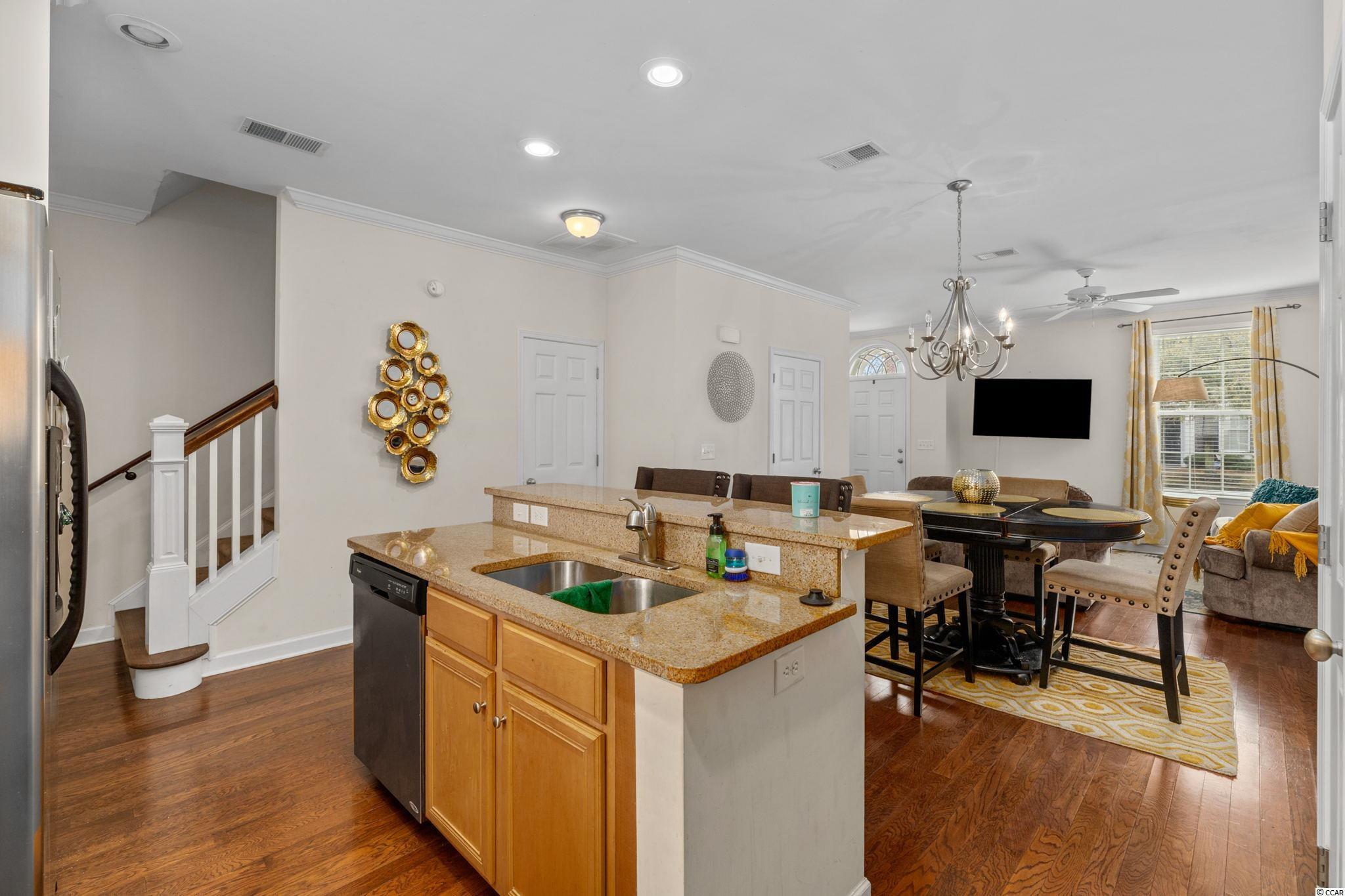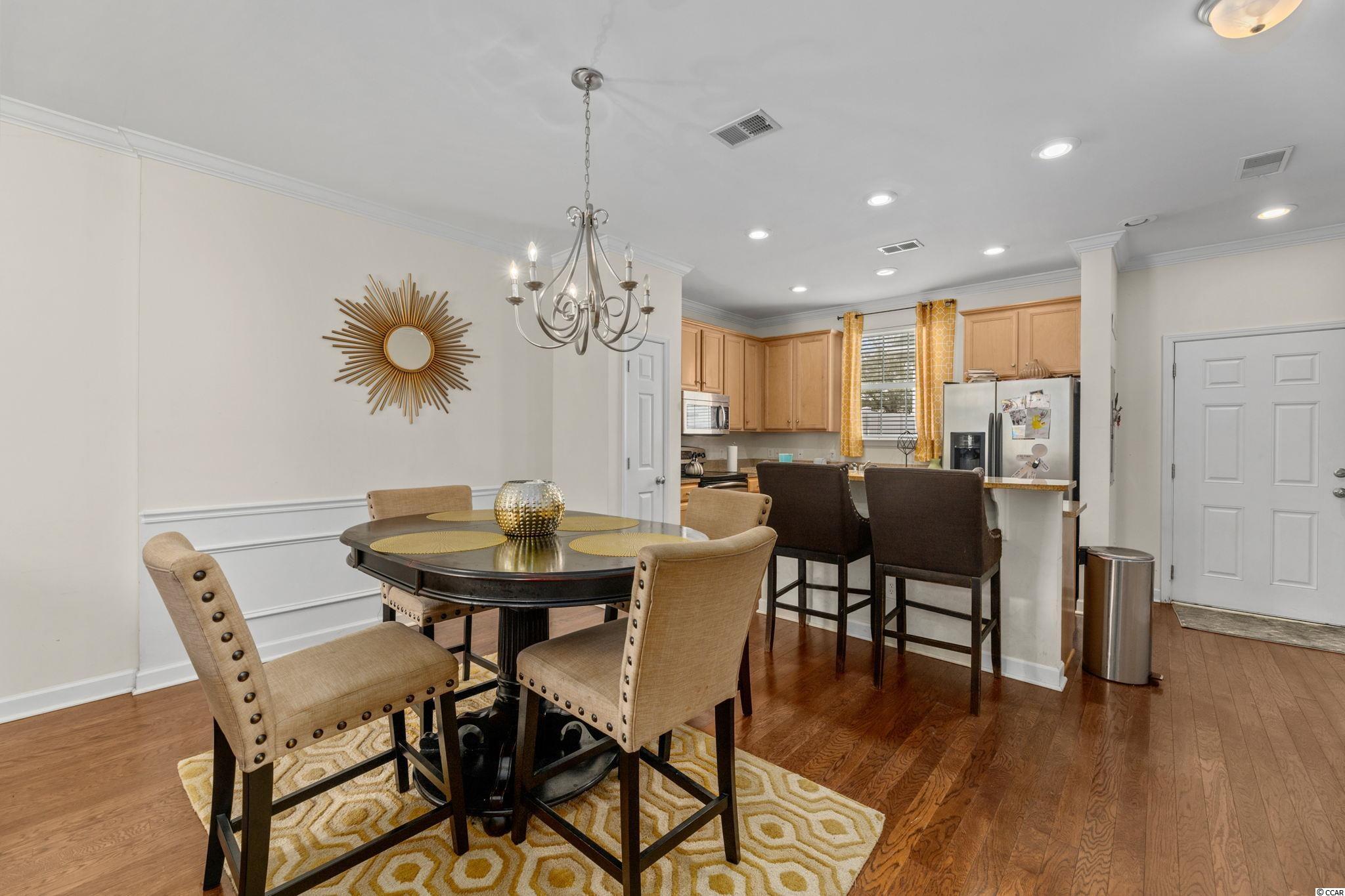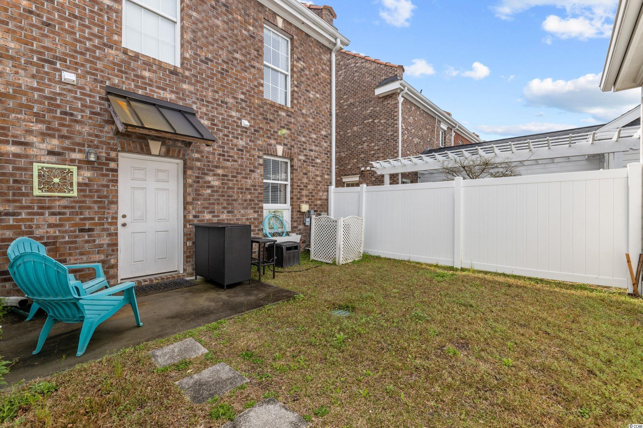 St James Square is a small-scale live/work community in an ideal location of Myrtle Beach. Conveniently located to shopping, grocery, medical, and THE BEACH. This 2 bedroom 2.5 bathroom brick townhome is an end unit. Inside you will find hardwood floors and granite countertops. The kitchen bolsters stainless steel appliances and a pantry. Powder room on the first floor allowing for a great entertaining opportunity. Upstairs you will find 2 split bedrooms; great for privacy. Another highlight of this property is the private 2 car garage. Schedule today if looking for primary/secondary home along the Grand Strand.
