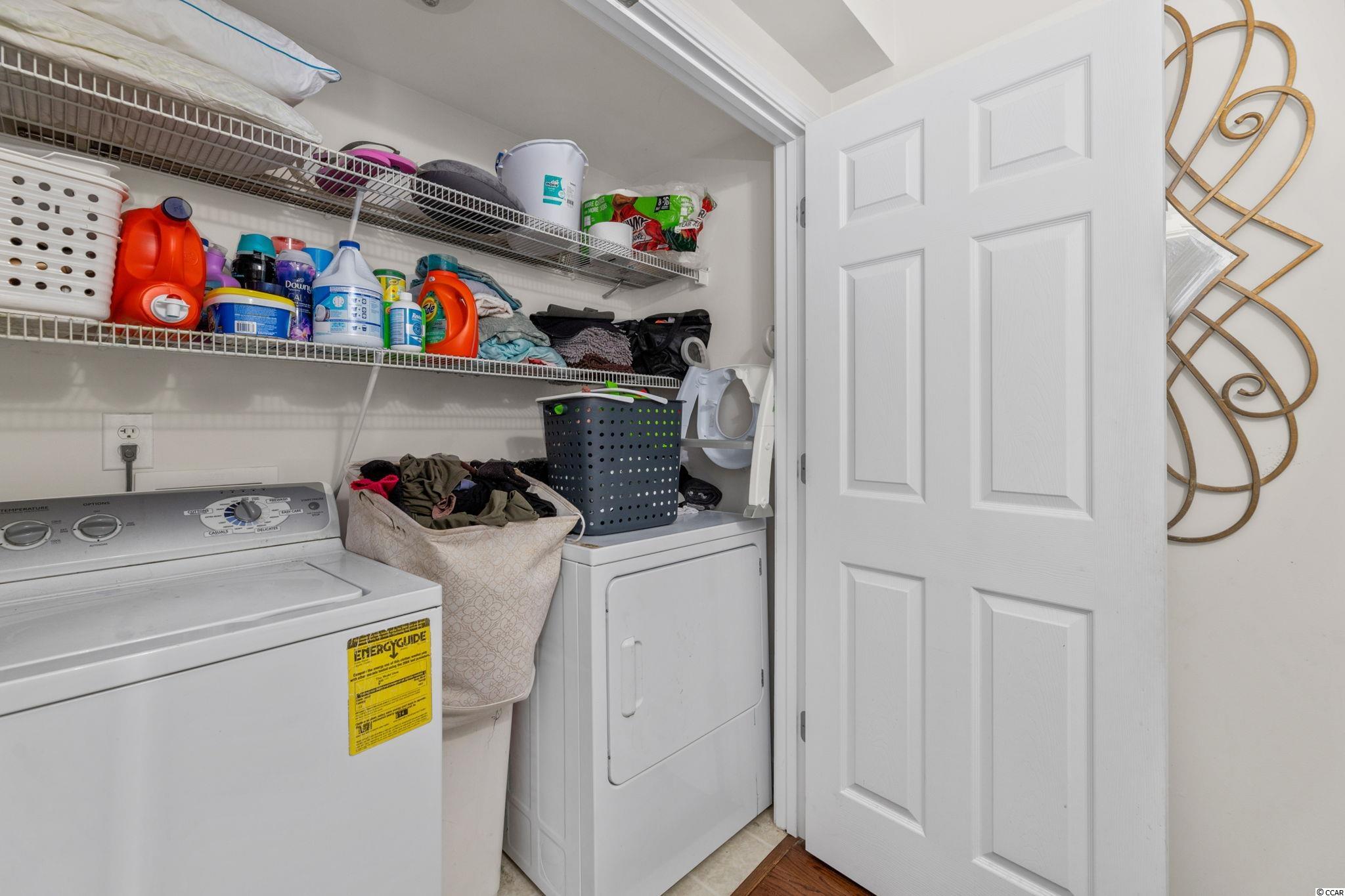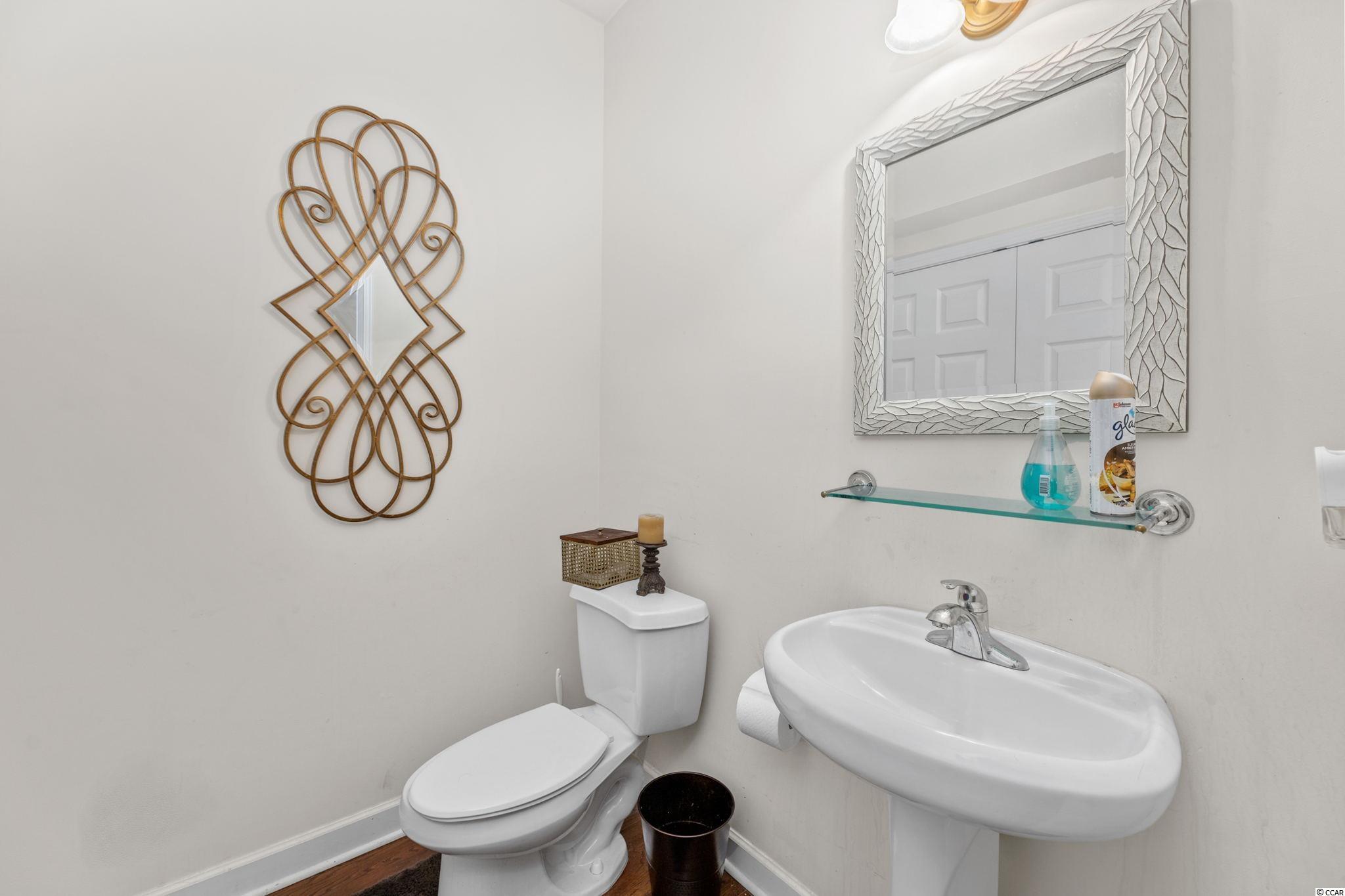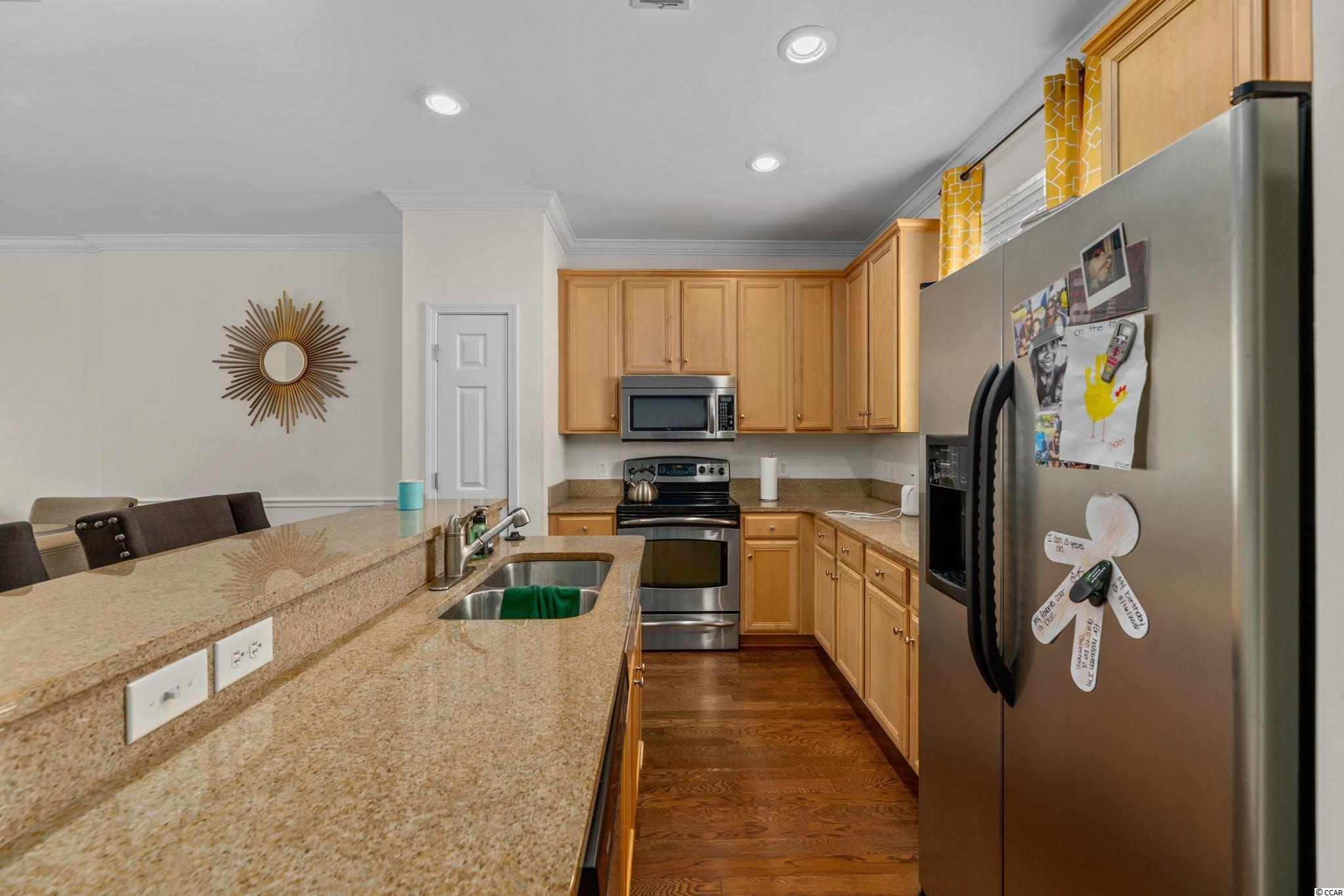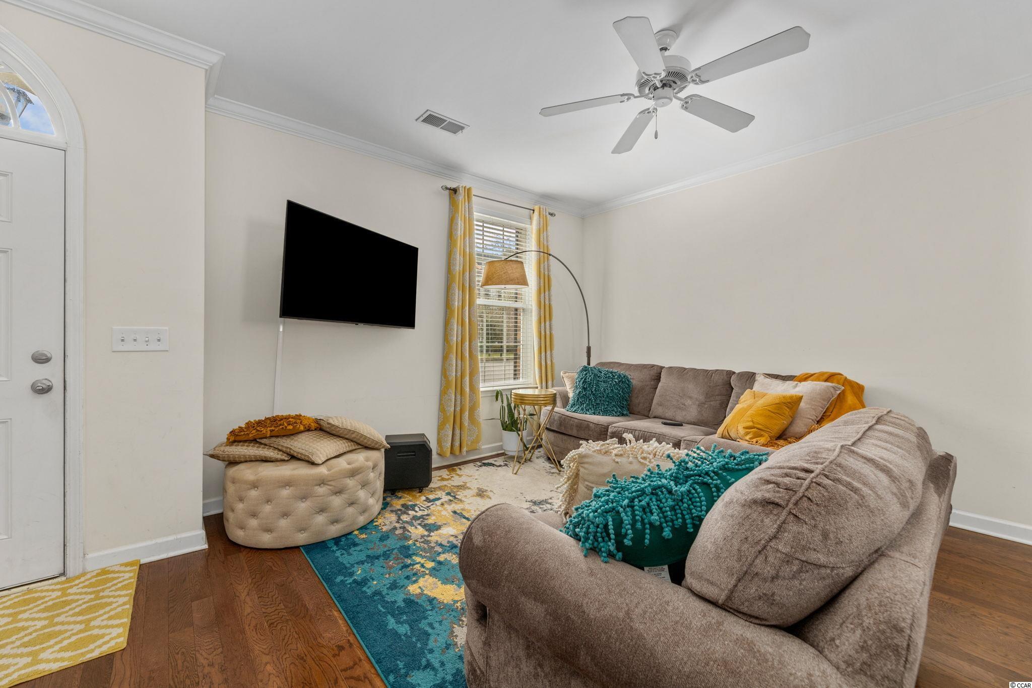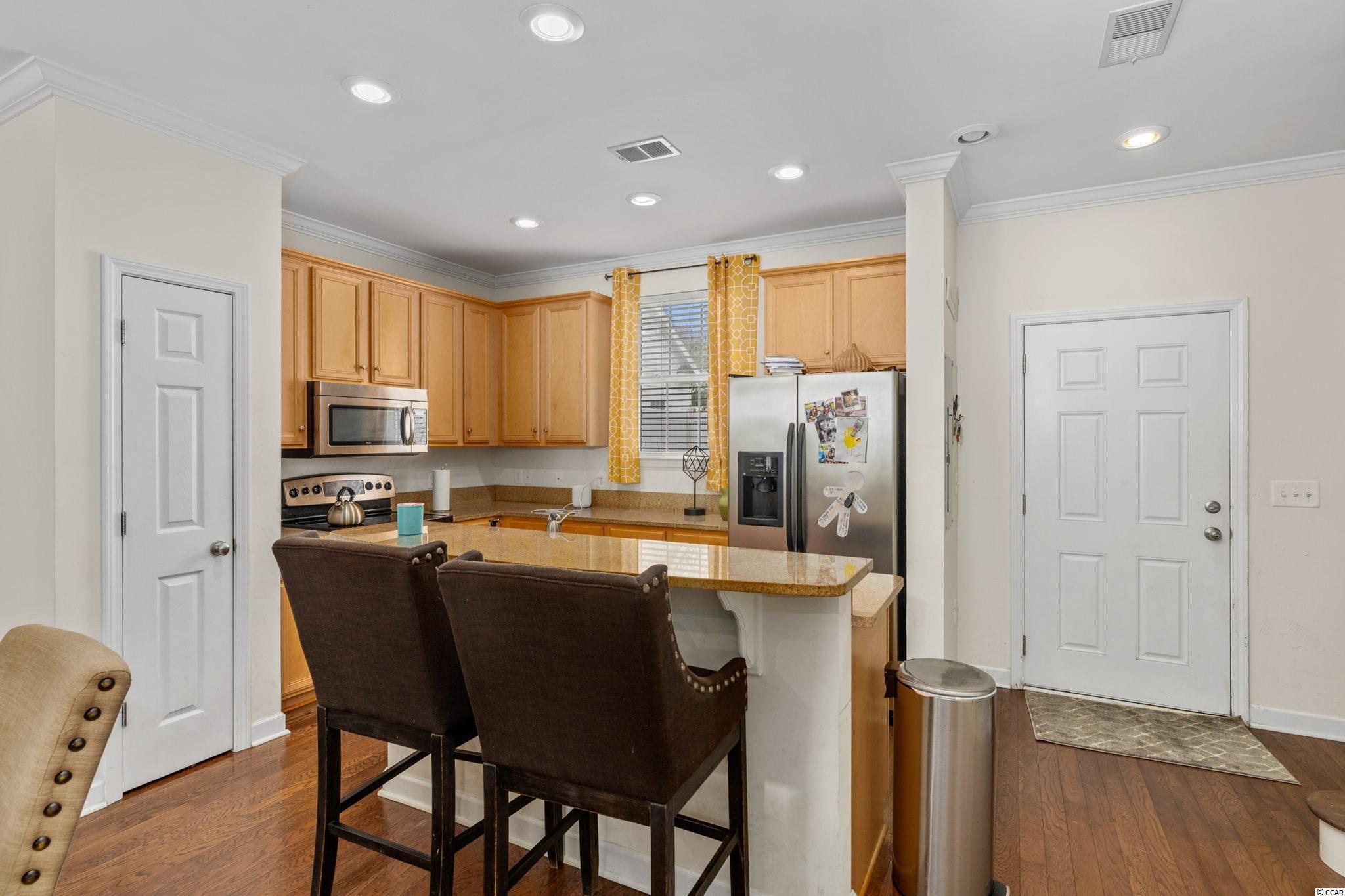 St James Square is a small-scale live/work community in an ideal location of Myrtle Beach. Conveniently located to shopping, grocery, medical, and THE BEACH. This 2 bedroom 2.5 bathroom brick townhome is an end unit. Inside you will find hardwood floors and granite countertops. The kitchen bolsters stainless steel appliances and a pantry. Powder room on the first floor allowing for a great entertaining opportunity. Upstairs you will find 2 split bedrooms; great for privacy. Another highlight of this property is the private 2 car garage. Schedule today if looking for primary/secondary home along the Grand Strand.