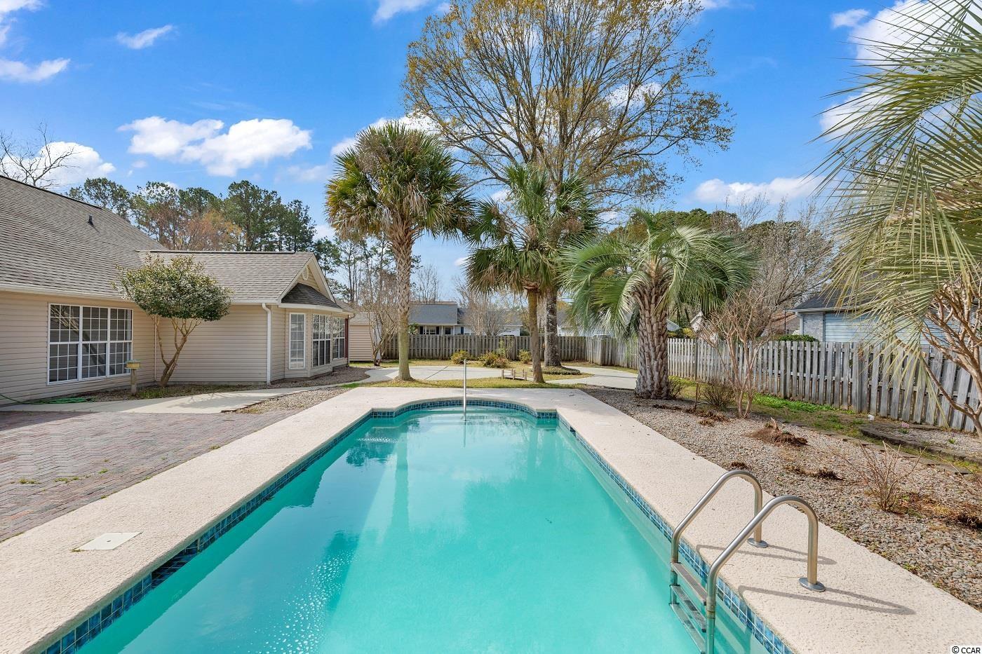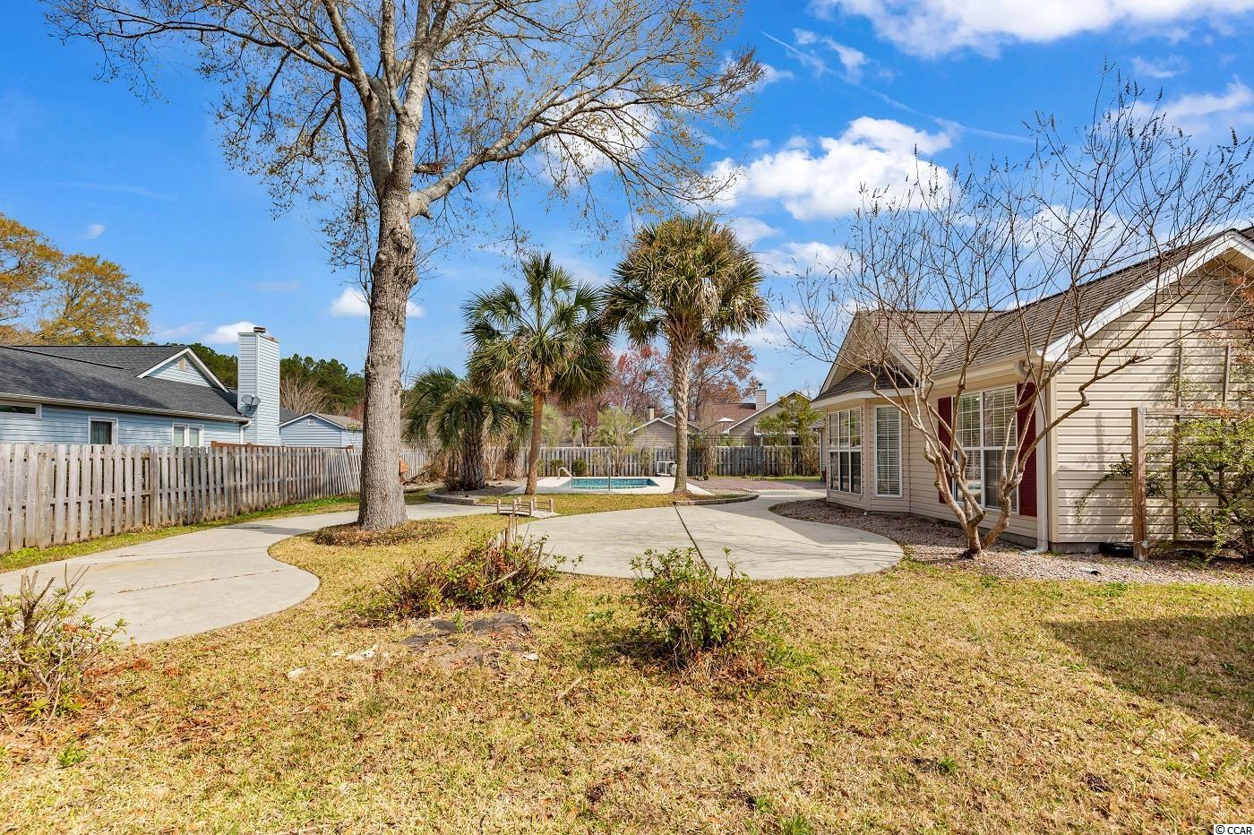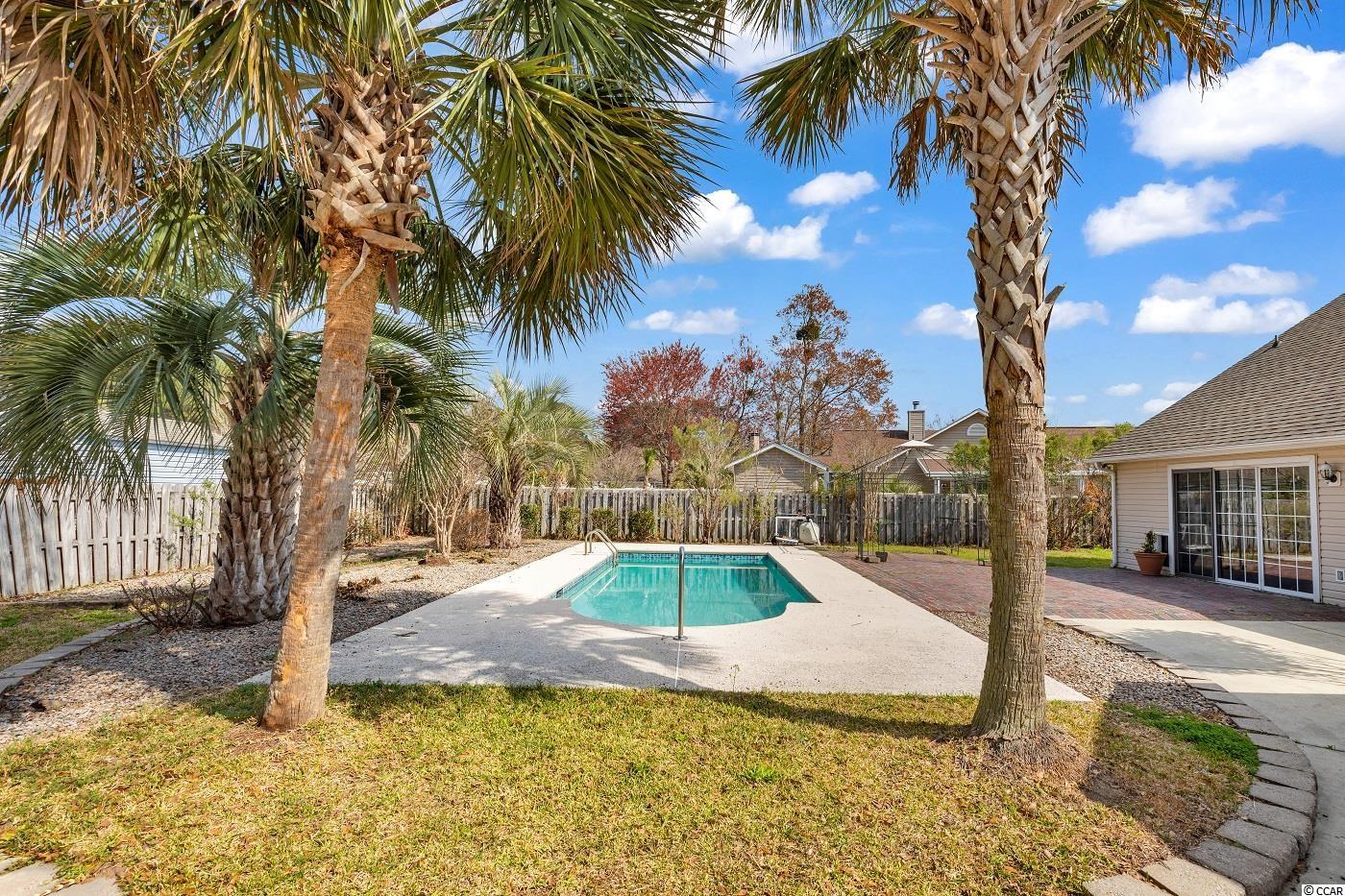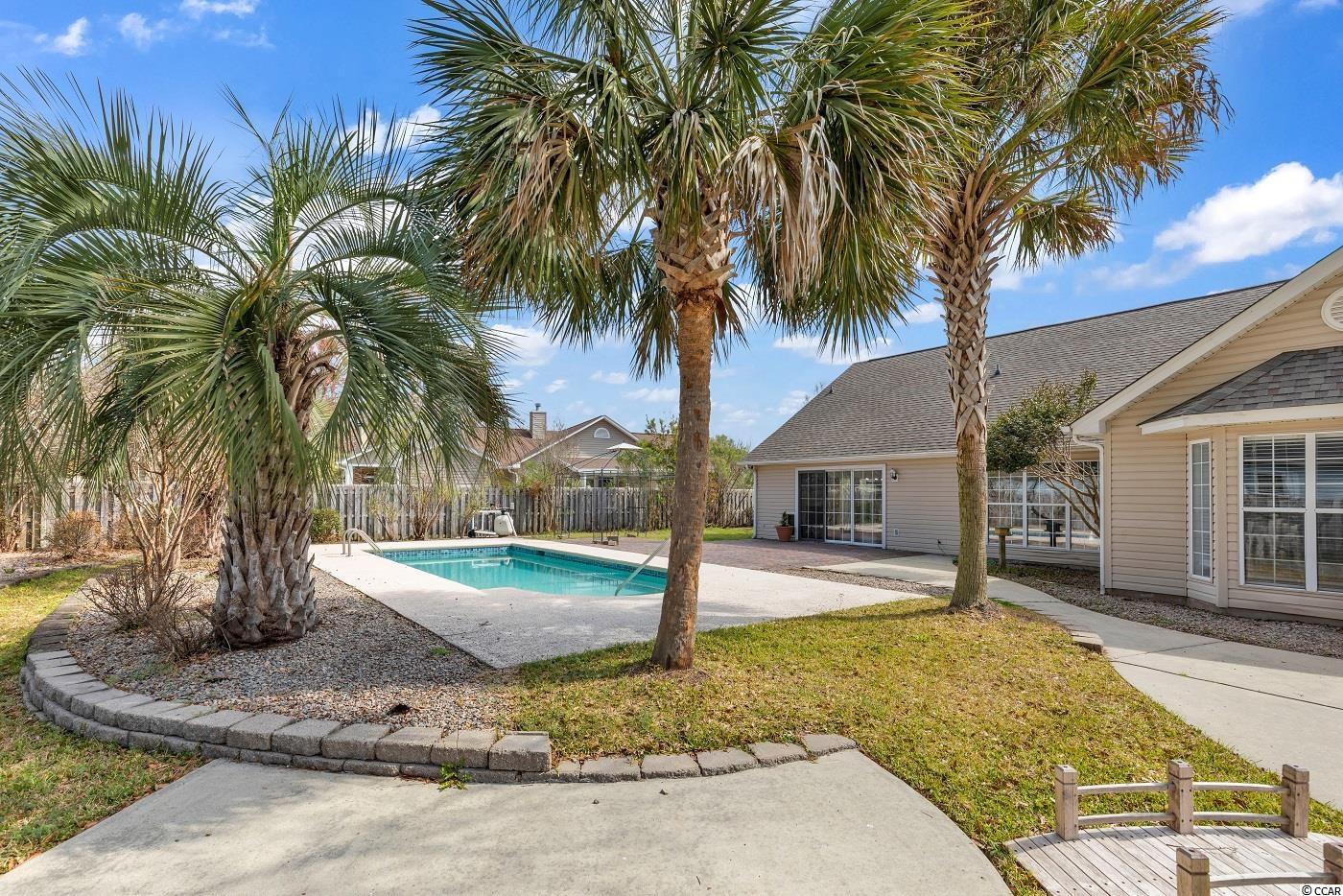 LARGE CORNER LOT, A well designed floor plan is apparent when you walk through the front door and are instantly greeted with lots of natural light, high ceilings and beautiful ceramic tile flooring. This home offers 4 bedrooms, 3 baths and a bonus room next to the master bedroom. This room could be used as a nursery, office and or a sitting room. The large kitchen is open to the family room with a vaulted ceiling and a cozy electric fireplace. The patio door opens up to the tastefully landscaped yard and the outdoor inground pool. This home is situated on approximately .23 acres, with mature trees, beautifully landscaped, offers a storage shed and is fenced, giving you a private oasis! Location is key and this beauty puts you minutes from all the shopping, dining and entertainment that the Beach offers., including Market Commons and the Beach. Put your feet in the Sand and Welcome Home! All measurements are approximate and are not guaranteed, buyers responsible for verification.