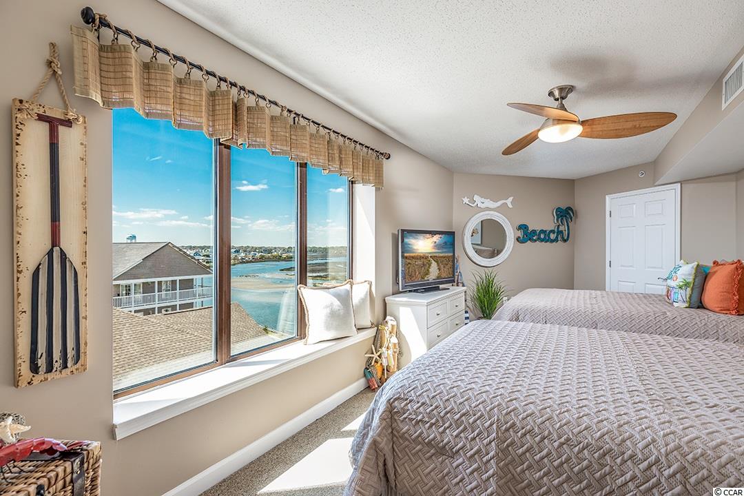 This three-bedroom, three bath oversized corner unit is indescribably furnished with striking views of both the Atlantic Ocean and the Cherry Grove Inlet Creek. Everything in the unit is new since December of 2020 excluding the hot water heater which is three years old. Ceiling fans, custom shades, stainless appliances, and designer furnishings give this condo a wow factor that is absolutely remarkable. Besides the outdoor balcony, you have the ocean views from the living and master bedroom areas as well. The balcony and second bedroom with an oversized viewing window both have ocean and creek views. All three bedrooms are oversized, and all have private baths. This is an absolute must see! Directly across the street, beachfront, is the large three-story amenity center which includes indoor/outdoor pools, a spa/hot tub, a fitness center, a game room with ping pong and foosball, and a private third floor exclusively for owners which includes a kitchenette, pool table, and flat screen TV. Cherry Grove, ocean view, creek view, oceanfront amenities, pier, golf carts, fishing, boating watersports, biking, sunbathing, seafoodlife is a beach!
