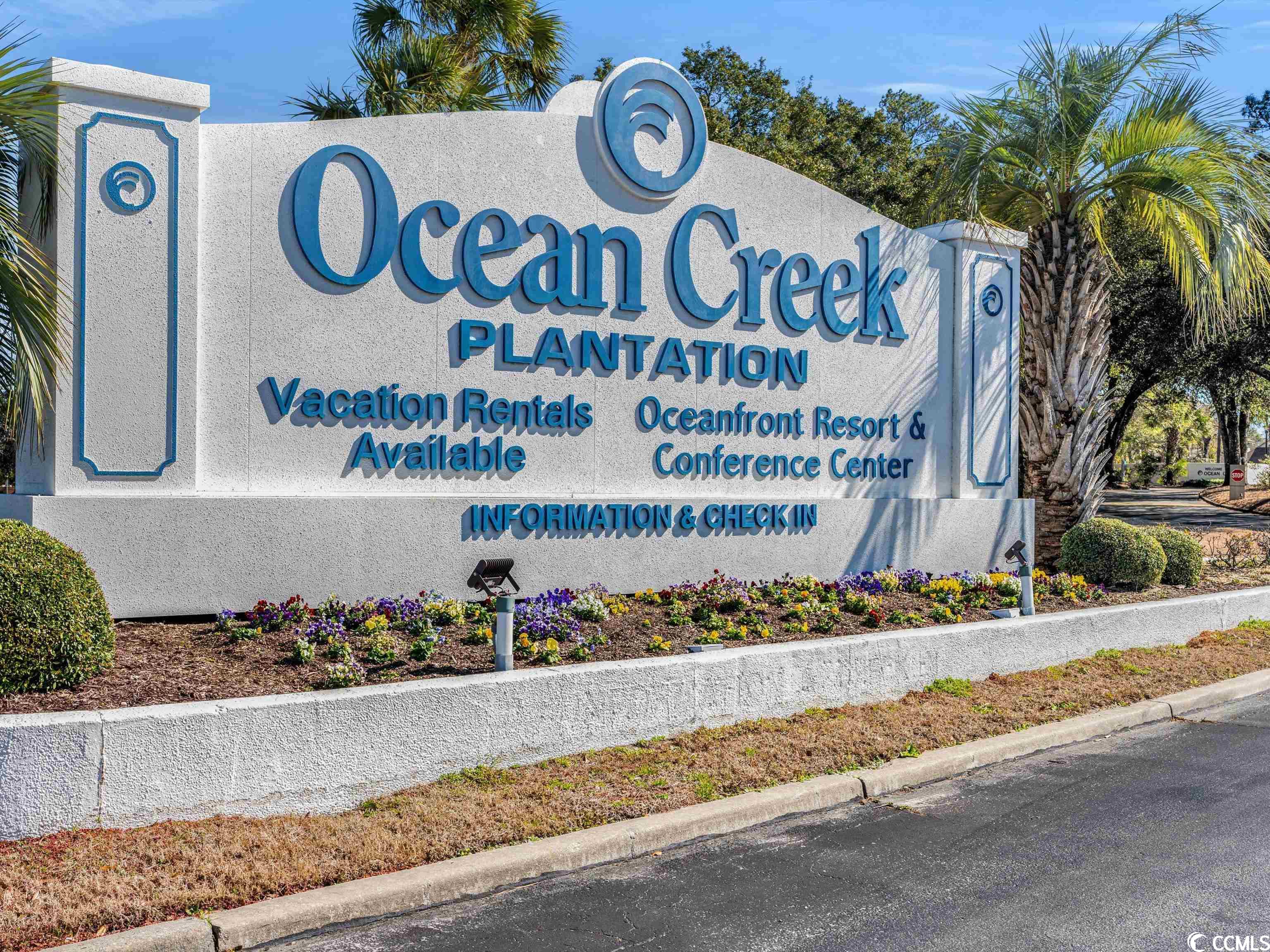 Ocean Creek is located on the north end of Myrtle Beach situated directly across from the south entrance to Barefoot Landing. Go directly to security gate and continue on Ocean Creek Dr, to Lodge 1 East which is on the right just past the restaurant.Courtesy of Leonard Call- Ocean Creek