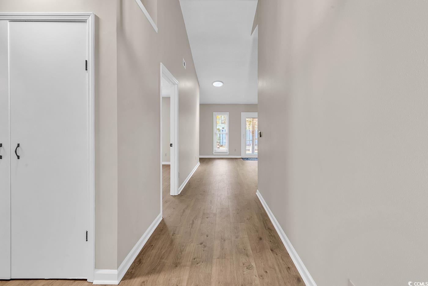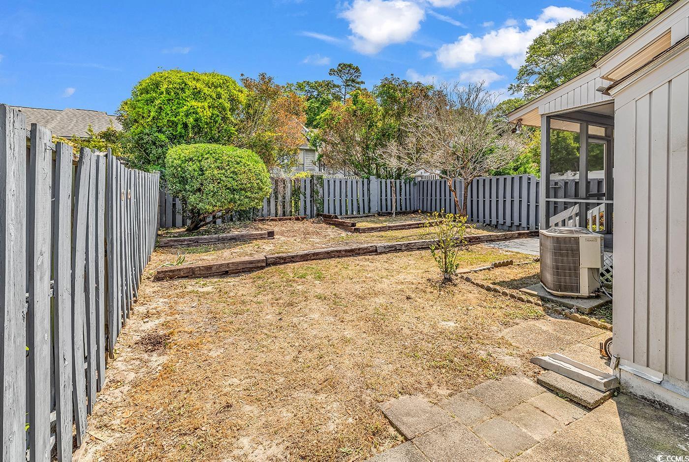 STUNNING UPDATES AND UPGRADES recently completed abound throughout this spacious 2 BR, 2 BA townhome that shows like a model and is conveniently located in Little River in a lovely community with NO HOA FEES! It is a true townhome, and you own the land. This exceptionally open and airy floor plan is complete with cathedral ceiling in living room and an easy flowing floor plan. Recent upgrades and updates include American Premium Oak planking throughout the home, new storm door, new painting in every room (Sherwin Williams accessible beige on walls), white closet doors and wood trim, all new ceiling fans and light fixtures, beautifully painted white kitchen cabinets, stunning new granite counter tops and stainless sink in kitchen, new double door stainless refrigerator, new closet door replacements in bedrooms. Very tasteful bathroom updates also include total vanity replacements and new step in shower stalls as well as new elongated high white toilets. New screening, flooring, and outdoor carpeting installed on spacious 8' x 15' screened porch. Inviting front door entrance to the home includes a lovely landscaped area to right of front door. Entering the foyer of this townhome, you'll find the coat closet and laundry area across from guest bedroom. Two closets in guest bedroom. Entering the living room from this hallway, the cathedral ceiling and wide open floor plan to spacious kitchen create an impressive living space. Sliding doors open to screened porch overlooking a sizeable yard area to enjoy. Primary bedroom is full of sunlight, offers two closets with ensuite primary bathroom and opens to the fenced backyard. Peaceful coastal lifestyle living is also conveniently found on the waterway only blocks away offering an abundant array of local restaurants overlooking the water, and the beach is only a short drive away. Don't miss out on this extraordinary townhome with stunning upgrades where pride of ownership awaits. Some of the interior photos showing furniture have been virtually staged with the furnishing to show potential furniture placement.