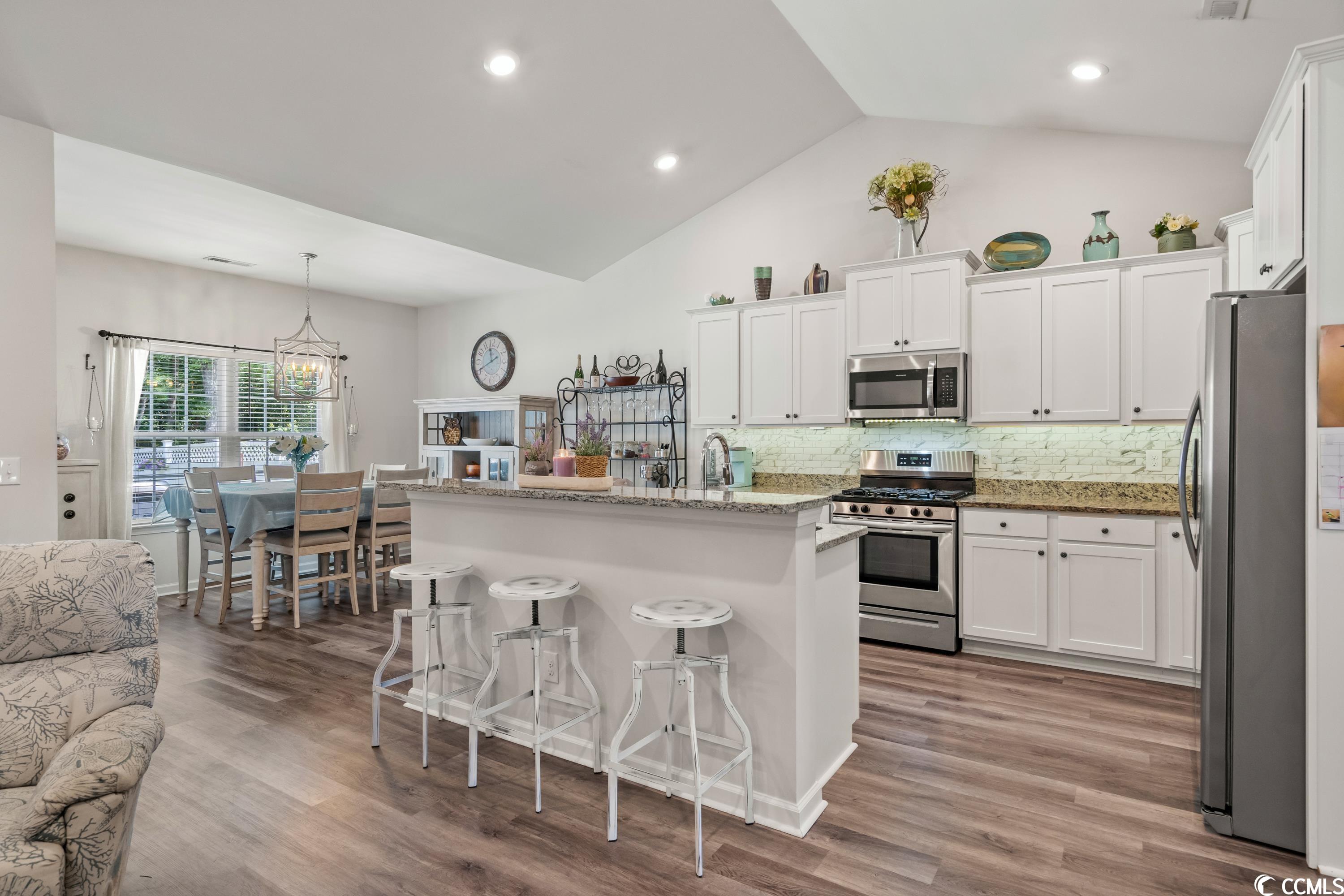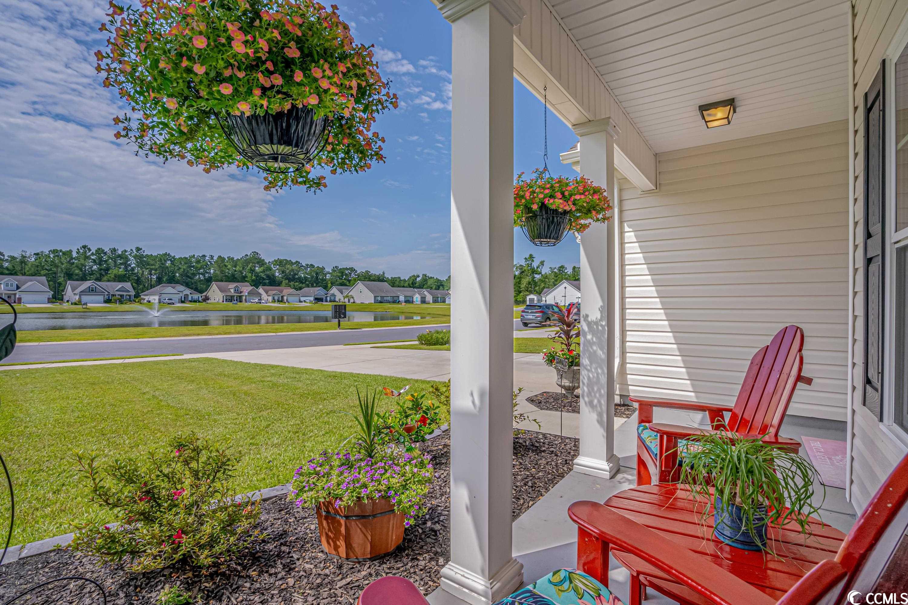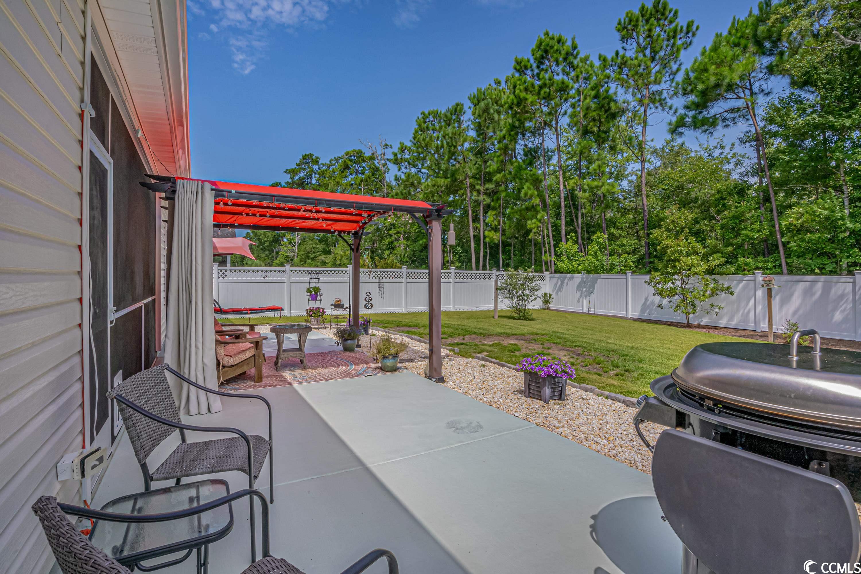 Looking for that open floor plan with privacy behind and in front of the home, look no further. This 3 bedroom 2 bath home has all you can ask for. It has a front porch overlooking the pond with fountain to the front and a screened in porch plus a pergola with extended patio on both sides backing to a wooded area. As you enter this home it opens up to a great room with vaulted ceilings and a kitchen with an island overlooking the family room. The dining area is to the back of the home leading to the screened in porch. The kitchen has granite countertops, stainless steel appliances, gas cooking, tile backsplash, under cabinet lighting, large single bowl stainless sink and staggered white cabinets. Off the kitchen to the front of the house you will find 2 storage closets, one for linens and one for pantry. There is a full bath with two bedrooms for privacy. On the left of the family room you will find a separate laundry room with two large closets for storage. Entering into the master suite you find space for a king size bed and a tray ceiling. As you enter the master bath you will walk through double doors leading to an oversized vanity arrangement with his and her 40"" vanities stepping down between to a makeup vanity table with mirror. To the right is a large walk-in closet with double racks. This bath has a 5' shower with 2 seats. The family room has LED puck lights and a ceiling fan with a decorative shelf with lighting. Vinyl plank flooring is in all areas of the home except bedroom 3 has carpet. the two car garage has pull down stairs for storage over the garage. The yard is meticulously maintained with a fully fenced rear yard, full yard irrigation that is wi-fi enabled, termite traps, weather station, a pergola with lights, two extensions to the patio for grilling and relaxing in the sun. The beds have been landscaped with stone and the rear patio. Gutters have been added. There is a ring security system on the doors and windows. And most importantly a Generac Guardian 18,000 watt standby generator has been added to the home so in an event there is a power outage your home will be fully functional. This is a natural gas community. Barons Bluff North Has a swimming pool and park style bench around the ponds for your entertainment. This home is ready for your enjoyment!