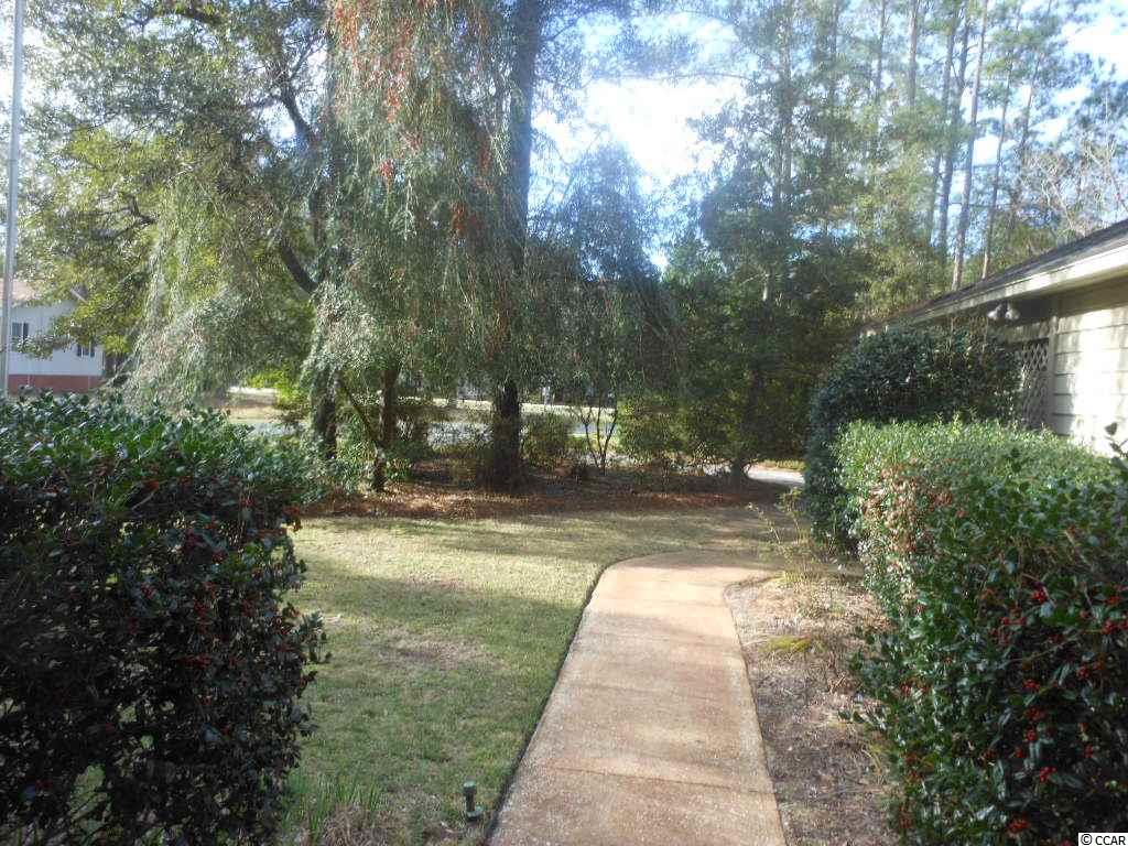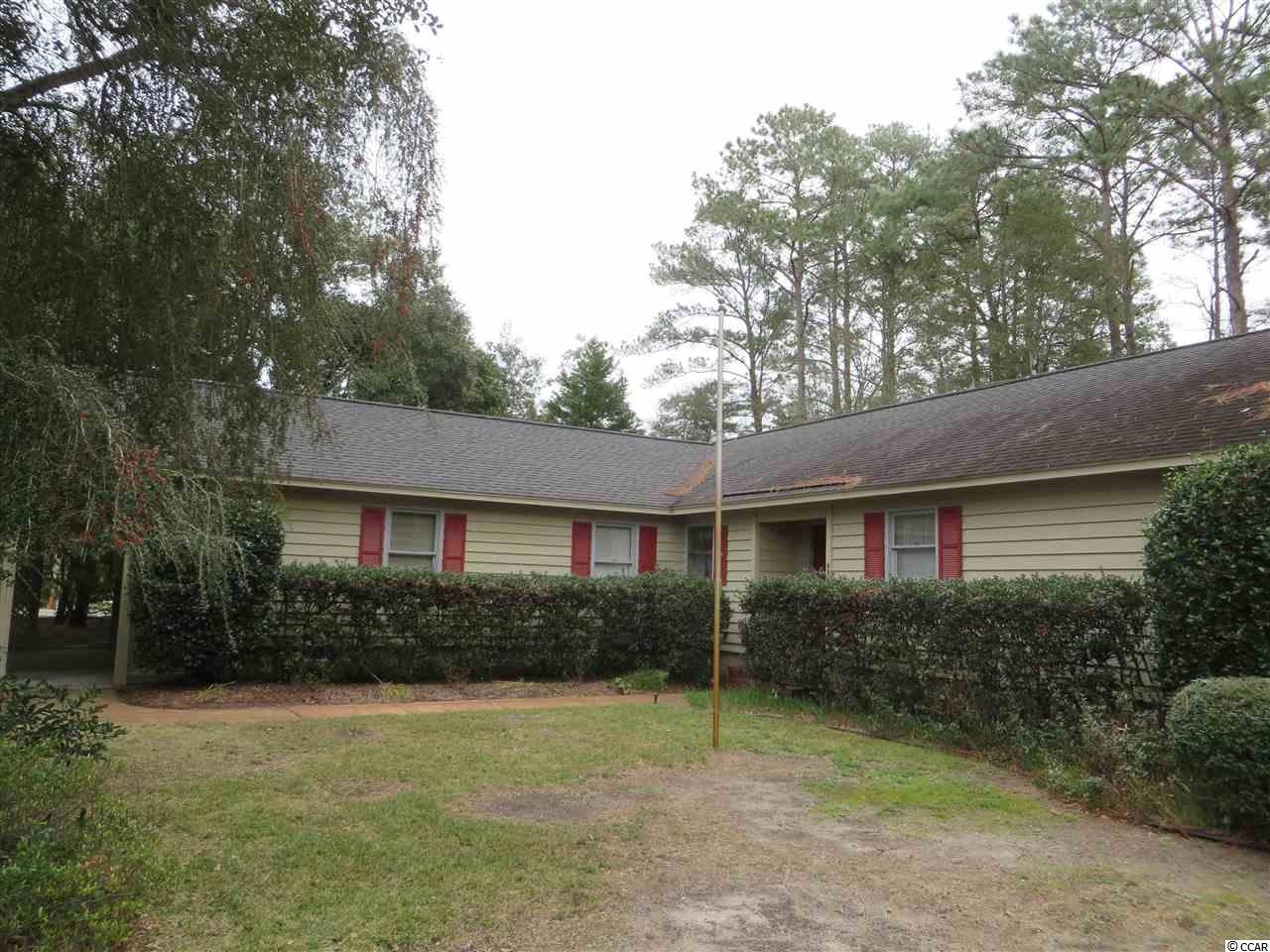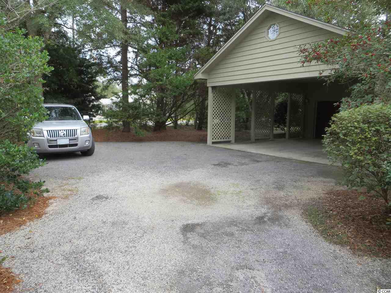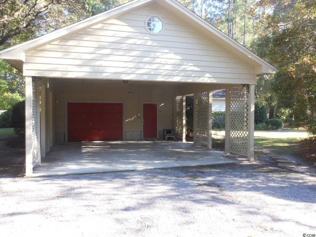 One owner home in Hagley Estates community. Surrounded by trees and mature shrubbery. Flowering bushes and pine trees buffer home from green and streets. Foyer entry with closet, slate floor. Open, split plan with larger Master, walk in closet. Slider to deck. Stone gas fireplace & hearth. 2 bedrooms and bath on opposite side of home off kitchen. 12 x 23 Carolina room also leads to deck. Ceiling fangs. Gas connection for gas grill on deck. Open kitchen with window, counter space and cabinets. Storage above both garage & carport. 1.5 car attached garage used as work shop by previous owner, has wall heat/air wall unit. 22 x 23 carport. Room for small boat inside or out. Detached storage building as well. It's 1 mile to the Hagley boat landing. Convenient to shopping on Highway 17