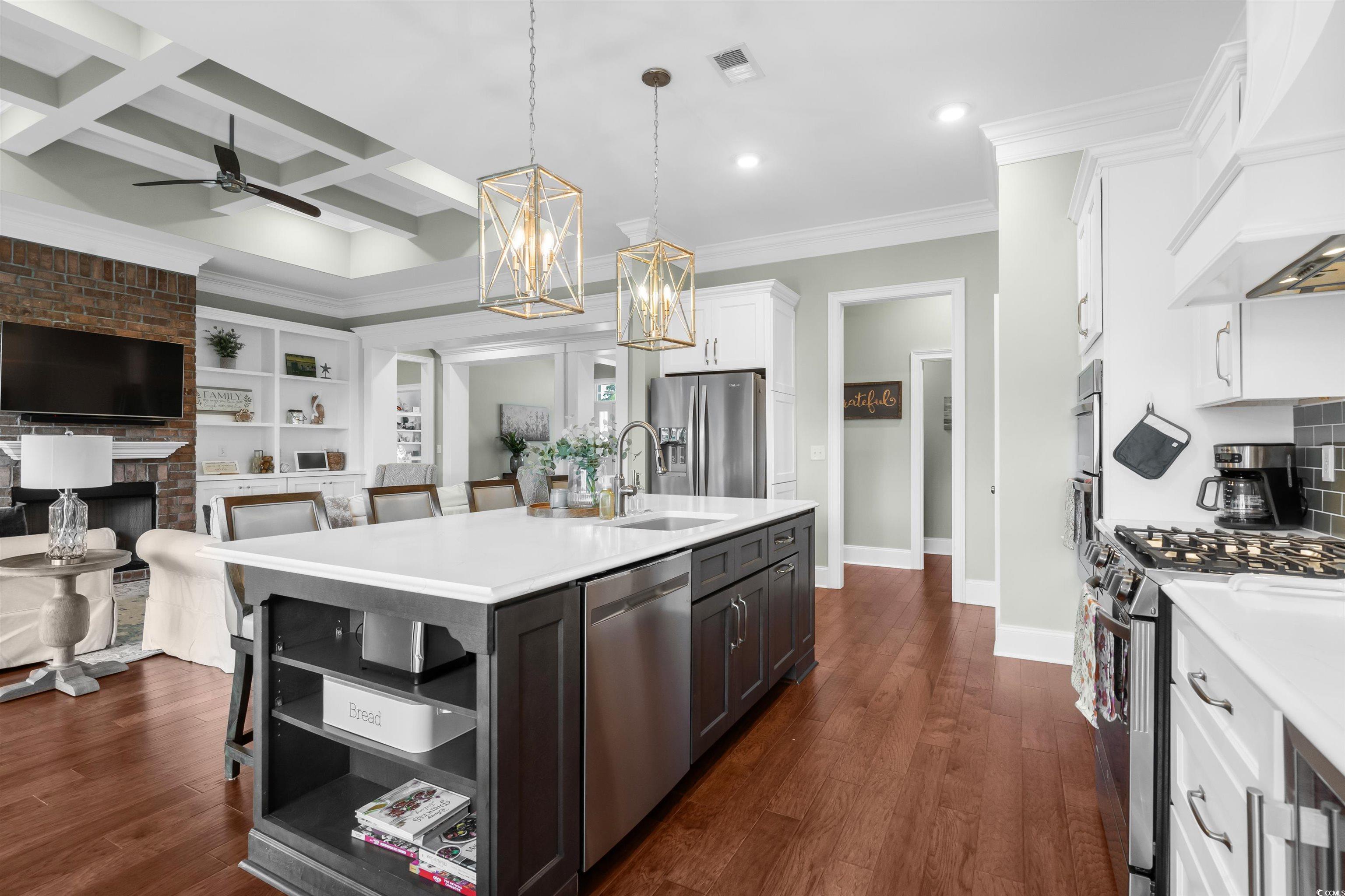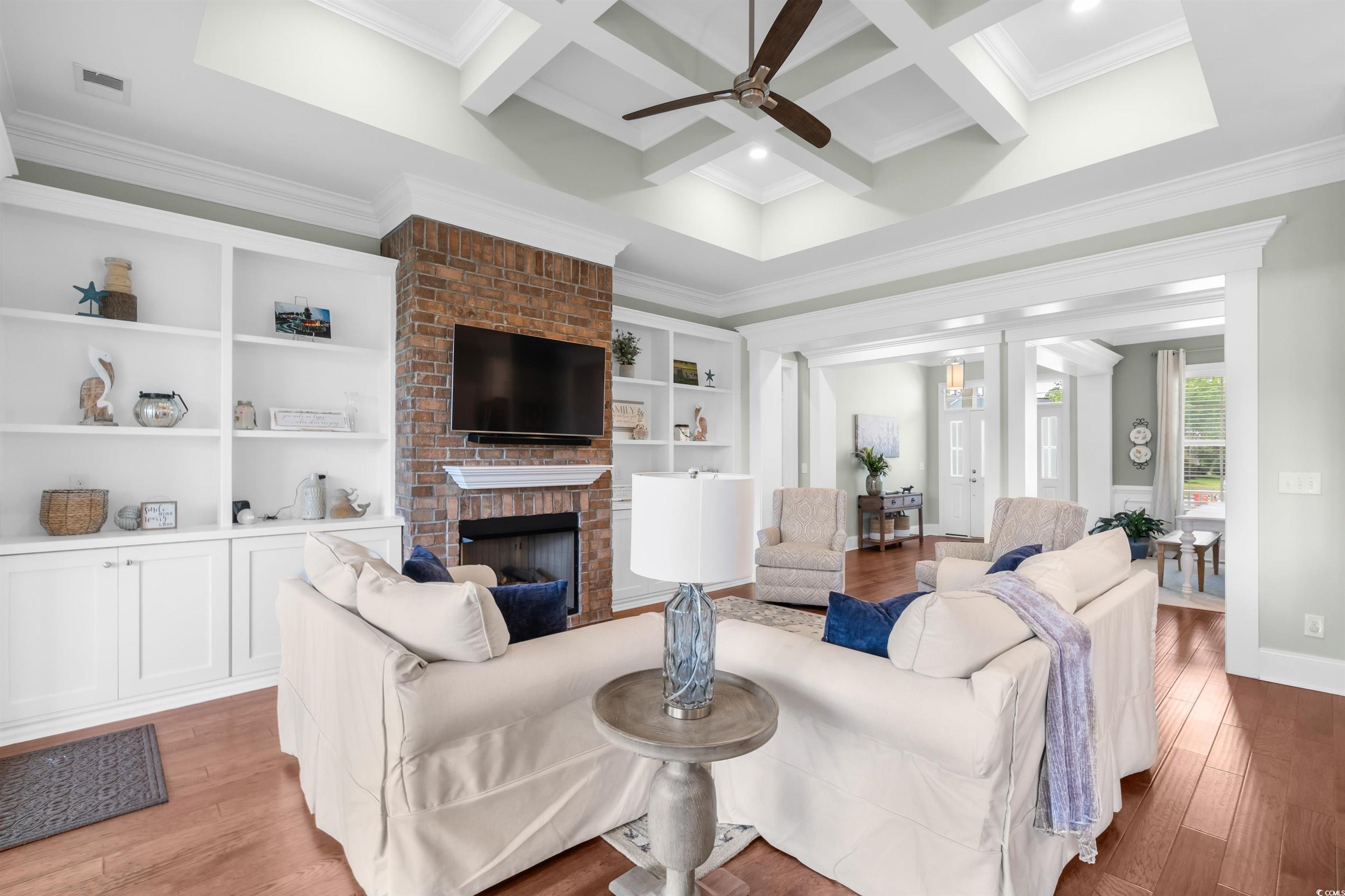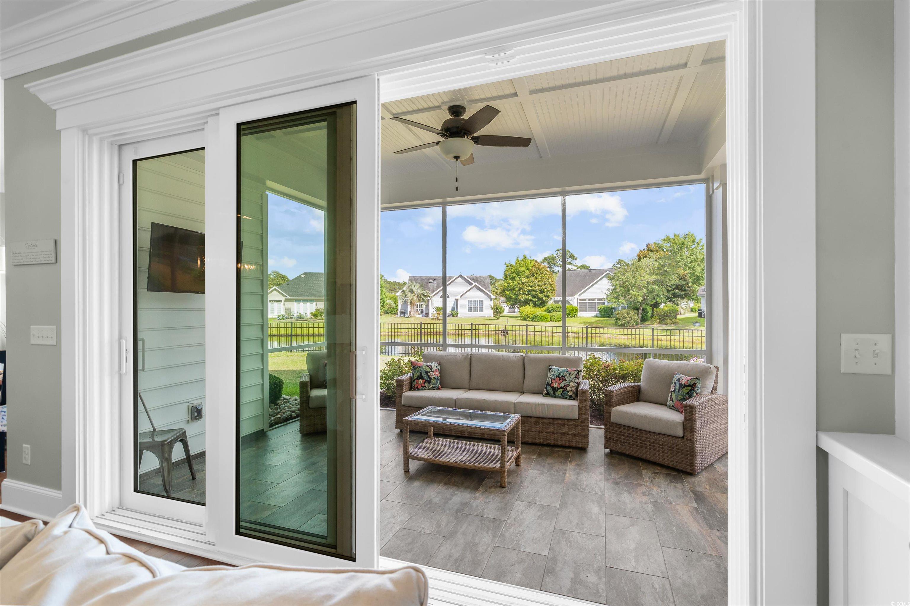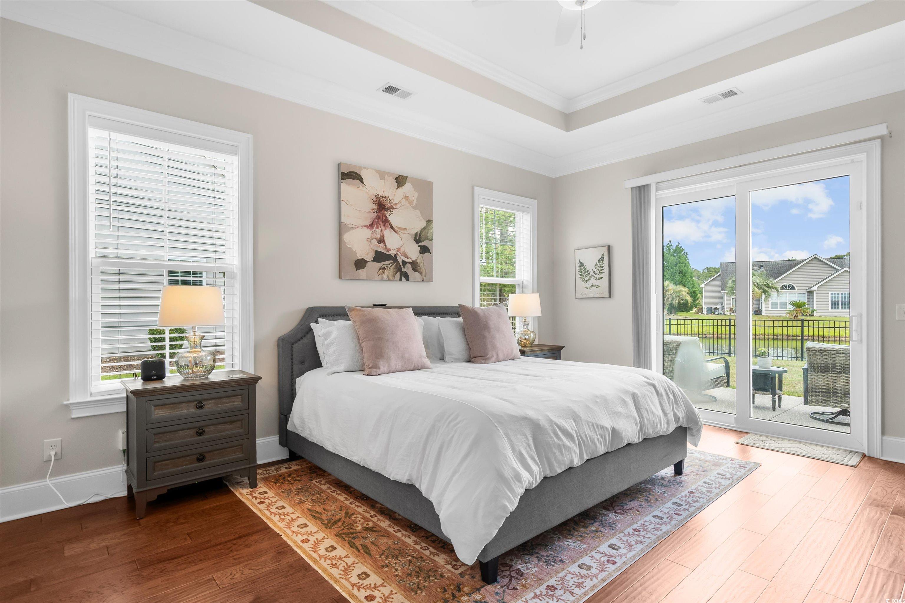 You cant ignore the curb appeal of this one of a kind CUSTOM built better than new home in Waterford Plantation. Home is on a cul-de-sac featuring spacious brick front covered porch, carriage style side car garage, professionally landscaped yard with river rock and slate borders along with an abundance of trees and shrubs. The driveway allows for ample parking off the street and features tabby concrete driveway adding Southern charm and character to this lovely home. This immaculate open floor plan has many details to list with wood floors throughout, crown molding, wide base moldings, coffered ceiling in living room, brick fireplace, built in wall units with storage, a massive attic for more storage, 9ft. sliding glass doors leading to screened in Carolina Room with a gorgeous slate floor leading out to the covered patio with pavers, summer kitchen, fenced in backyard overlooking the lake in the backyard. The interior kitchen is a chefs dream featuring large dining area, white cabinets, inviting large center island in a warm gray/brown cabinet featuring additional storage and accommodates seating for 4, premium upgraded quartz countertops, subway tile backsplash, stainless steel gas burning stove and wall oven, pantry, designer lighting that elevate the kitchen to another level to make this kitchen a dream to entertain and enjoy with family and friends. Master Suite with tray ceiling, crown molding, slider doors to walk out and enjoy coffee on additional back patio overlooking lake, double sink vanities, water closet, large tile shower, walk in custom designed closet. Two additional 1st floor bedrooms feature wood floors, crown molding and ceiling fans. Hall bathroom features a large tub and tiled shower walls and floor. The laundry room/mud room can be accessed through a second entry door on the front porch leading to the garage. Some features include porcelain tile floor, sink with granite countertops, washer and dryer, large closet and a built-in stop and drop rack for storing and organization. From this room is the entrance door that leads upstairs to a large bonus room featuring a full size bathroom. Also upstairs you will be amazed at the EXTRA LARGE storage rooms featuring shelves allowing for personal items to be easily accessible in the home at any time. The painted oversized two car garage has epoxy painted floors, painted walls, trimmed casement windows, additional large storage closet and additional cabinets. You will appreciate the convenient location of Waterford Plantation to the beach, shopping, hospitals, dining, golf course and airport. Waterford Plantation is a beautiful community with plenty of mature trees, sidewalks, amenity center, pool, gym, playground, tennis court, pickleball, nature trail and it backs up to the Man O War and Wizard golf courses.