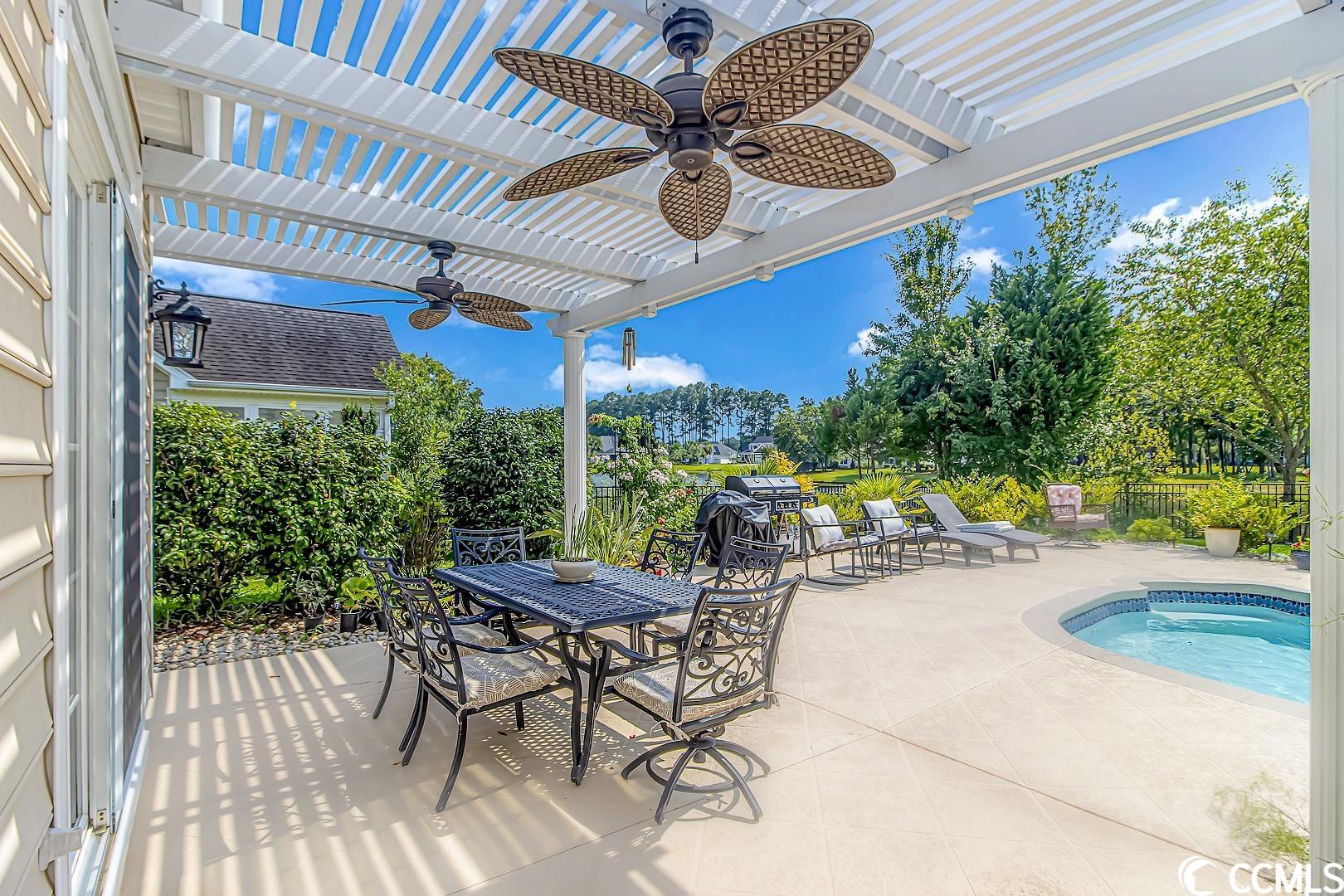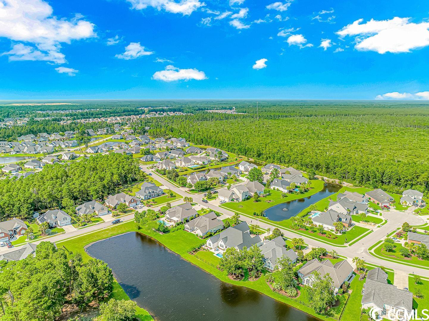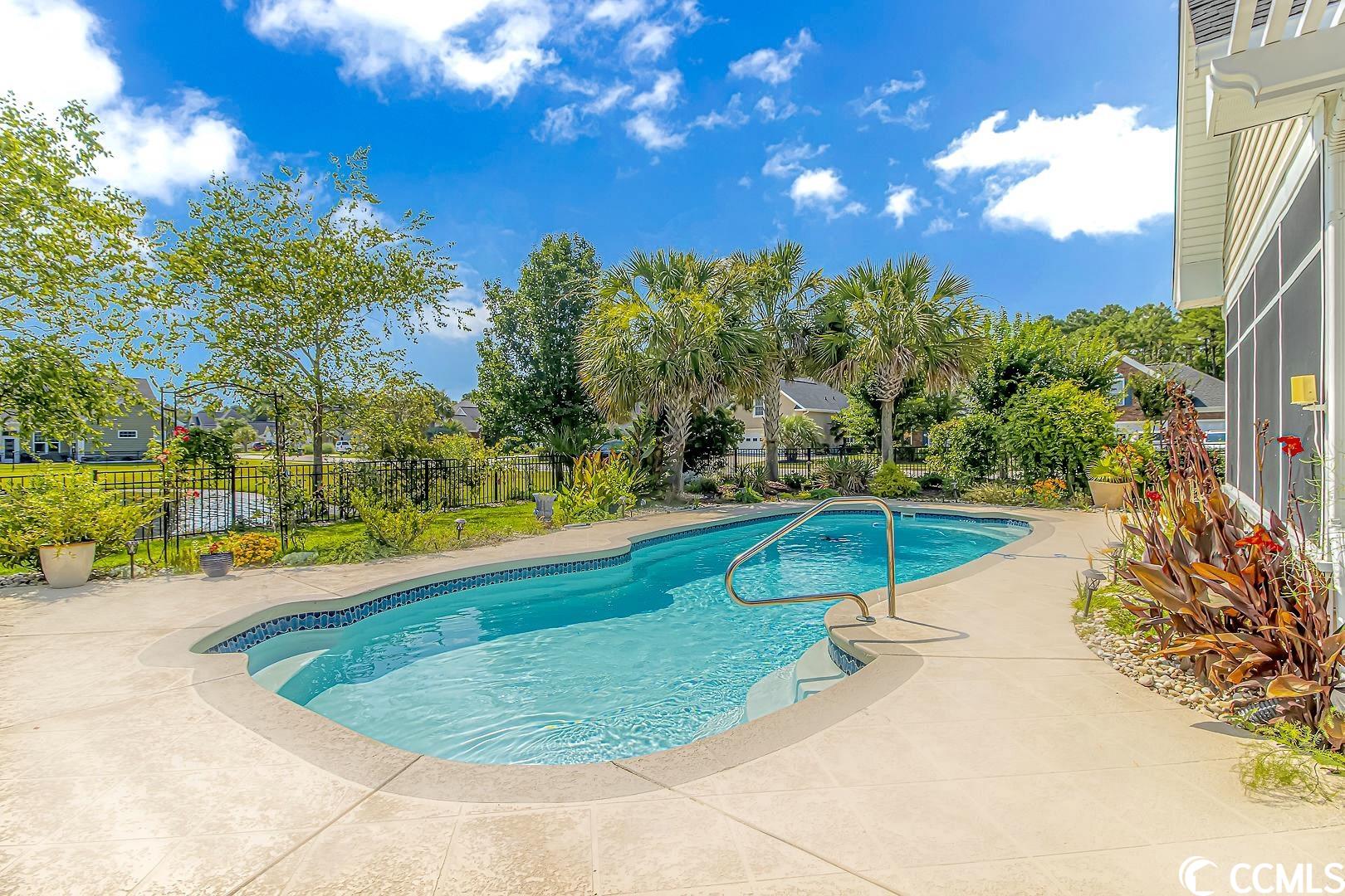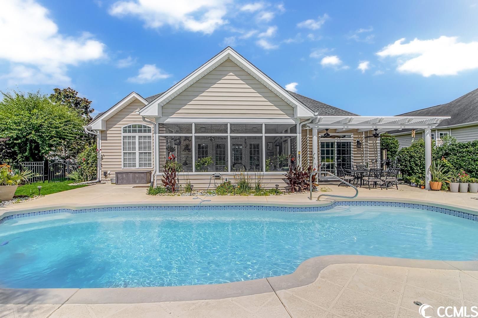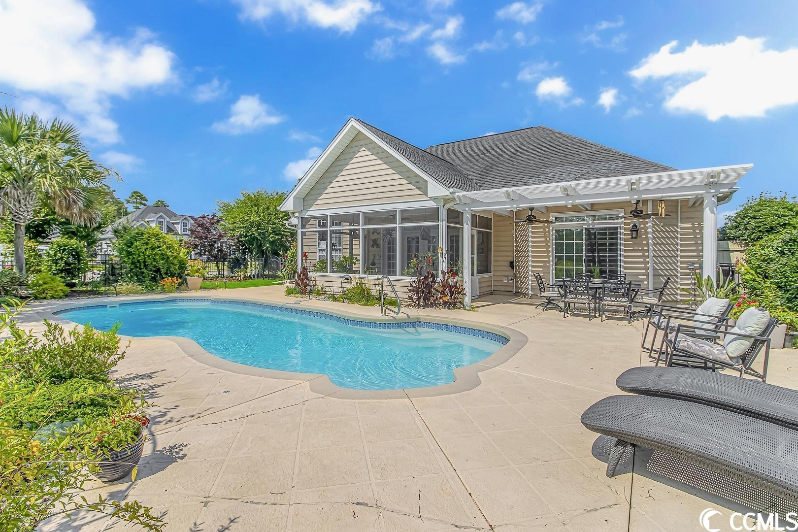 An Outside Oasis with backyard Paradise!!! Absolutely beautiful custom home with 4 bedrooms, 3.5 bath and a 3-car garage. This well appointed, peaceful home is a must see and placed on a corner lot over looking the water. Generous sized kitchen in the center of the home, created for entertaining. Serine master bedroom has a gorgeous walk-in closet with built in cherry cabinetry and is located on the first-floor. The master bath is built for relaxation with a garden tub, a separate shower, and double sinks. Move the party outside by going through the patio located off the family room. The outside is an oasis for anyone. Sit around or play in the saltwater pool and fountains after enjoying a meal under the shaded pergola or screened porch. Fans in every room inside and out to keep the air just right with a dual zone system. Enjoy your music throughout the home with the built in sound system. Sidewalks, stocked ponds, community pool, gym, basketball courts, tennis courts, bocce ball, and adjacent to golf course. Carolina Forest is the place to be with the beach and airport only 20 minutes away. Shopping, dining, community pool, and entertainment all within reach by golf cart. Just minutes to the beach!
