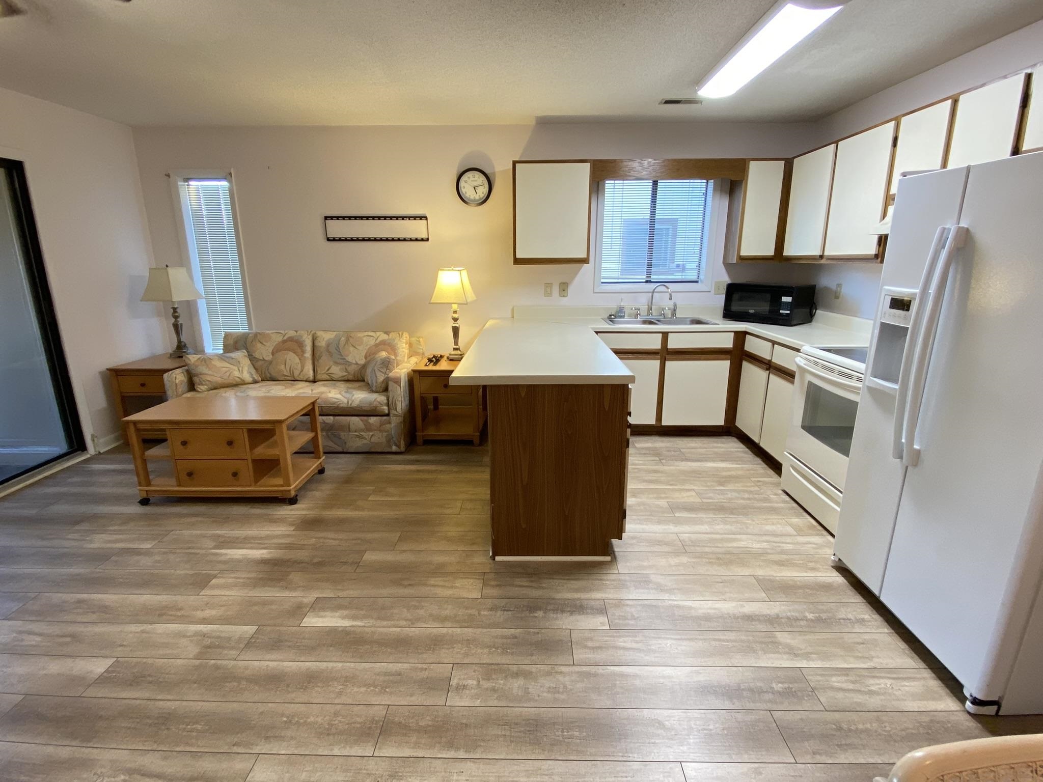 1st floor end unit with extra side window. Very nice condition. New vinyl plank flooring, water heater new in 2022, washer new in 2021, refrigerator and dryer new in 2018. Furniture seen in pictures is included with the sale. You'll enjoy the community pool. Ideal for vacation home or potential investment. Both short and long-term rentals are permitted. It's easy to see, so check it out. Square footage is approximate and not guaranteed. Buyers responsible for verification.