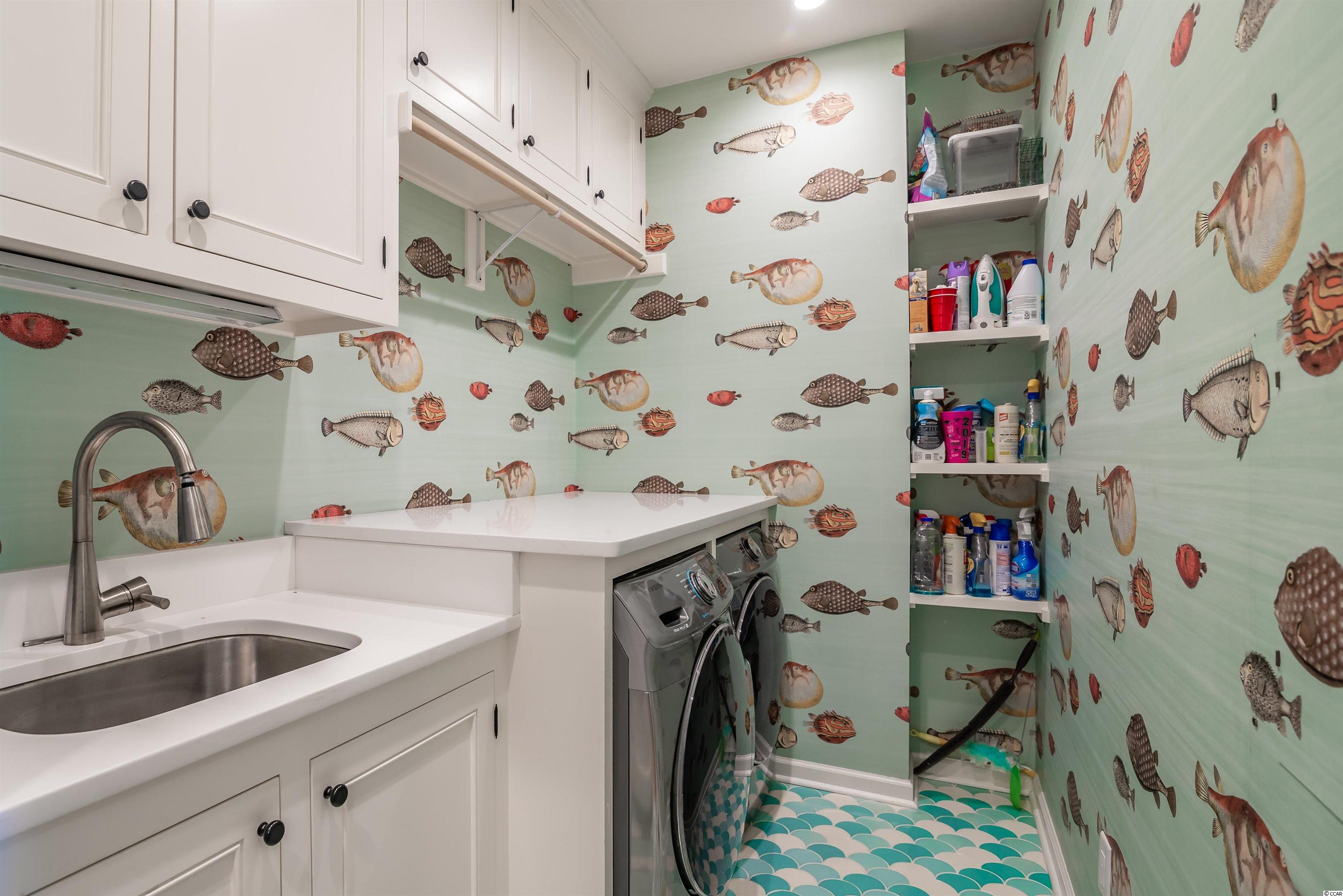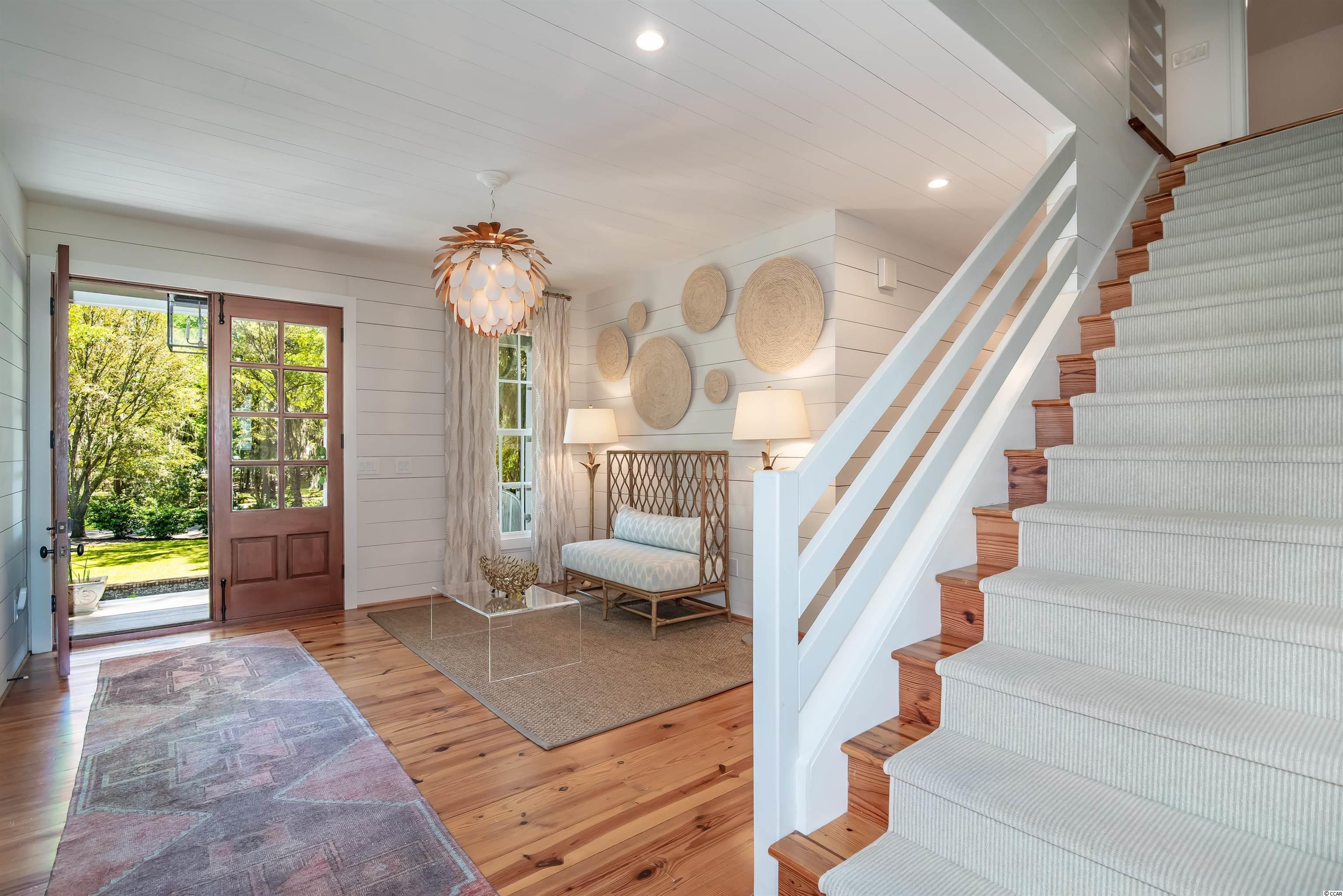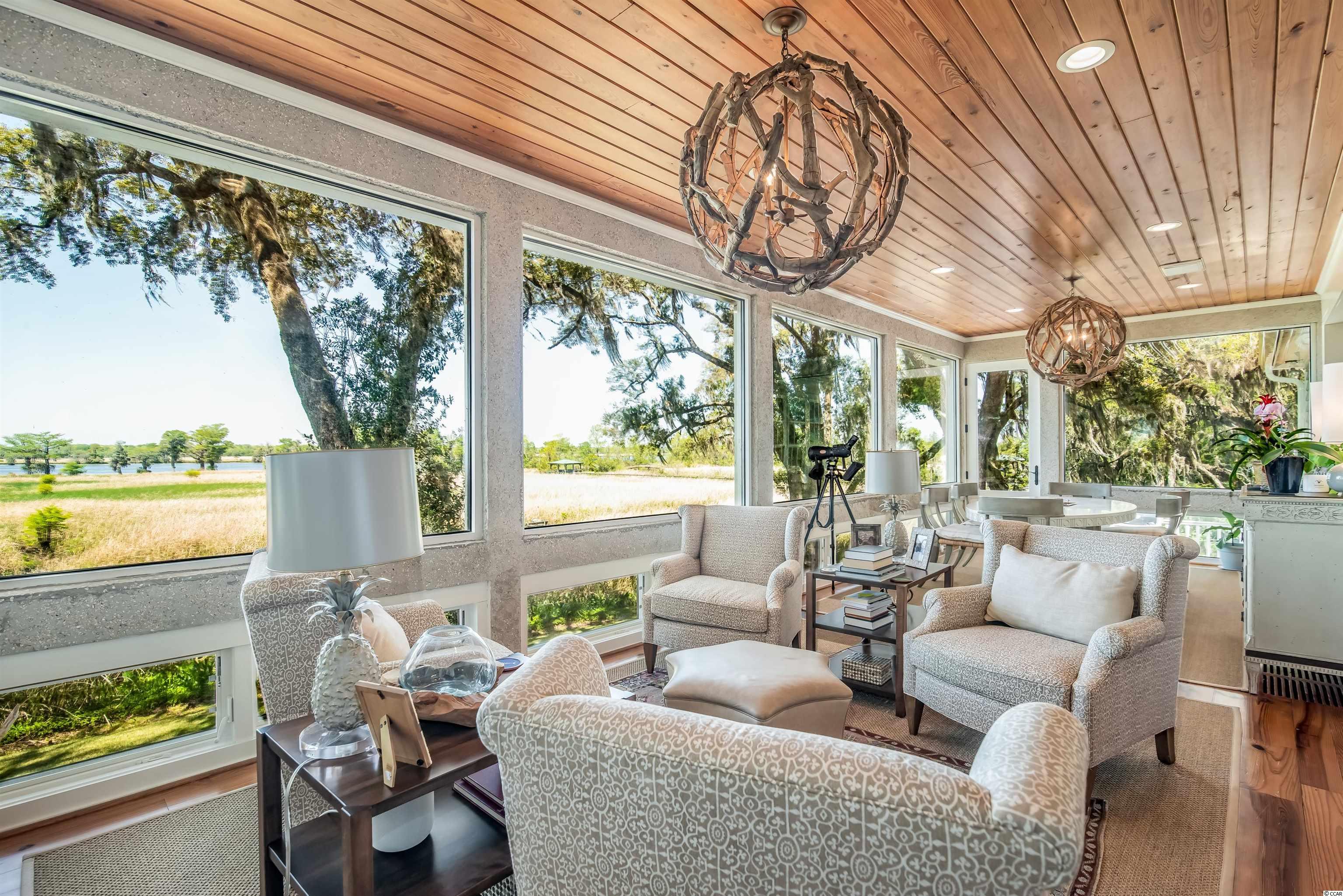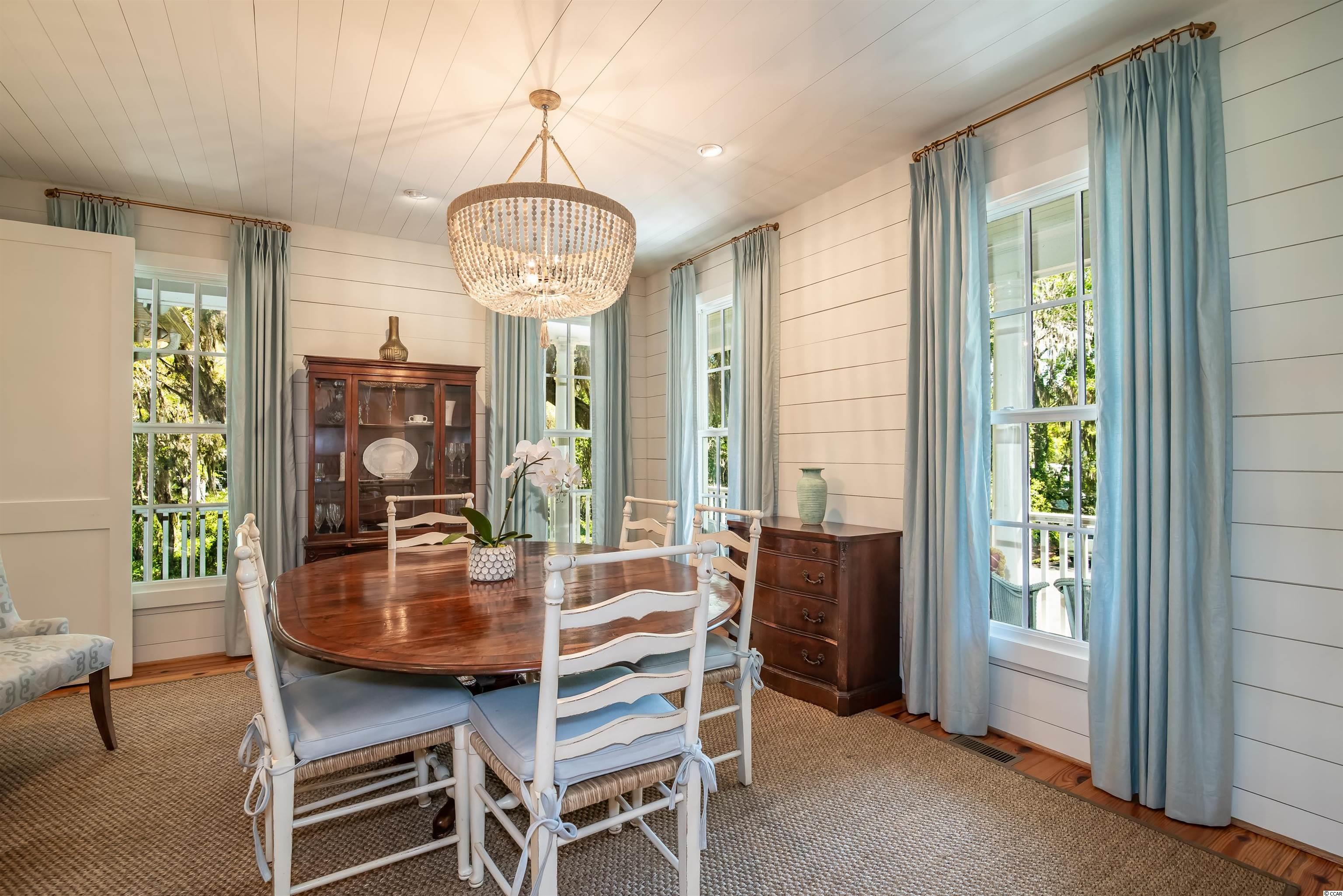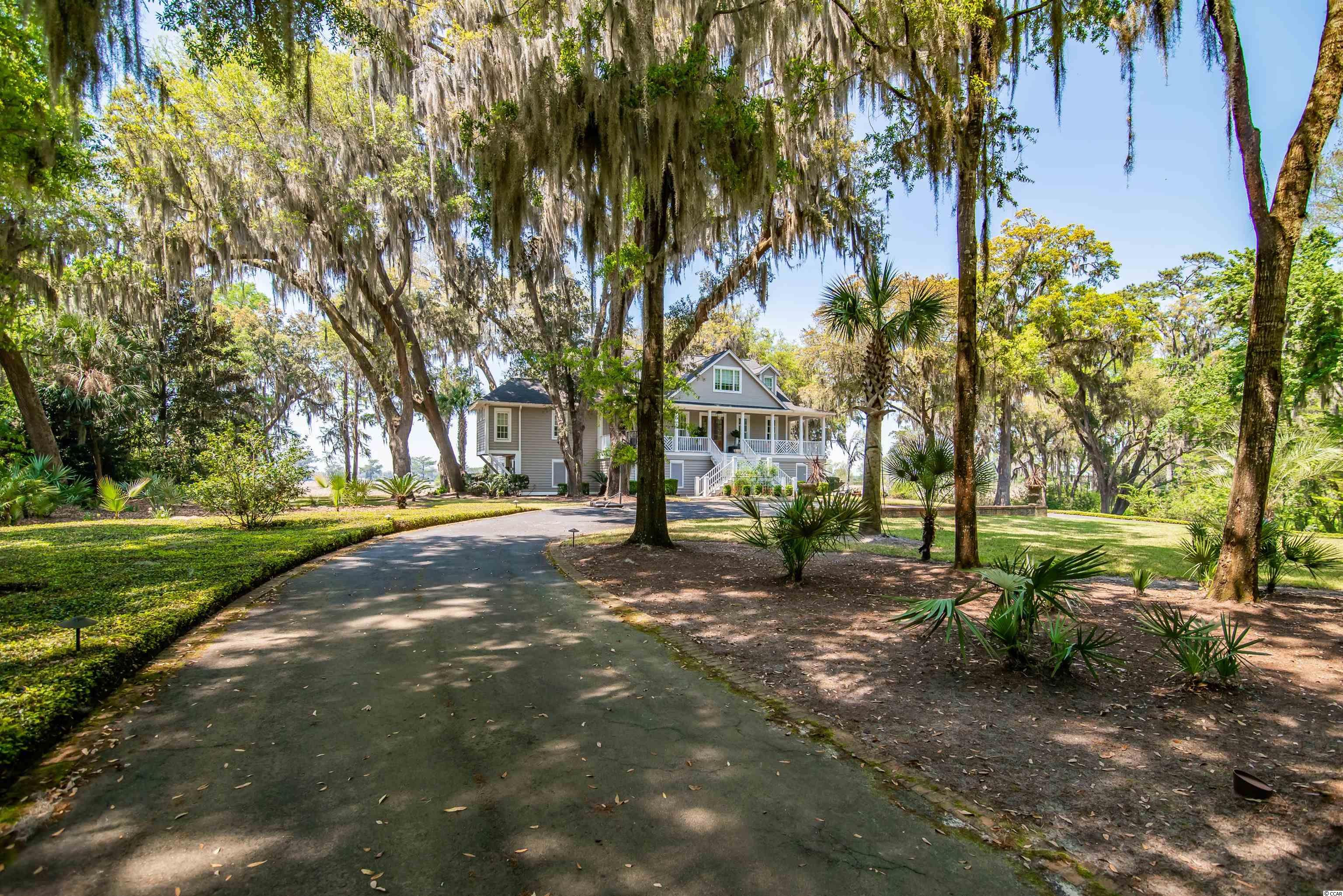 Amazing views of historic ricefields out to the Intracoastal Waterway/Waccamaw River from this beautiful lowcountry home on 8.6 acres in River Oaks of Pawleys Island. Recently updated and has a private creek dock leading out to the river! The back of the home has floor to ceiling windows to ensure you never miss a majestic sunset. This charming estate home is adorned with moss draped live oaks and a private back yard with dock leading out for a day on the boat in the Intracoastal Waterway. Enter into the foyer from the large front porch and look straight out to the beautiful Waccamaw River. Heart pine flooring throughout the main level and shiplap walls provide warmth and character in this relaxing home. No details were spared in this updated home! Enjoy a cool drink with family and friends in the bright and spacious sunroom while watching the boats go up and down the waterway. The gracious kitchen features double oven, gas range, 2 sinks, 2 dishwashers, stainless steel appliances (Subzero refrigerator and Wolf cooktop), granite and stainless counter tops and more! Large master suite has double glass doors that open unto a large screen porch and has his and her bathroom areas with separate water closets, free standing tub and large walk in shower! The upstairs has three bedrooms, two bathrooms and a bonus room area that would be a perfect office or playroom! Need a mother-in-law or guest suite? On the bottom floor is a full apartment complete with a kitchen, living room, bedroom, laundry and bathroom...completely updated! Downstairs is a separate & private home office with views out to the waterway. Other features to be sure not to overlook include an elevator, automatic roll up screen on sunroom windows, outdoor firepit and more! The landscaping is impeccably maintained and full of beautiful old live oaks! Enjoy riverfront living at its finest in this move in ready estate!