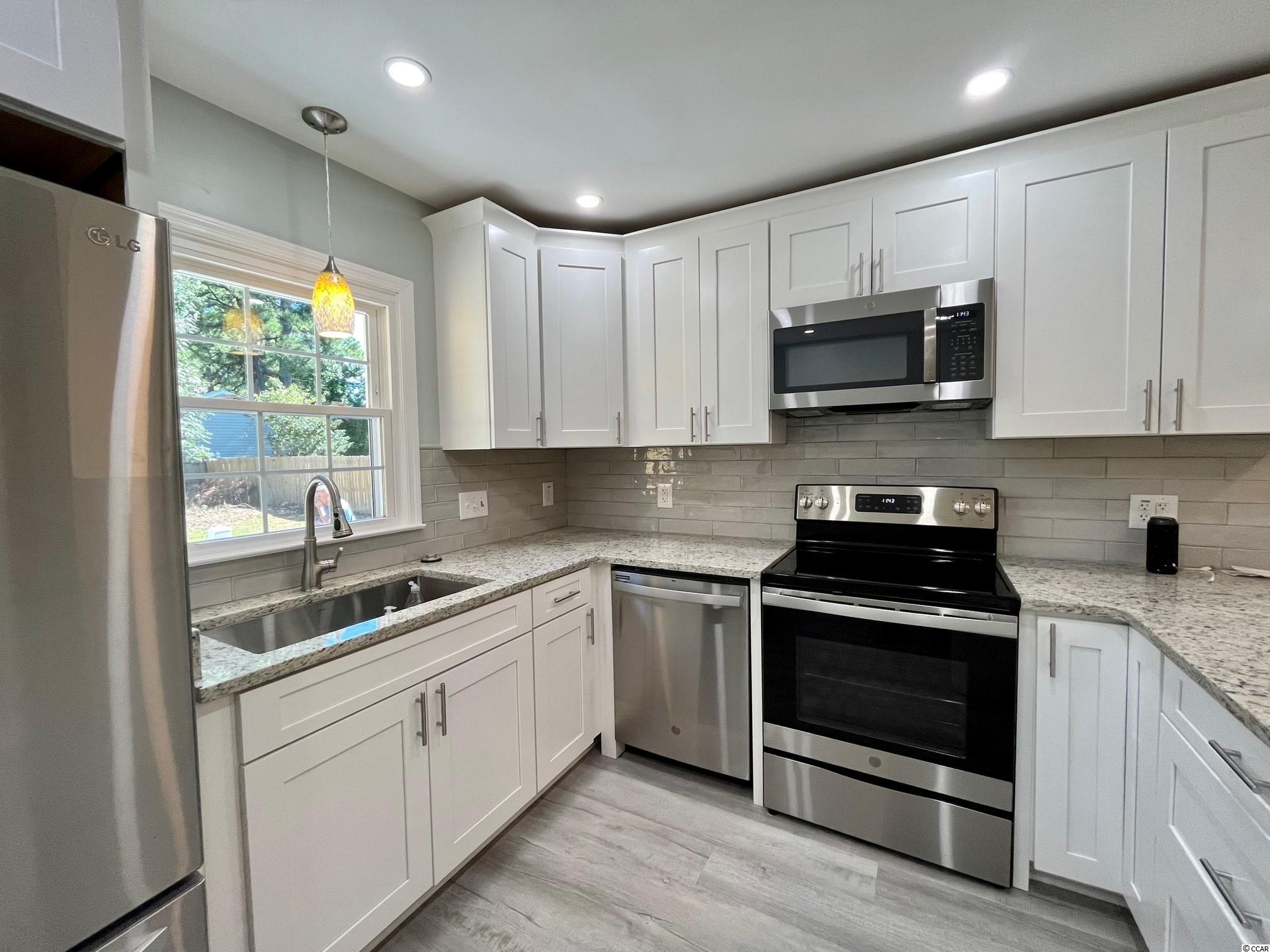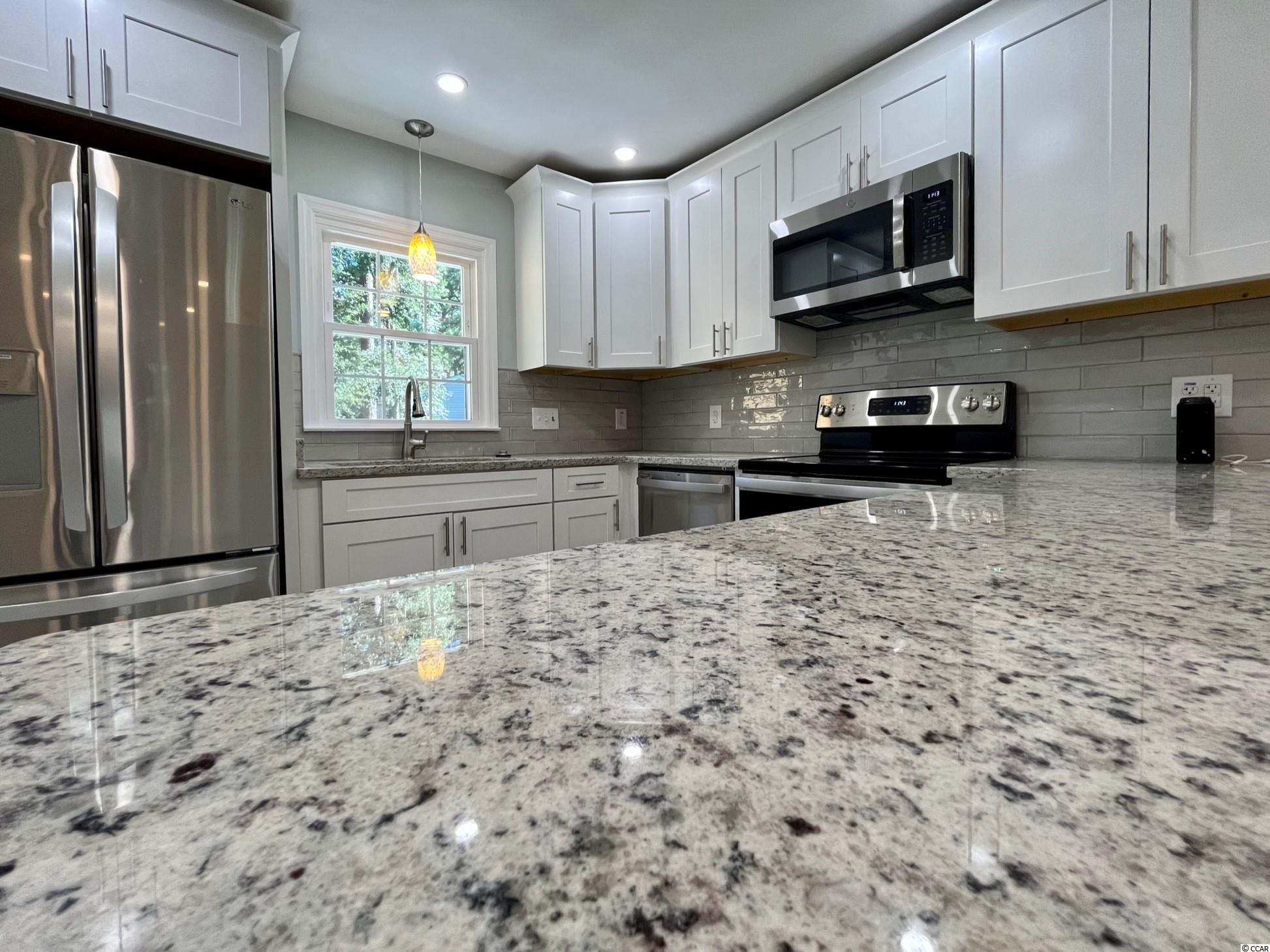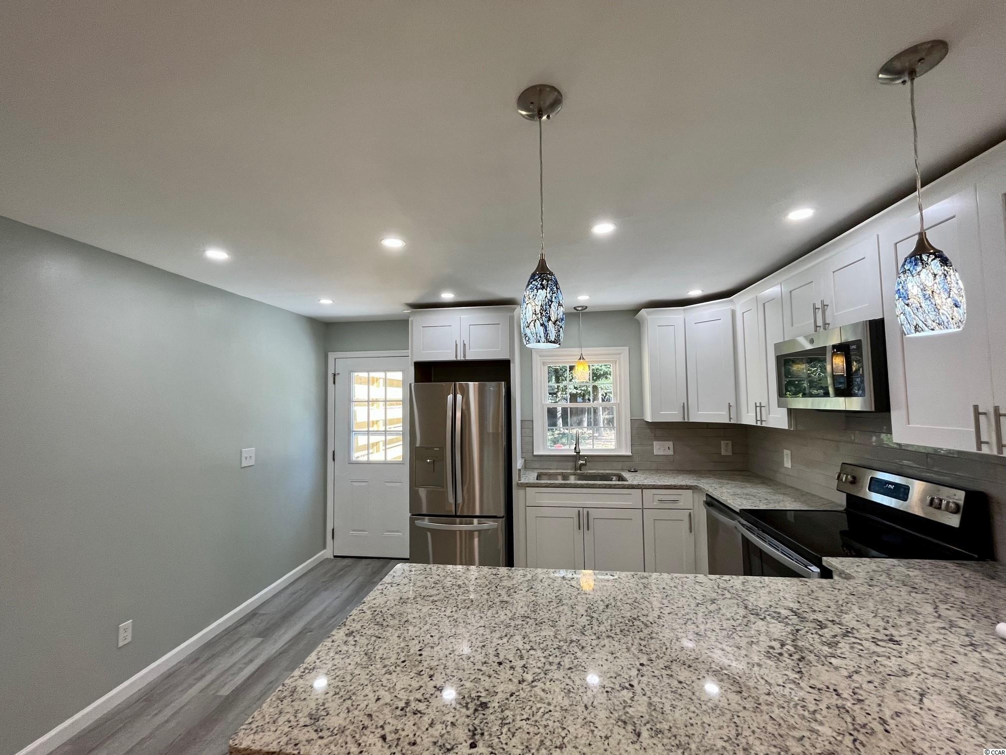 Turnkey, newly renovated, move-in-ready home located just a few blocks from Surfside Beach. With nearly 1800 heated sf, this home has plenty of room for the family to spread out. There are so many desirable features about this property, which include: new roof, freshly painted interior, new flooring throughout, all new windows, new bathroom showers & vanities, new kitchen cabinets & stainless steel appliances, tile kitchen backsplash, pantry, large laundry room with cabinets, granite in kitchen & bathrooms, new plumbing & light fixtures throughout, ceilings refinished smooth, over-sized bedrooms, primary bedroom & bathroom on first floor, gutters & landscaping added, deck overlooking backyard, and more. This property is ready for its new owners to come enjoy as all the work has already been done! Ideally located east of Hwy 17 in the coveted north end of Surfside with shopping, restaurants, beach, airport, and entertainment very close by. Large backyard with plenty of room for the kids and pets to play or for the garden enthusiast. Bring your boat, golf cart, and motorcycle as there's no HOA to contend with. This property would be the perfect second home, long-term rental investment, or full-time residence. Don't wait on this one, schedule your showing today!