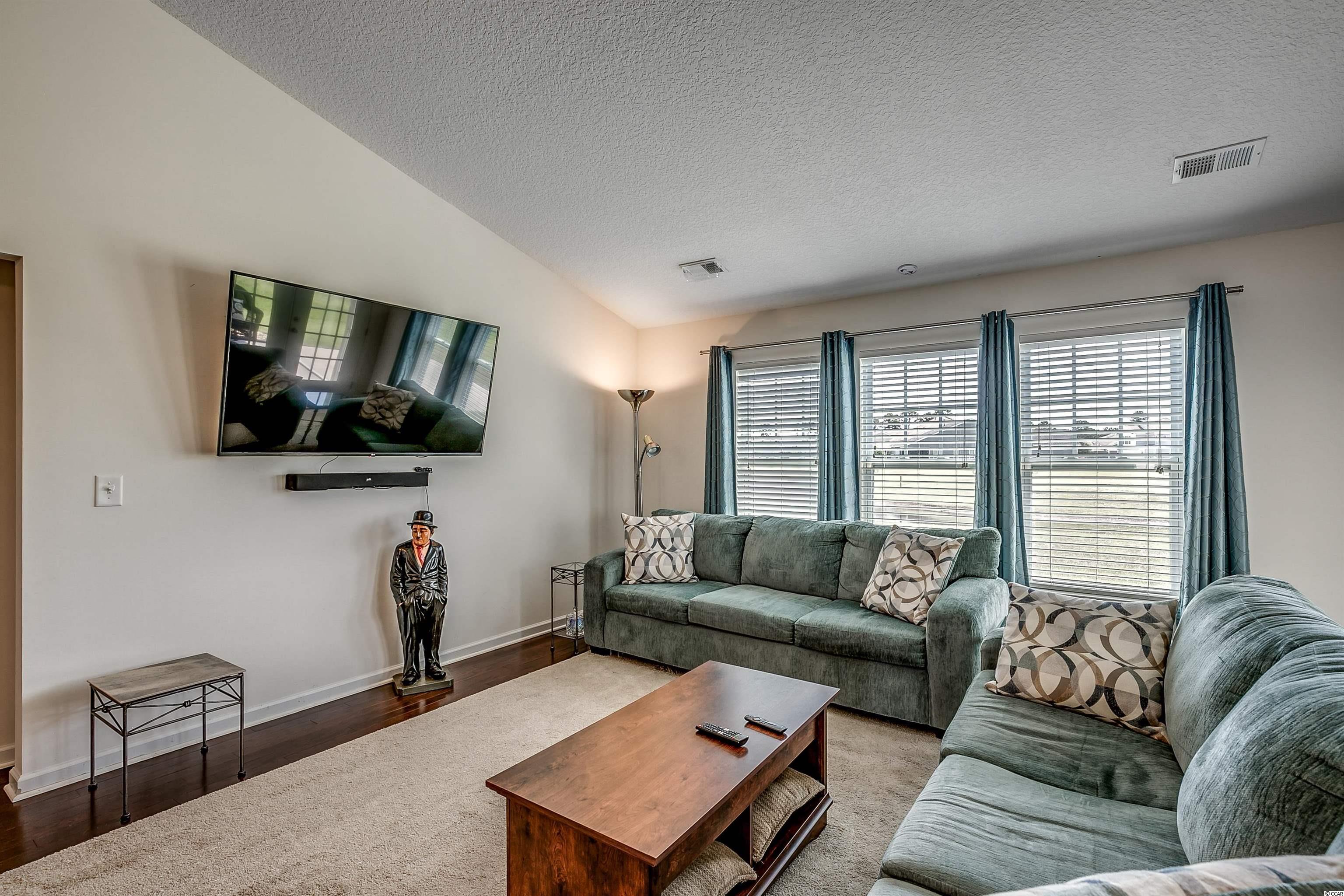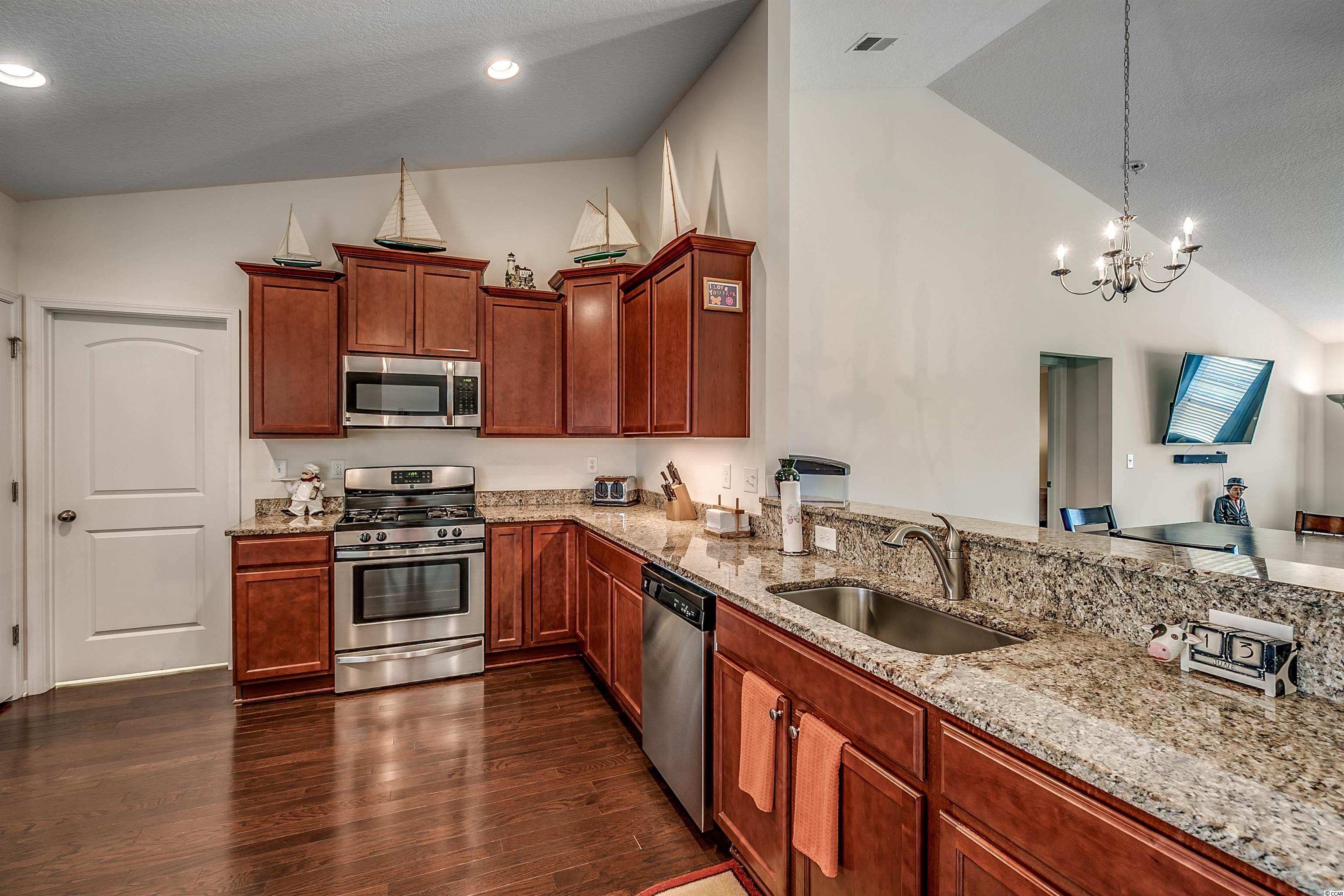 Beautiful single-level, lakefront 3 bedroom/2 bath home located just minutes to the beach. This well-maintained split bedroom home boasts vaulted ceilings, gorgeous hardwood flooring and an amazing view. Kitchen features upgraded cabinets, granite counter-tops and stainless steel appliances. Spacious family room offers a view of the lake and is open to the kitchen and perfect for entertaining. Master Bedroom also overlooks the lake, and has a large master bath with double sinks, shower and a huge walk-in closet. Secondary bedrooms are also spacious with plenty of closet space. In the wo car garage, you'll also find pull-down attic stairs to additional floored storage. Outside, you'll find a relaxing screened porch overlooking the water and a huge (almost 1/4 acre) yard that includes an irrigation system. Just minutes to great restaurants, shopping, medical facilities and, of course, the beach! Don't miss this one! Call the listing agent or your Realtor and schedule today!