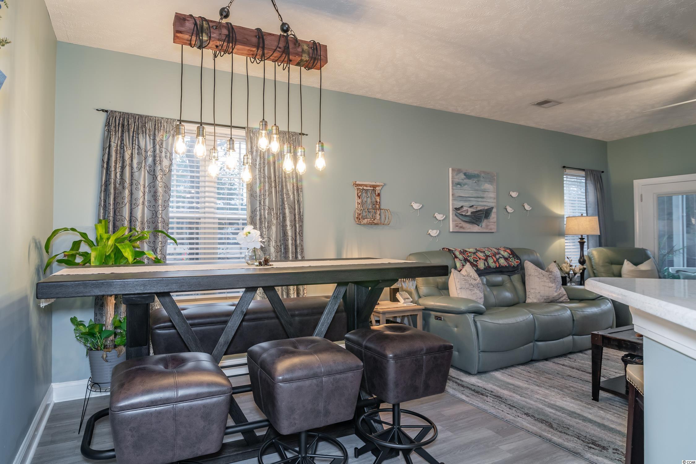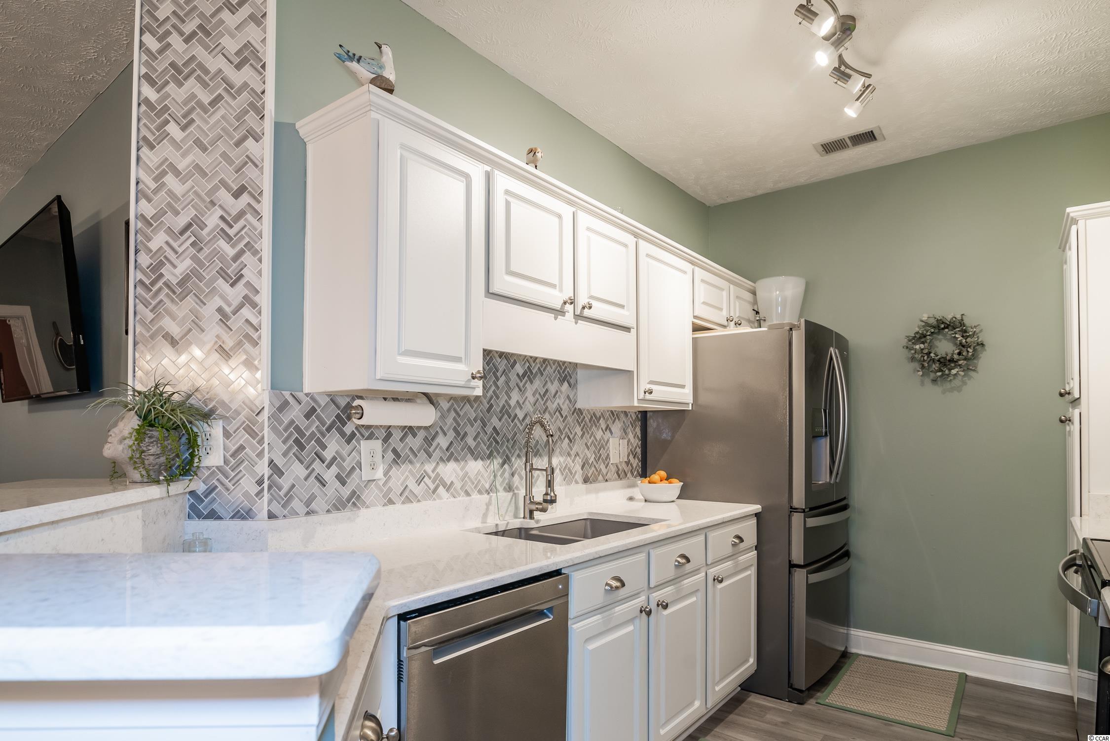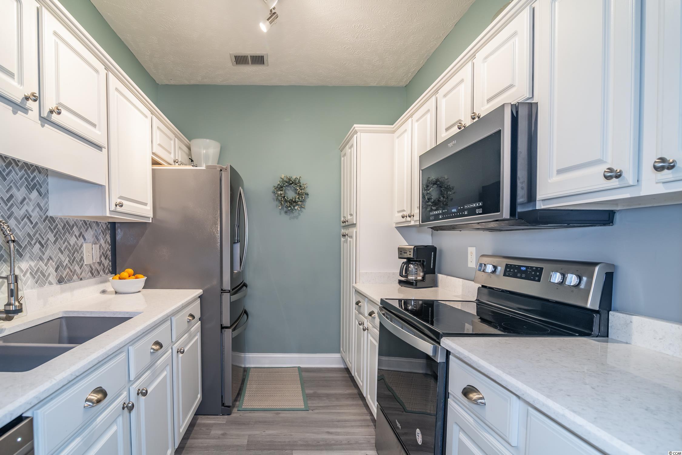 Welcome to the carefree lifestyle living near the beach in the private, security gated Pawleys Pavilion community in Pawleys Island, South Carolina. Your reserved parking place is waiting right outside your ground floor villa which is located on the end of the building allowing two extra window providing additional natural light. Entering the Villa, you will immediately notice the luxury vinyl flooring that flows seamlessly throughout the villa. On each side of the entry hallway, there is a guest bedroom and a guest ensuite with a private full bath. The walk-in laundry room includes the washer and dryer and has two wall mounted cabinets for storage. The completely remodeled kitchen features new countertops, designer backsplash, and Whirlpool Stainless steel appliances plus a convenient pantry. The open, bright kitchen is ready to prepare fresh Shrimp and Grits or a Southern Fried Flounder dinner. There is a new designer chandelier in the dining area lighting the family gathering table. The large comfortable living area provides plenty of room to relax after a great day at the golf course or at the beach. Enjoy your morning coffee or an after-dinner beverage on the private screened porch overlooking a small pond. Retire for the evening into the owner suite also overlooking the pond. The owners suite has a nice sitting/hobby area plus plenty of closet space with a walk-in closet plus a separate double wide closet. In the owners bath you can unwind in the spacious garden soaking tub or take a hot shower. Meet your neighbors by the community pool and enjoy our temperate southern climate. Pawleys Pavilion is convenient to Stables Park for tennis and Pickleball and a large full-service health club nearby. Its located in the small Litchfield Beach/Pawleys Island community, which is famous for its ten championship golf courses, boutique shopping, award winning restaurants, fresh and saltwater fishing, biking and walking trails, multiple marinas on the Intra-Coastal Waterway for boating and of course, its wide sandy beach. Litchfield Beach stretches for six miles making a paradise for bathers, walkers, and runners. Watching the moon rise over the ocean is a popular evening activity. Sea turtles nest in protected areas on the beach where conscientious neighbors quietly watch over their protected nesting locations. It is located just four miles away from Brookgreen Gardens, the largest outdoor sculpture garden in the world. Myrtle Beach, one of the country's top tourist destinations and home to the highly rated Carolina Country Music Festival, is only a thirty-minute drive to the north and historic Charleston is just 70 miles to the south. Make this part of South Carolina your new destination to create your own treasured family memories.
