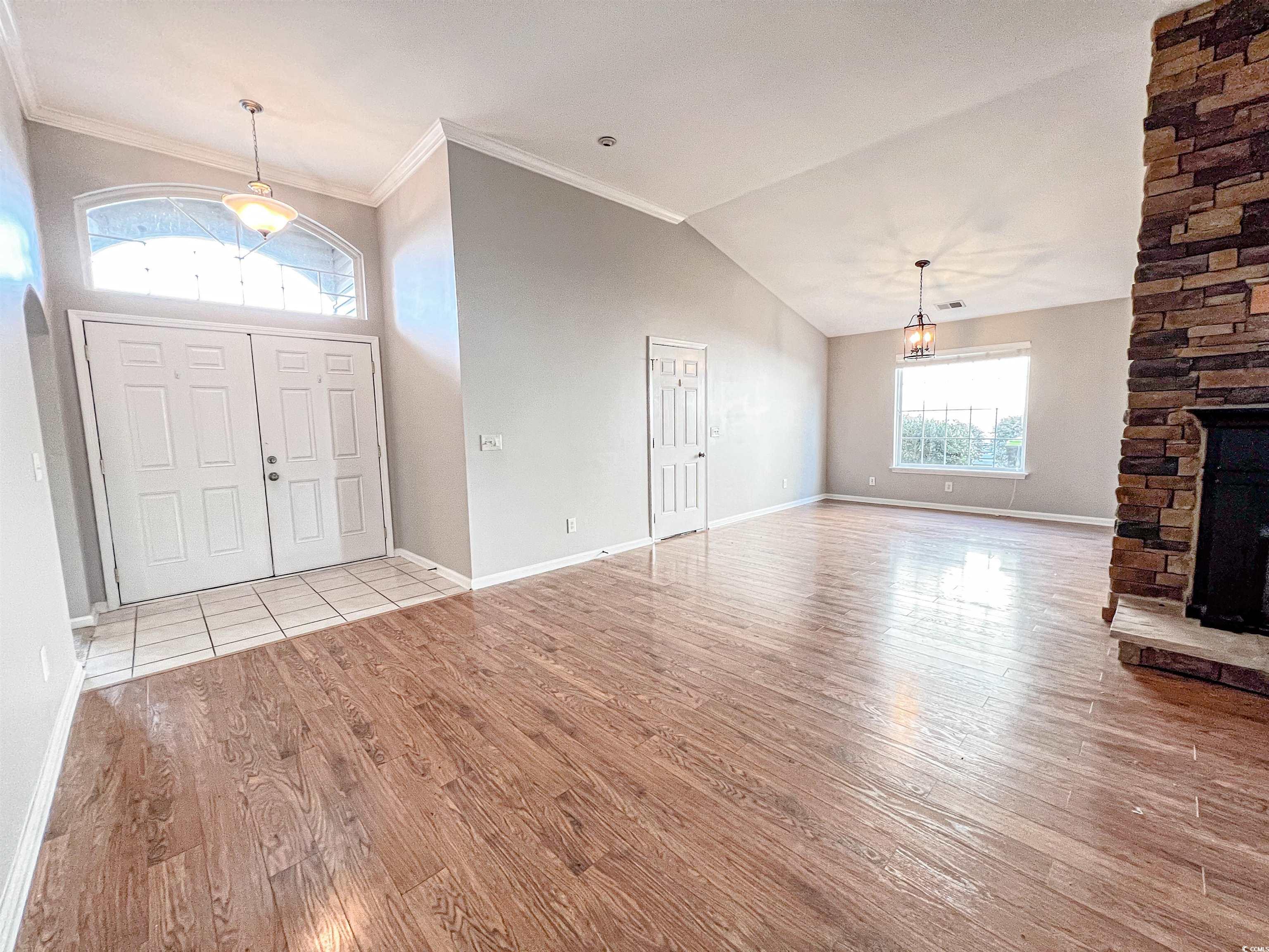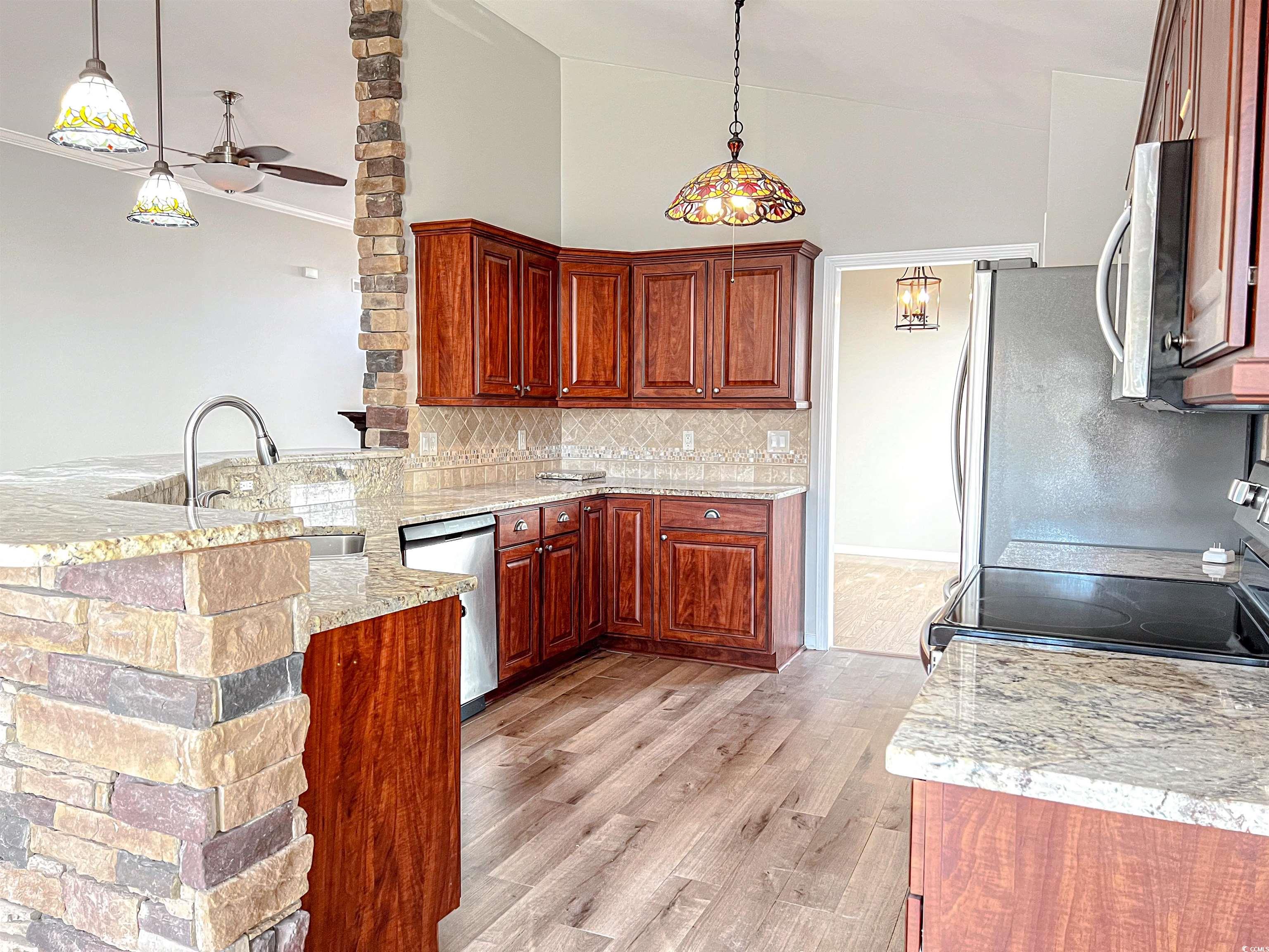 Welcome to the popular Camelot development inside the gated community of Myrtle Beach Golf and Yacht Club. This beautiful 3 bedroom, 2 bath home offers a thoughtful layout with all rooms located on the first floor. Featuring 1,825 heated sq. ft. and 2,400 total sq. ft., this home combines comfort and functionality. Step inside to a spacious living room with a lovely stone fireplace, perfect for cozy evenings. The kitchen is well-appointed with stainless steel appliances, solid surface countertops, and abundant cupboard space, easily serving both the dining area and the breakfast nook. A flex space and a bright sun porch provide extra versatility for work, hobbies, or relaxation. The primary bedroom is thoughtfully positioned on the back side of the home, offering privacy away from the two additional bedrooms located in the front. A 2-car attached garage adds convenience and storage. Enjoy the security and amenities of this gated community while living just minutes from all Myrtle Beach and the entire Grand Strand has to offer.