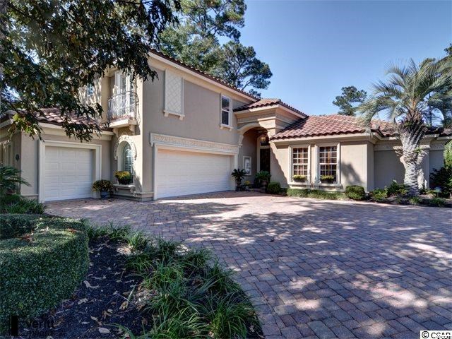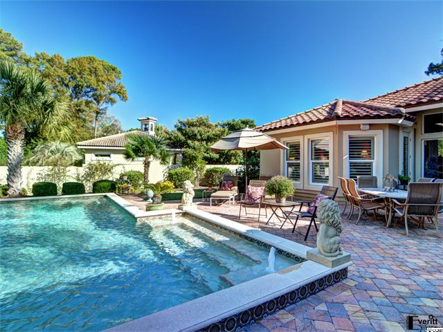 Former Classic Homes model. 4BR 3BA with 3,361 hsf and 4,379 tsf. All natural gas and LeBleu water filter system throughout. Open kitchen boasts of stainless Thermador appliances, including a 6-burner gas range and extra wide oven, work island, breakfast bar and breakfast nook. Family room has tray ceiling and wet bar with ice maker. Master bedroom suite and library on first floor. Bedrooms 2 and 3 are on second floor which share the jack & jill bathroom and cozy den with mini kitchen. Formal dining room with chandelier and tray ceiling. Large living room with vaulted tray ceiling and fireplace. Beautiful 12 x 12 uneven mexican tile floors and textured walls throughout. Laundry room with wash-out sink. Finished 3-car ( 21 x 26) garage includes golf cart bay, painted textured walls. 16 X 11 Screened porch. Pool, spa and lanai with built in bbq are just some of the exterior features nestled in the beautifully landscaped yard.