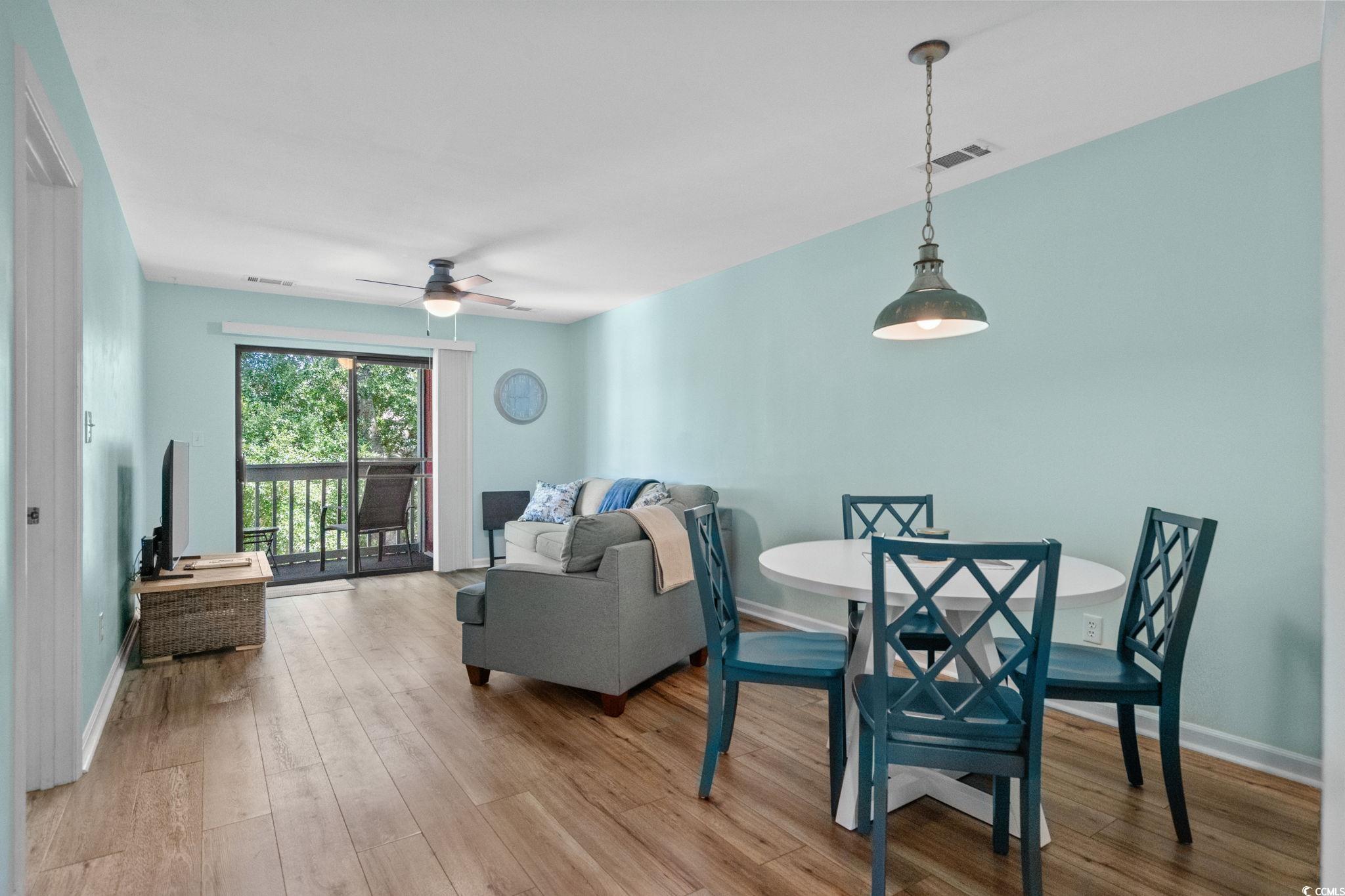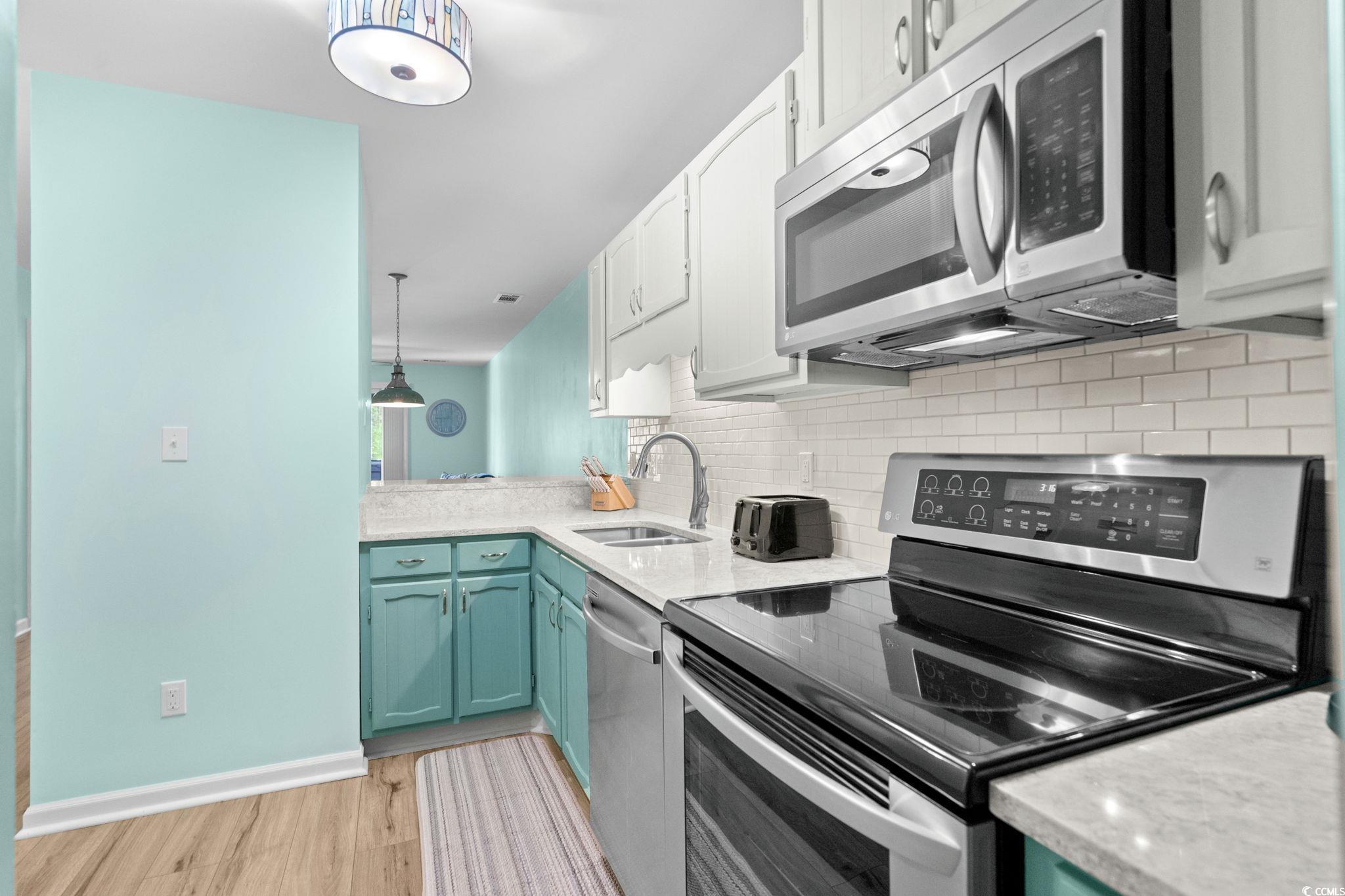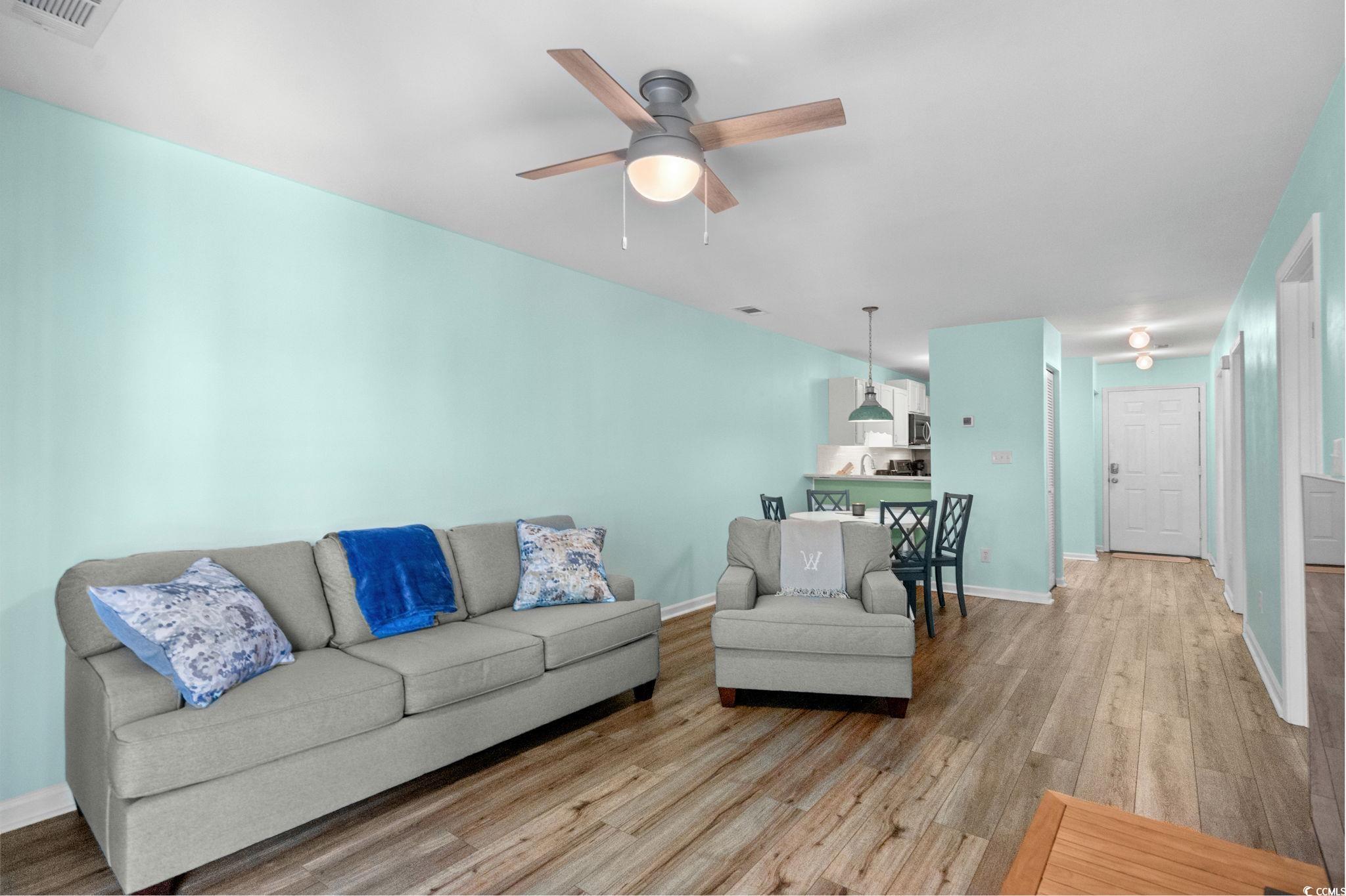 Welcome to this beautifully renovated 2-bedroom, 2-bath condo in the sought-after Watermark community, ideally located east of Business 17 and just blocks from the beach access! Situated on the 3rd floor, this fully furnished (all brand new furniture) unit offers an open, coastal feel with smooth ceilings and LVP flooring throughout. The updated kitchen features quartz countertops, stainless steel appliances, and a breakfast bar, perfect for casual dining. Both bathrooms have been modernized with sleek walk-in showers, and the convenience of in-unit laundry adds to the home's functionality. Enjoy your morning coffee or evening breeze on the tree-lined balcony overlooking the peaceful courtyard and sparkling poolplus there's a handy storage closet just off the balcony. Watermark offers a low HOA that includes water, sewer, trash, cable and internet, with amenities like a pool, BBQ area, and gazebo. Golf carts are welcome, and while short-term rentals are not allowed, the communitys quiet charm makes it ideal for a primary residence or second home. You'll love being within walking or golf cart distance to dining, shopping, medical offices, and more!