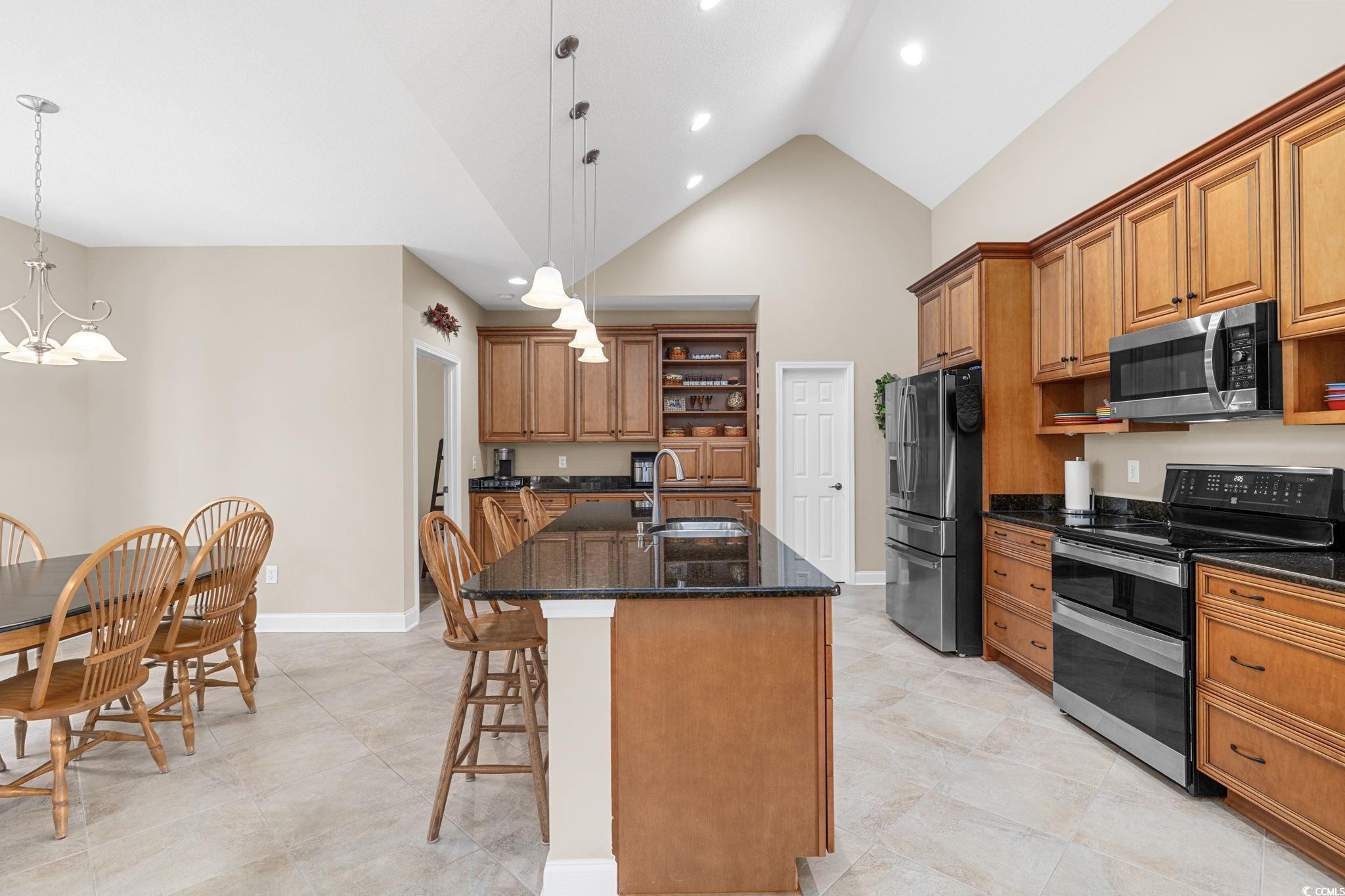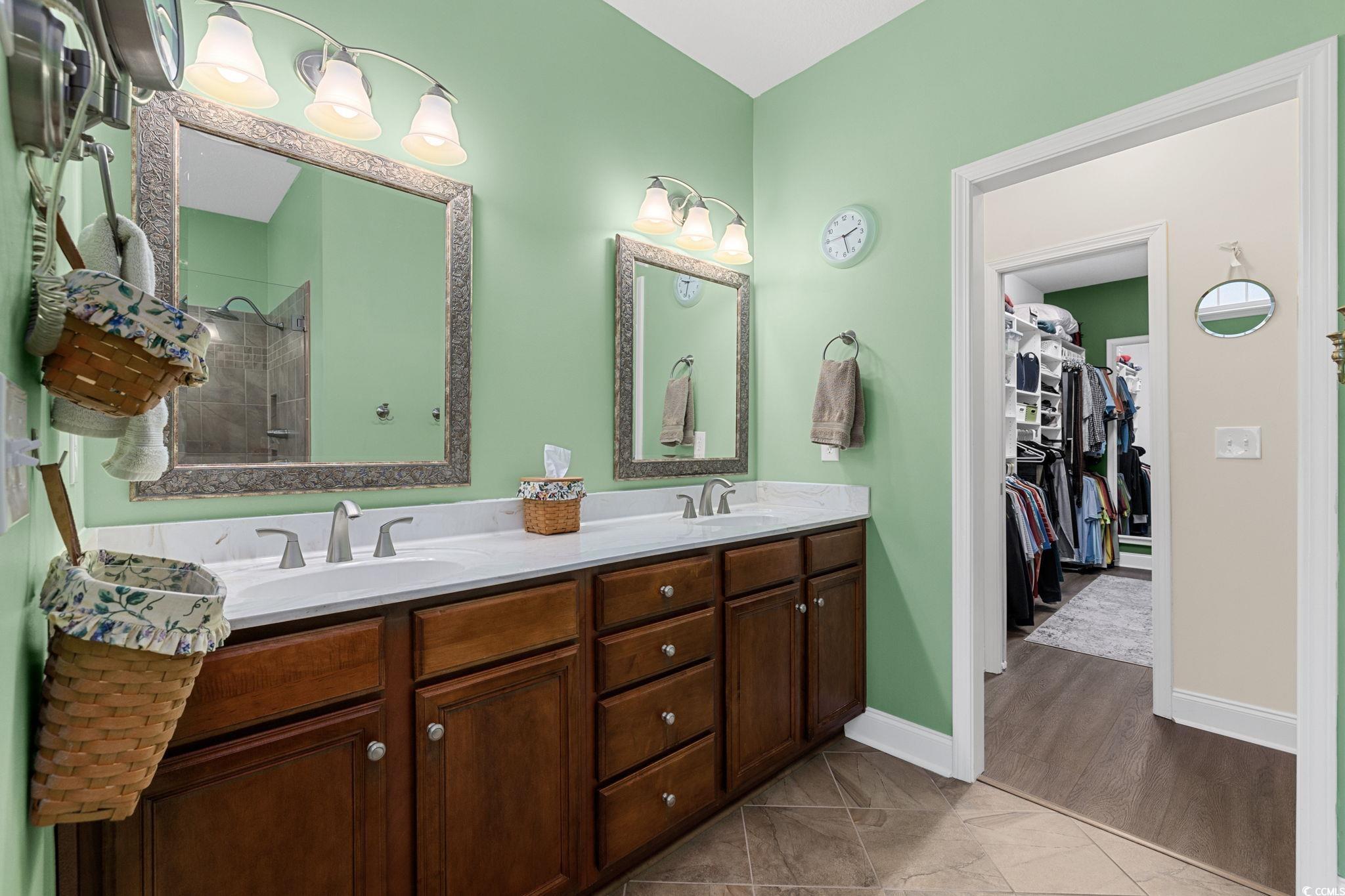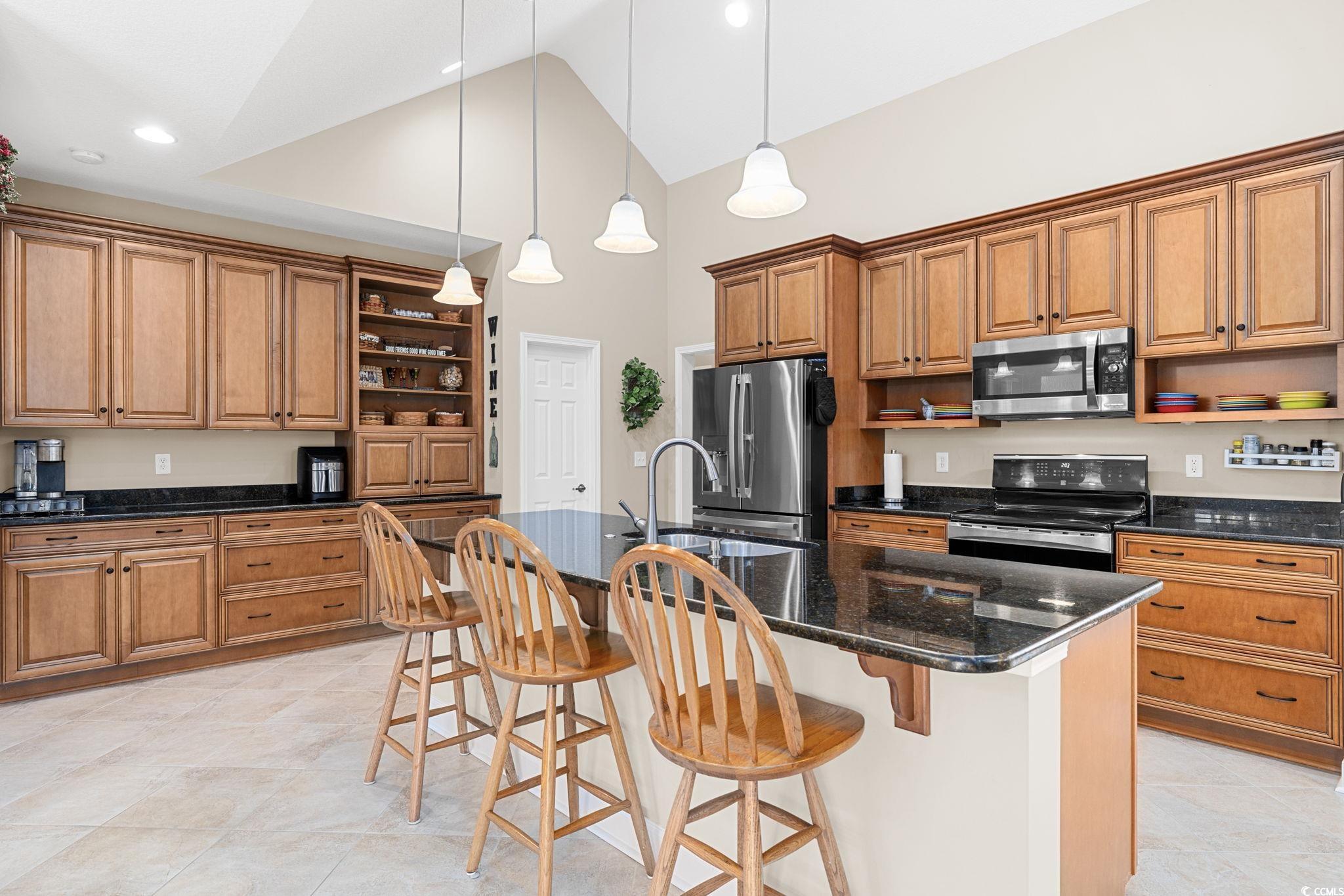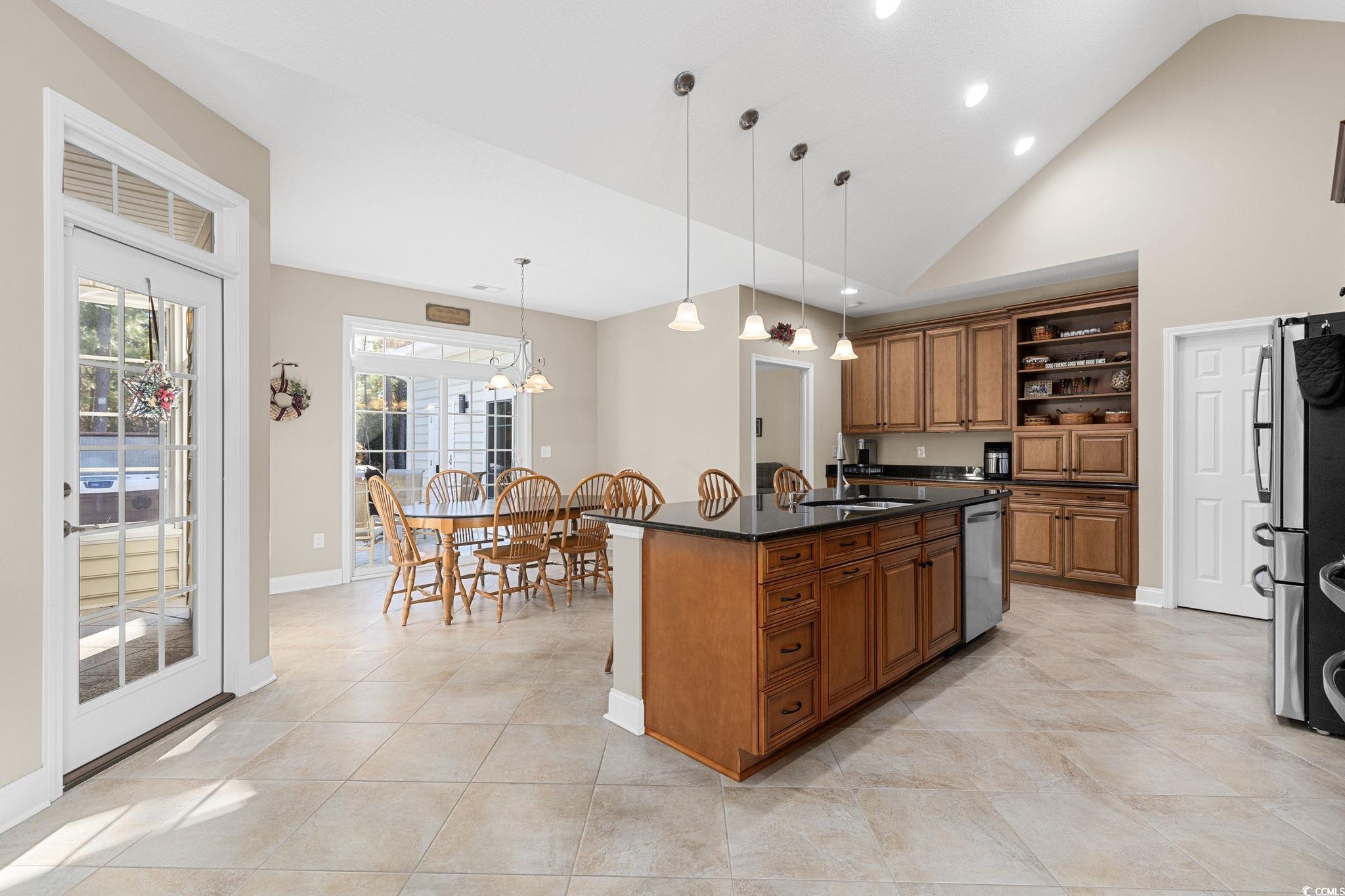 Welcome to Waterford Plantation in Carolina Forest! This lovely home features 4 bedrooms, 3 bathrooms, a sitting room, 3 car garage, E-Z Breeze screened porch, and a stunning patio with a relaxing nature view. As you step inside, you'll appreciate the bright and open floor plan. The living room and kitchen showcase vaulted ceilings and luxury tile flooring, adding a touch of style and character to the space. Skylights in the living room provide ample natural light. The kitchen is a dream with granite countertops, a spacious breakfast bar/workspace island, custom cabinets, pantry and an additional wall of custom cabinetry. The master suite is a true retreat, featuring a walk-in closet, tray ceiling, sitting area, double vanity, and an oversized custom tiled walk-in shower. All three first floor bedrooms have Luxury Vinyl Plank flooring. There are two doorways in the dining area, one leading to the screened porch and the other to the backyard patio. Relax and unwind in the comfortable (EZ Breeze) screened porch or enjoy the roomy hot tub and outdoor activities on the oversized patio with Texture-Krete Coating. Storage is plentiful in this home, with a spacious walk-in attic located off the 4th bedroom/bonus room, additional storage in the three-car garage, an attached storage area located near the patio and a backyard storage shed. Waterford Plantation offers fantastic amenities including a large community pool, club house, playground, basketball court, and tennis courts. Don't miss out on this amazing opportunity! Waterford Plantation is conveniently located in award-winning Carolina Forest school system, easy access to great restaurants, plenty of shopping, medical services, multiple golf courses and best of all 8.7 miles to the beach!