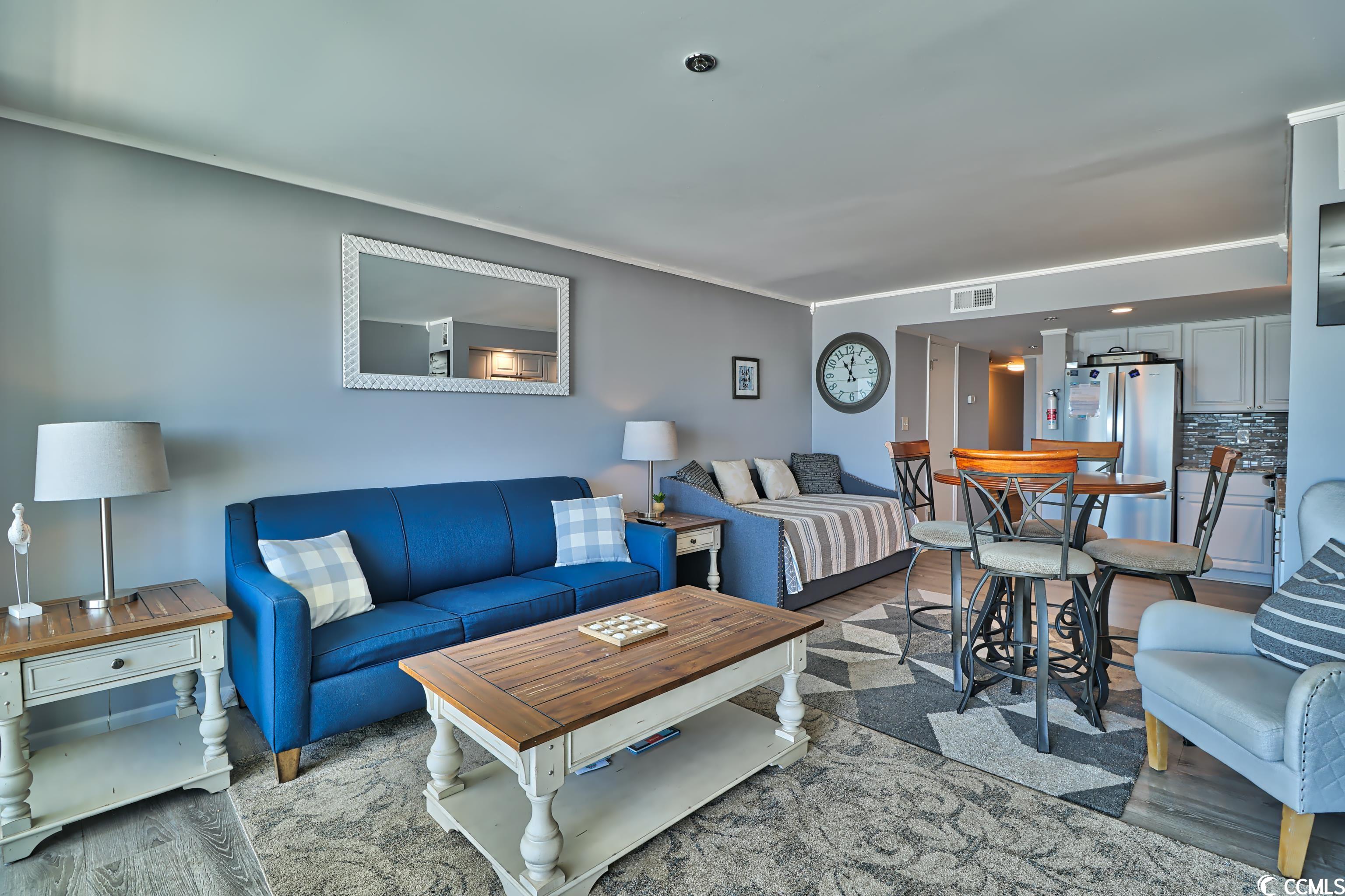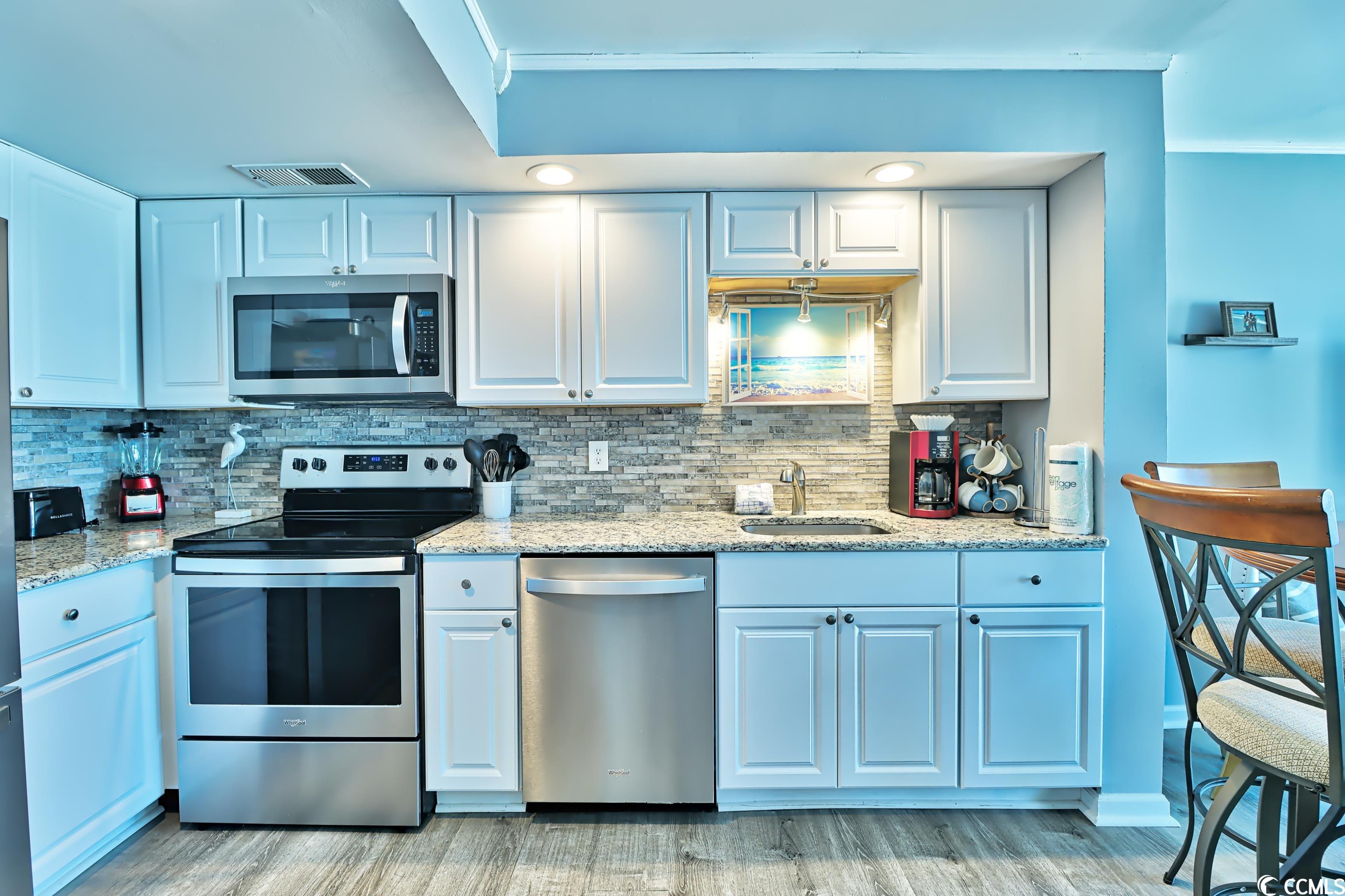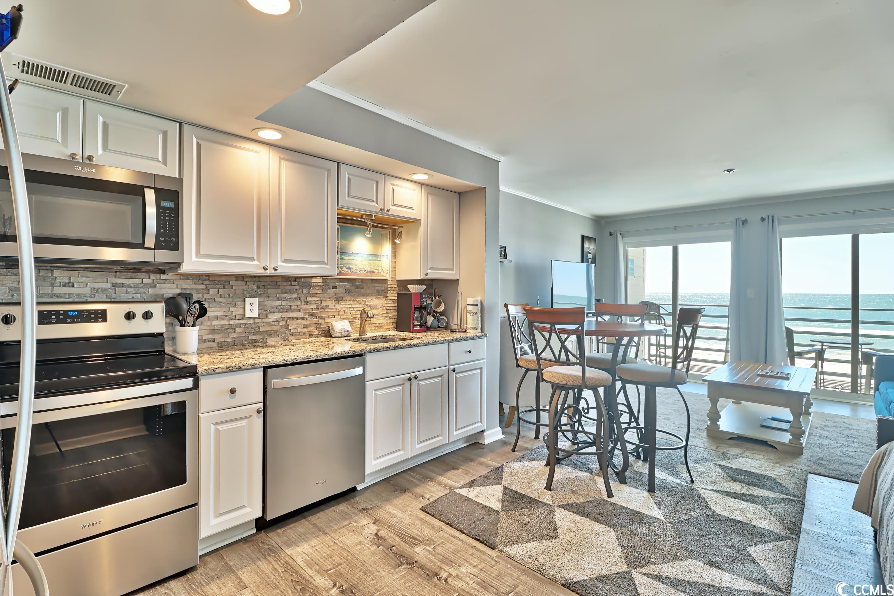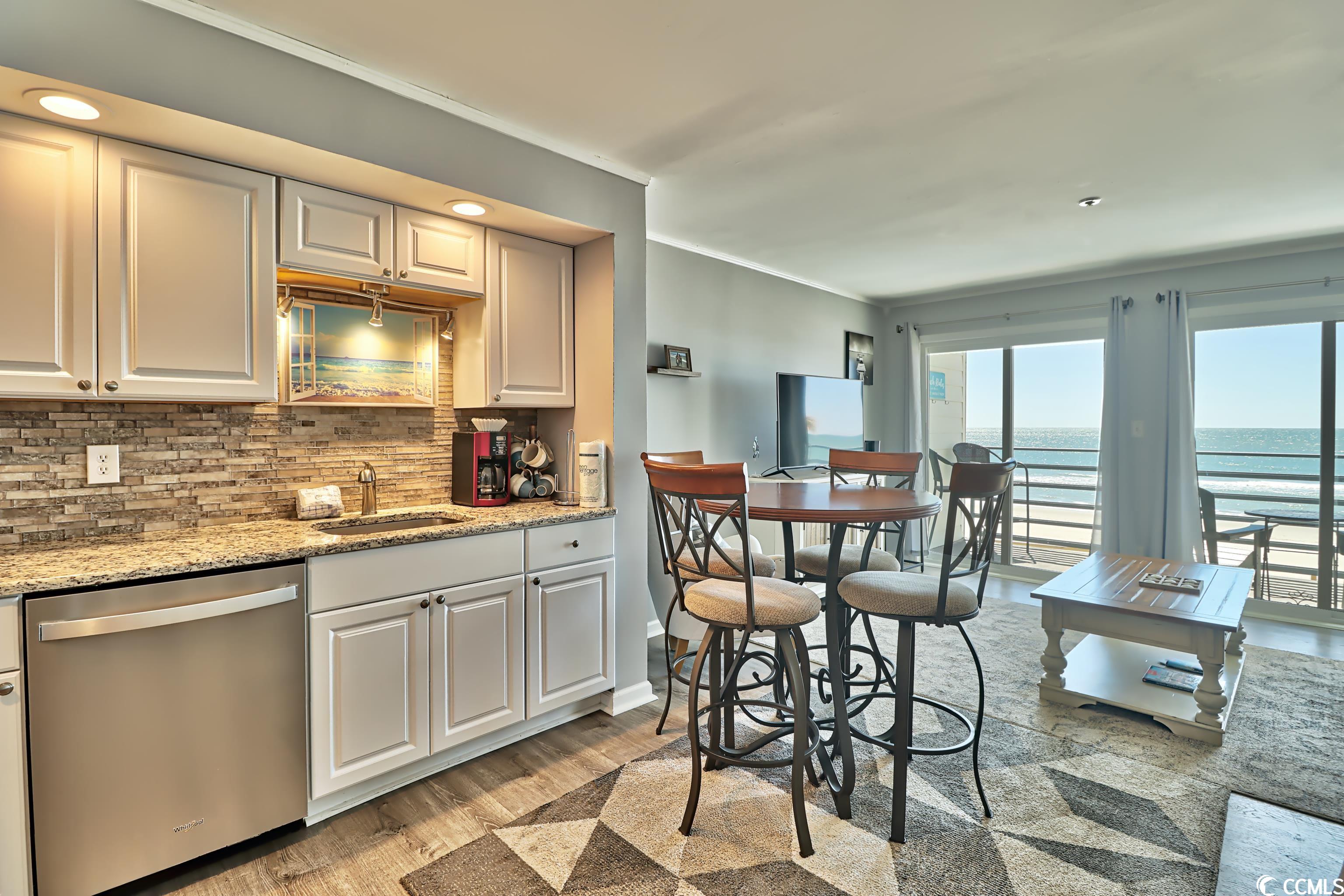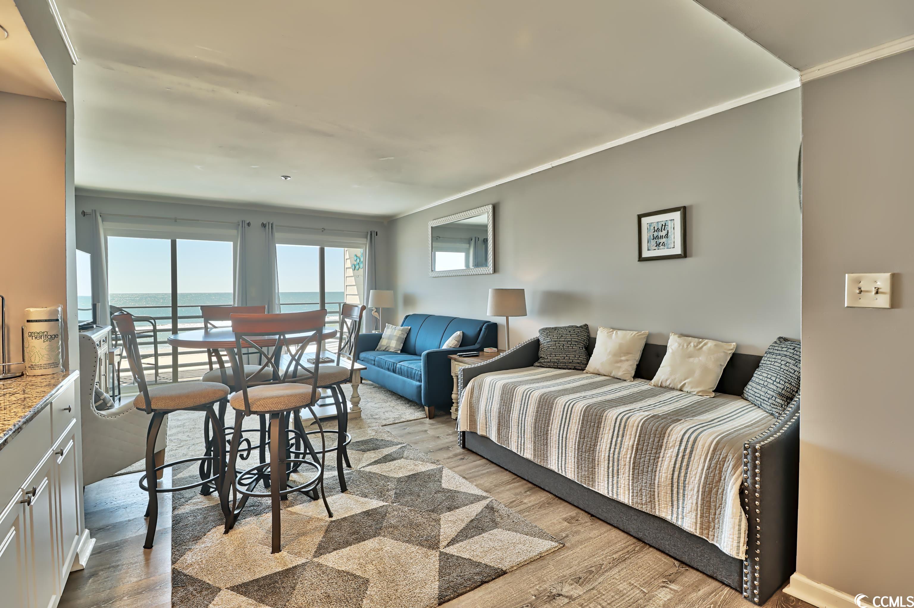 Oceanfront vacations await you in this renovated one bedroom one bath unit! The kitchen has been updated with solid surface countertops, stainless steel appliances and tile backsplash. The private bedroom is separate from the main living which also contains a pullout couch in the living area and another day bed that can be turned into a trundle. One of the best features in my opinion are the smooth ceilings! NO POPCORN! There is an updated full bath and a great storage area in the hall of the unit. Of course the views from the unit and balcony are the reason why this is a great place to vacation or rent out during the season! First floor means a quick walk to the beach but there is also an elevator for your convenience and for your heavy items or groceries. Approximately 9 blocks to the Garden City Pier and various entertainment! Square footage is approximate and not guaranteed. Buyer is responsible for verification.