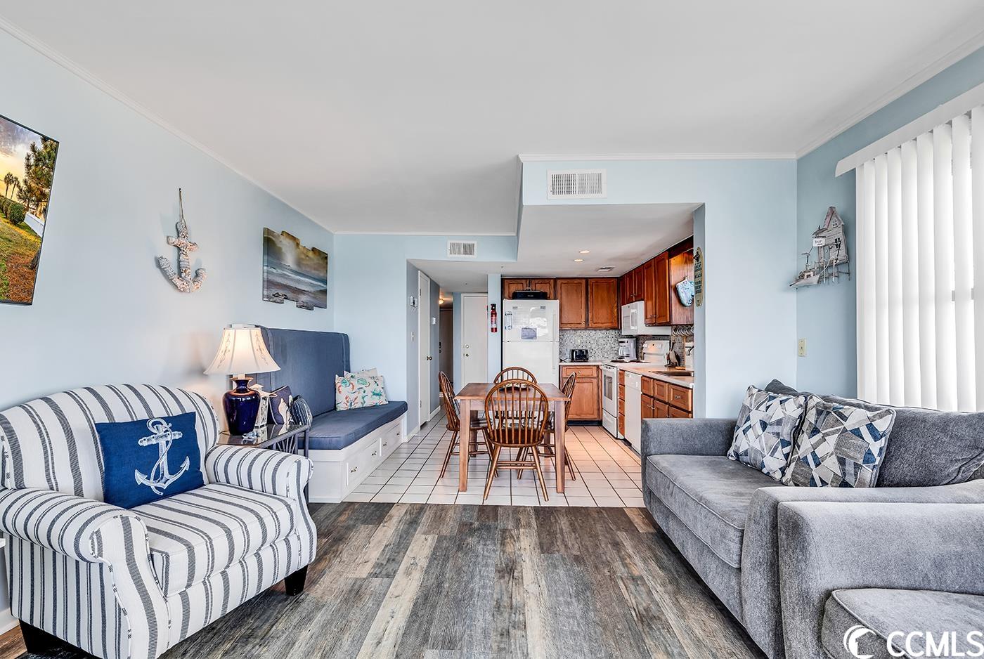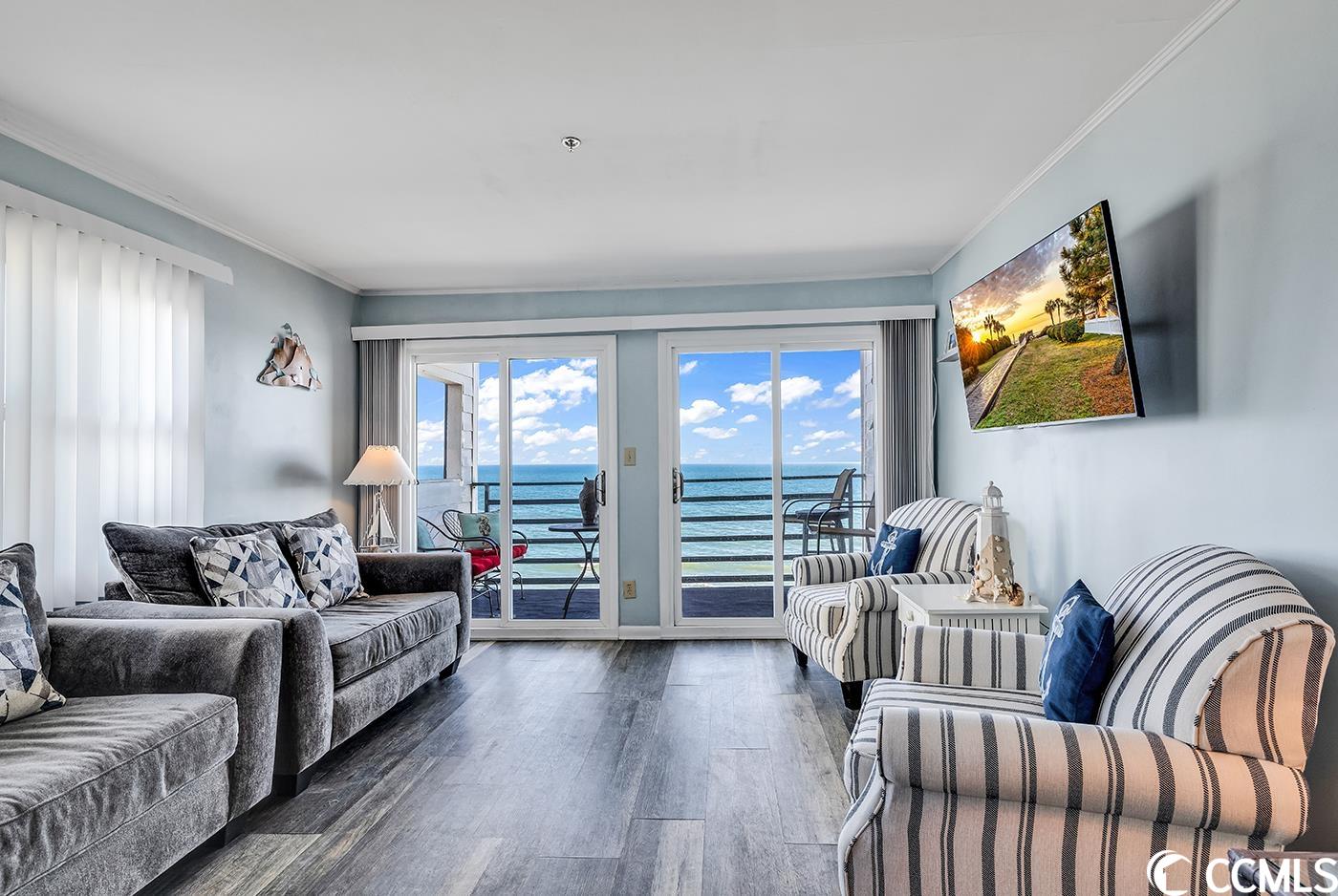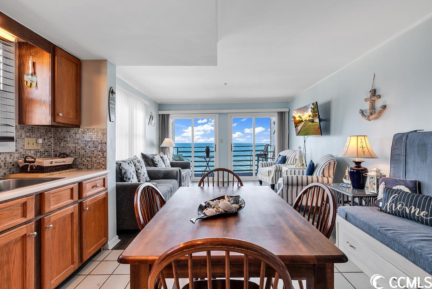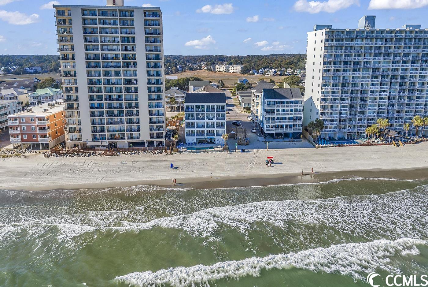 Come experience the epitome of coastal living in this top floor, end unit, 1-bedroom, fully furnished condo. The top-floor positioning offers panoramic views of the sparkling Atlantic Ocean inviting you to savor stunning sunrises. This thoughtfully designed unit features a true 1 bedroom with amble closet, a cozy living area with sleeper chairs, remodeled bathroom and a fully equipped kitchen adorned with appliances and a pantry. Enjoy the convenience of a private balcony where you can unwind while taking in the salt-kissed breeze and the soothing sound of waves crashing against the shore. You have direct access to the beach, allowing for leisurely strolls along the sand or choose to relax by the community pool. Nestled near Murrells Inlet, renowned for its fresh seafood, vibrant local culture, and charming waterfront atmosphere, this unit offers proximity to a myriad of dining, entertainment, and recreational options.