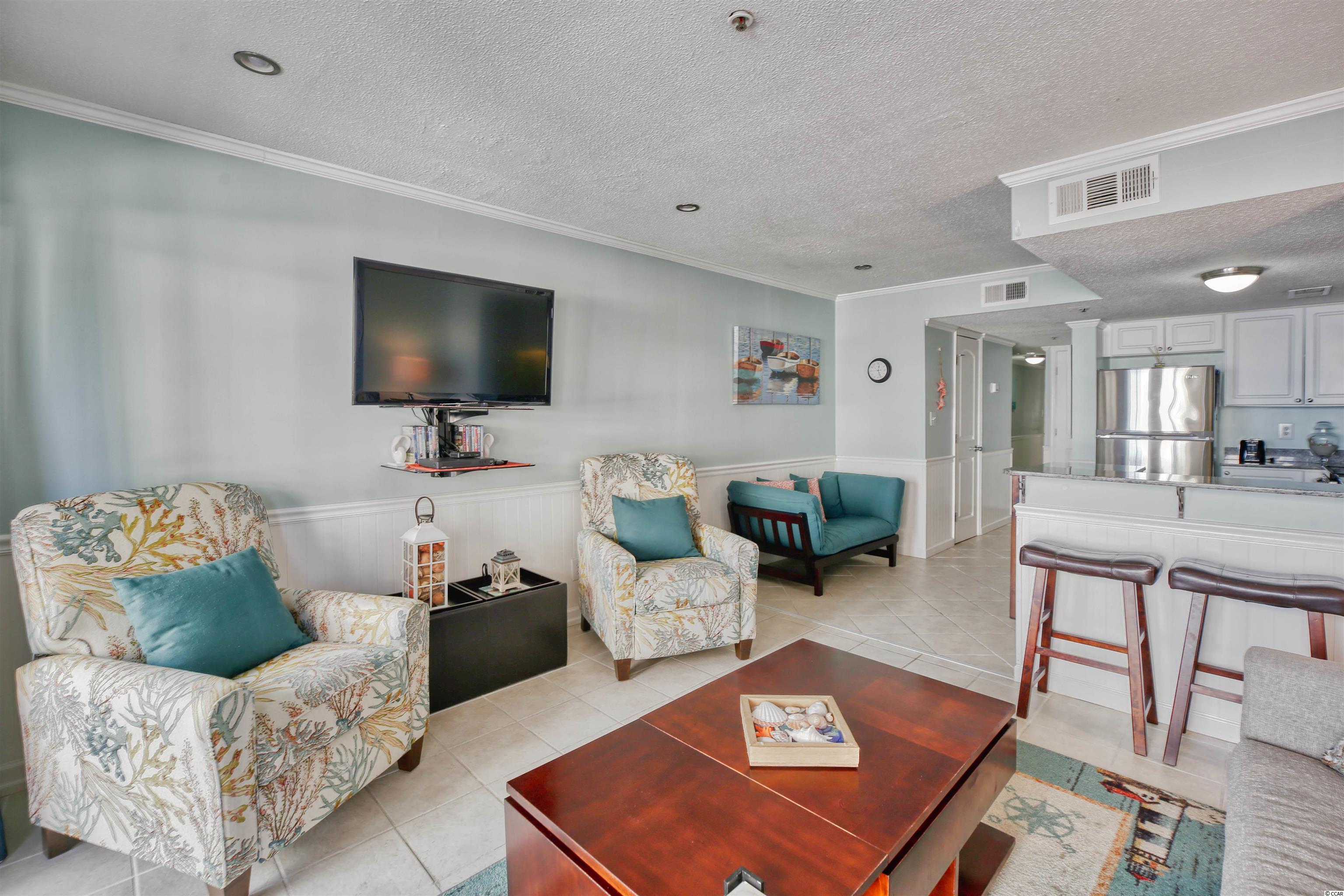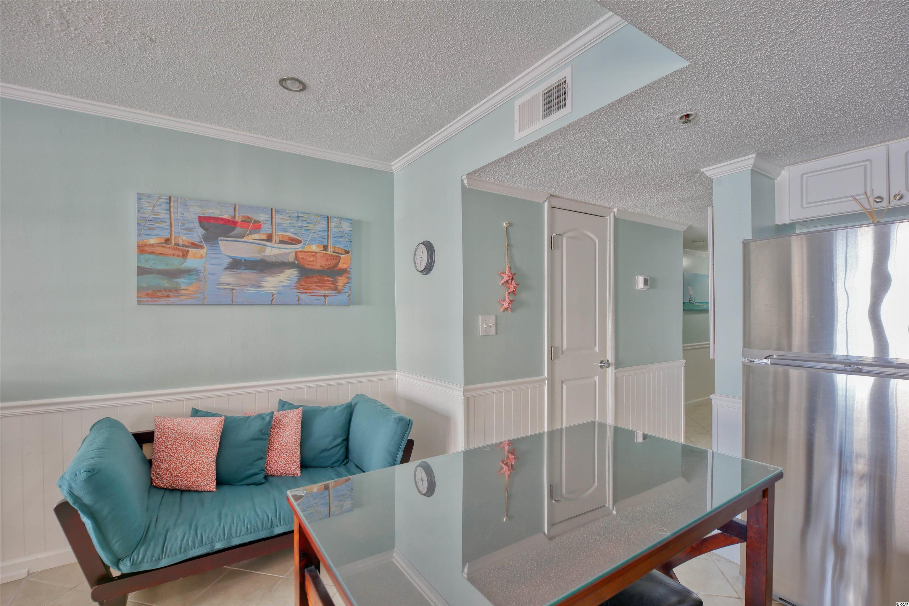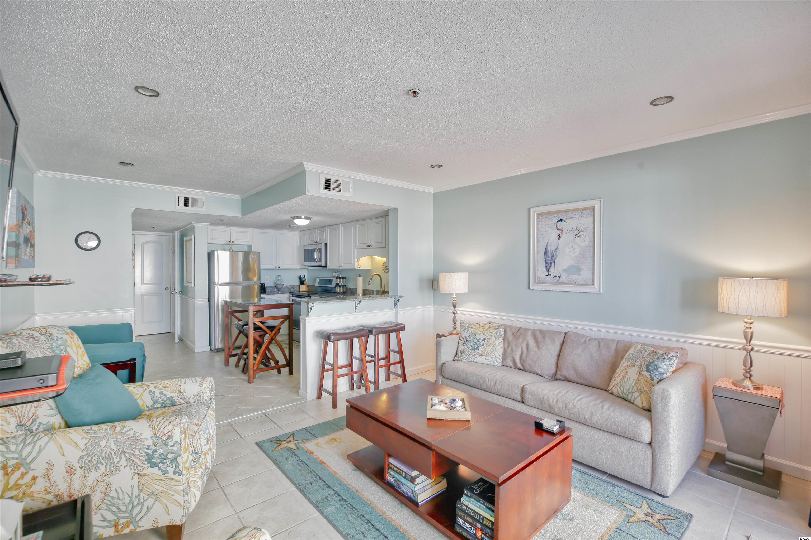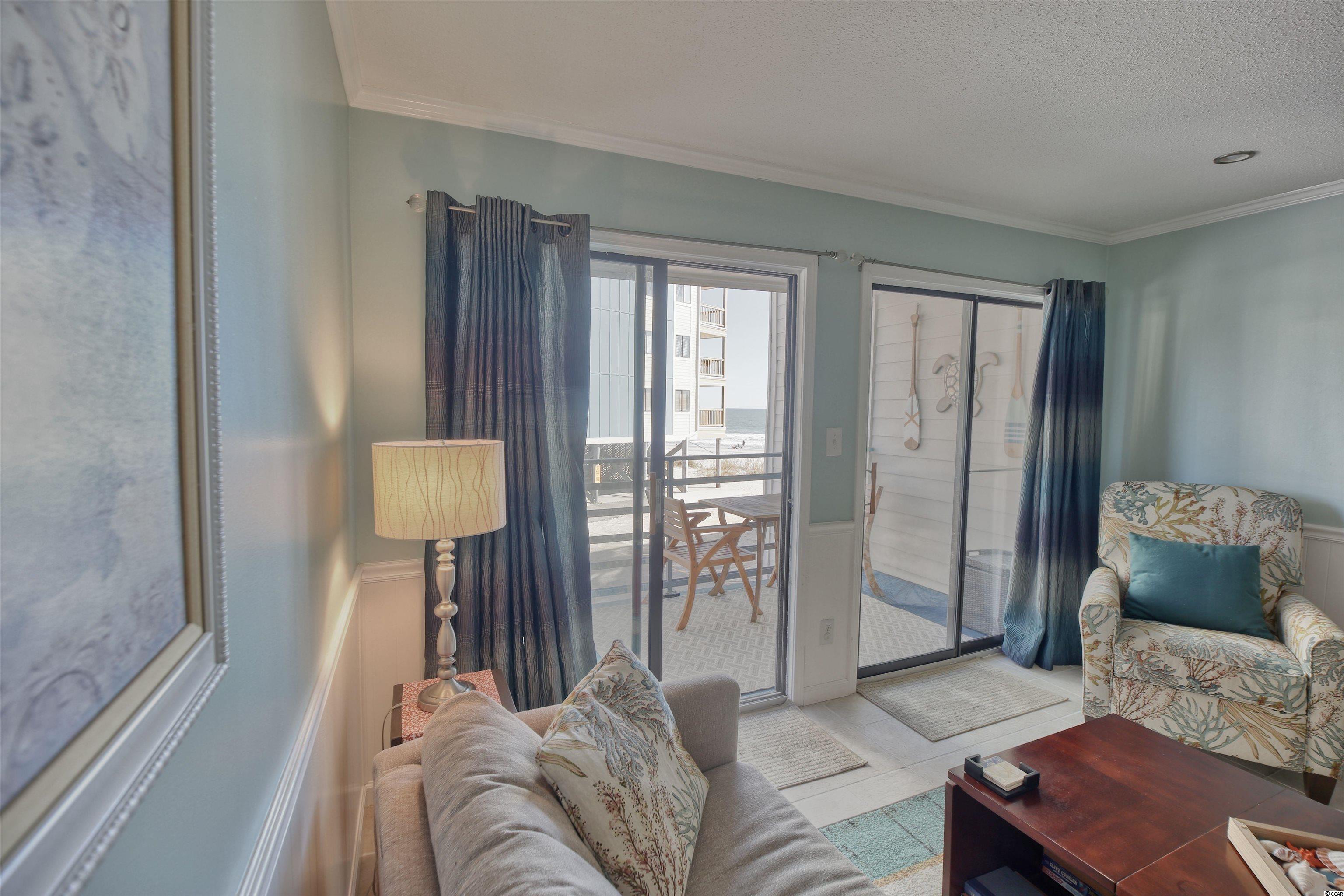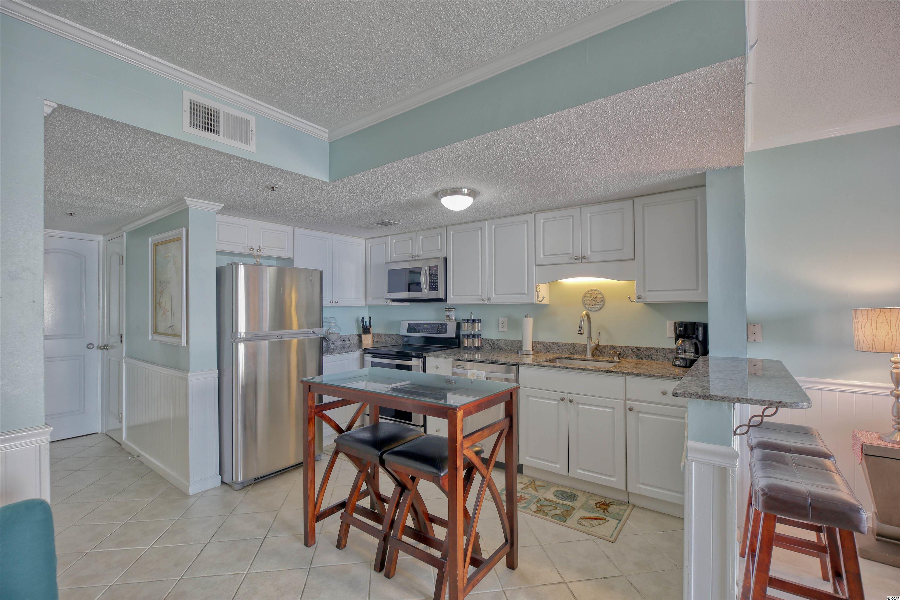 Looking for a Beach condo that is move in ready with amazing ocean views from your balcony or couch?? Looking to live permanently? Maybe part time and garner rental revenue? Then you have found the perfect place!! Fully furnished and updated with tile throughout, elevator for convenience, large closets and private owner's closet. Granite countertops and stainless appliances plus newer HVAC (2019), new Queen sleeper sofa and reclining chairs! Low HOA fees that include cable and internet. Oceanfront pool, quiet complex and walking distance to pier and arcade section of Garden City.