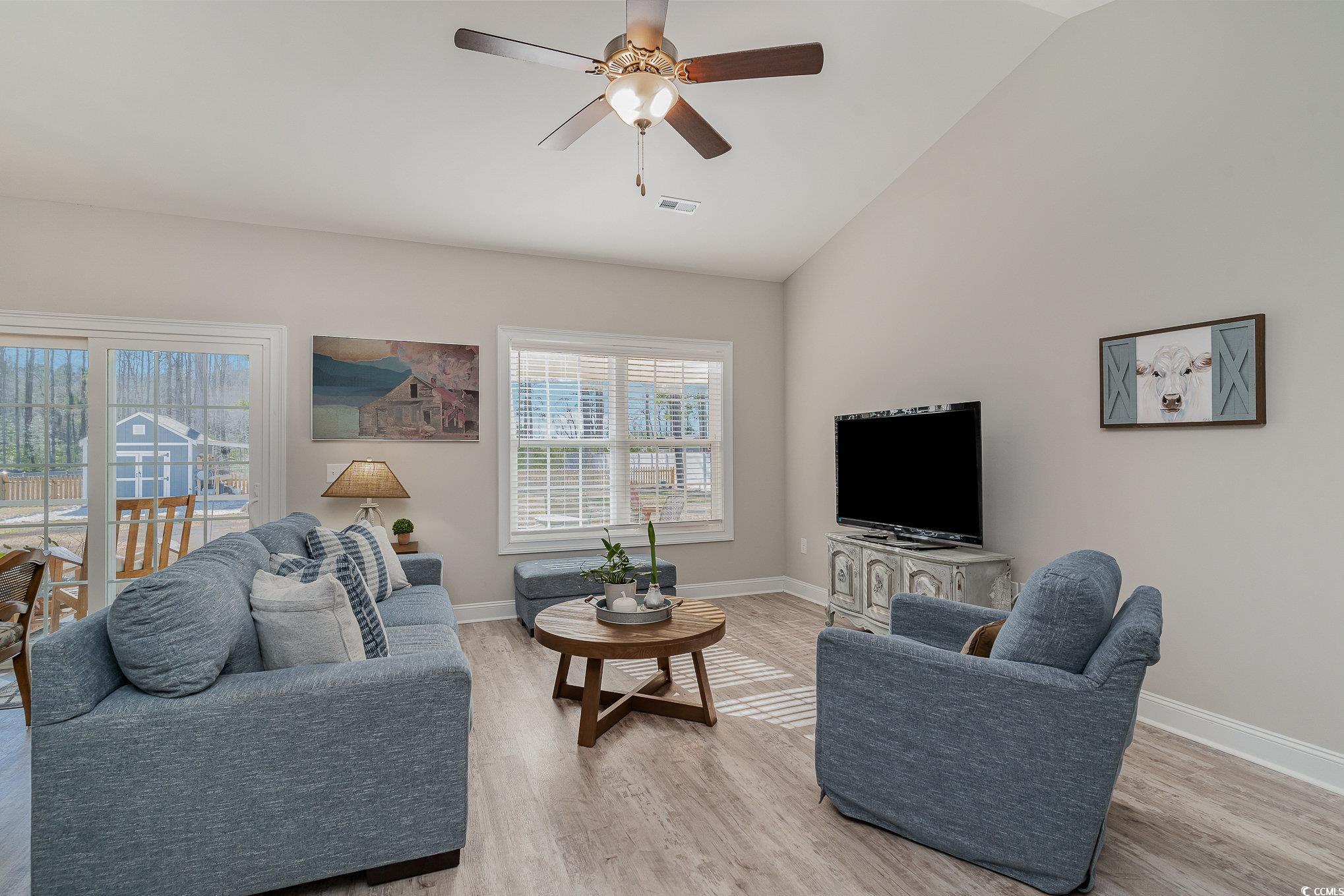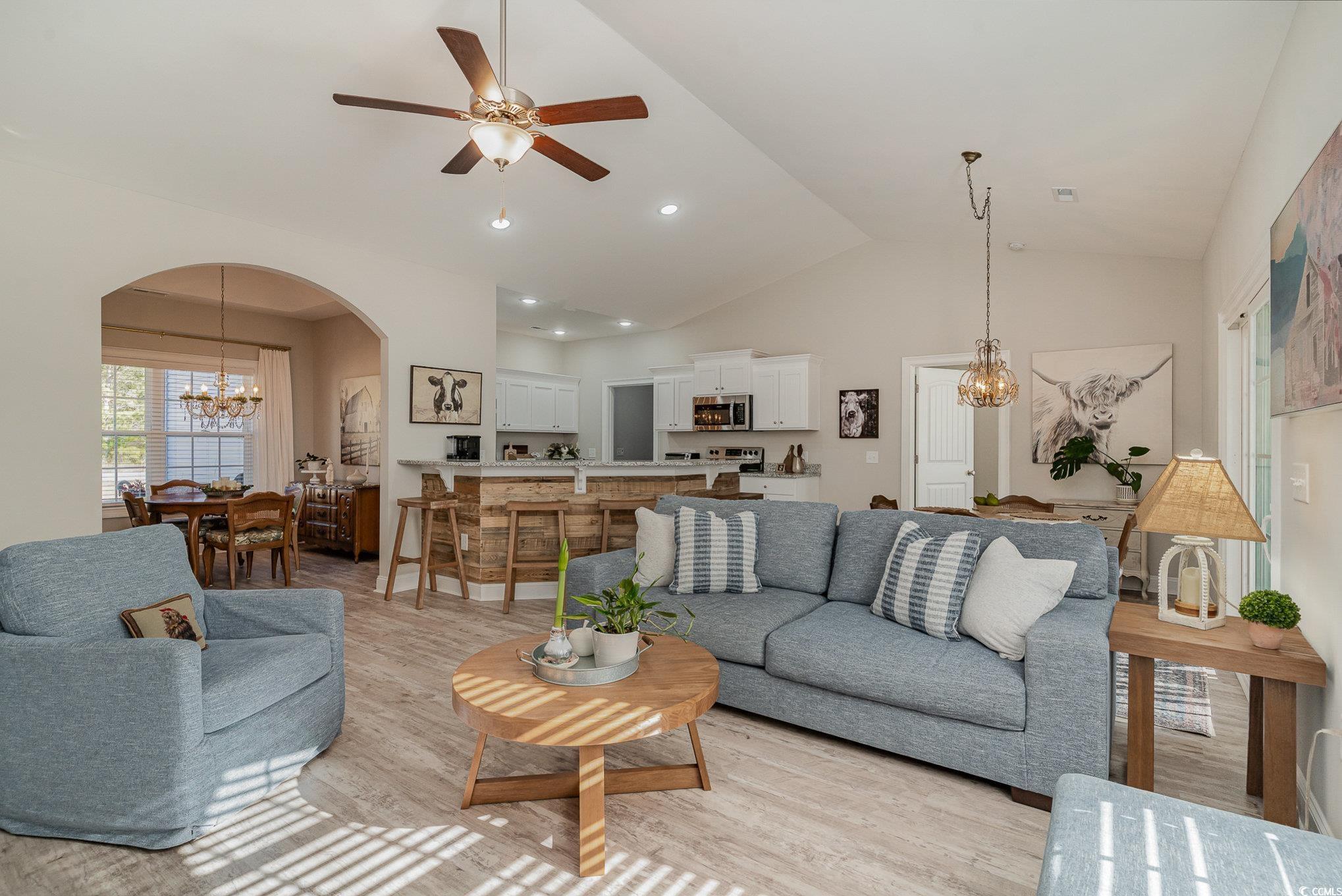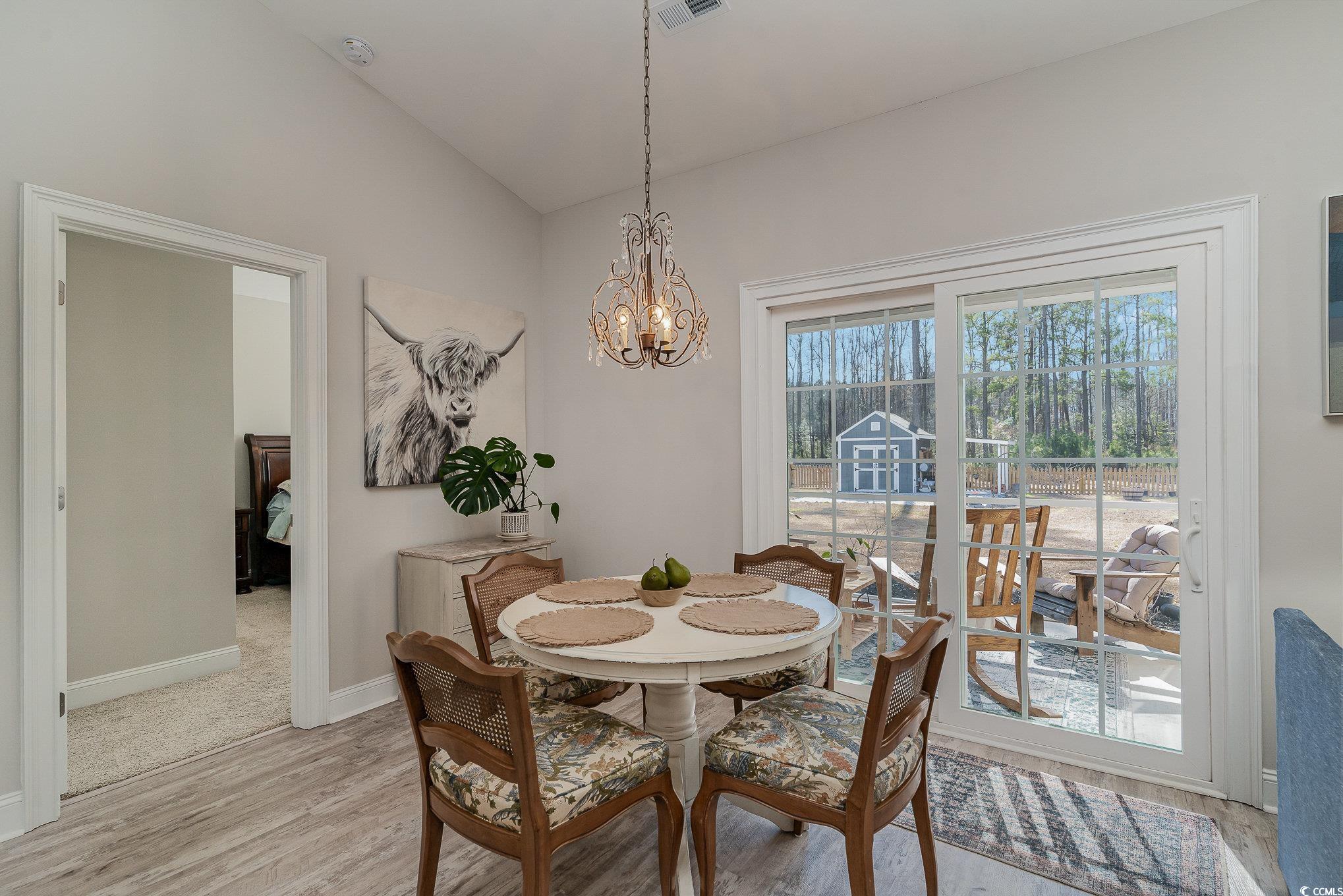 Welcome to this beautifully crafted 3-bedroom, 2-bathroom home, built in 2023 and situated on a spacious 0.76-acre lot in the sought-after Mt. Pillar Estates. From the welcoming front porch to the thoughtfully designed interior, this home combines modern elegance with everyday functionality. As you step inside, you'll find a formal dining room with a tray ceiling and arched entryway, flowing seamlessly into the open living area featuring vaulted ceilings and a ceiling fan. The kitchen is equipped with granite countertops, stainless steel appliances, a breakfast bar, recessed lighting, and has a charming breakfast nook. Sliding glass doors from the nook lead to a screened-in porch and a large concrete patio with a shaded area and a fire pit, perfect for outdoor gatherings. The owners suite is situated in the rear of the home with vaulted ceilings, a ceiling fan, a spacious walk-in closet, and an ensuite bath that includes double sinks, a large vanity, a walk-in shower, a linen closet, and plenty of natural light. Two additional bedrooms, both with ceiling fans, are conveniently located near the guest bath. A large pantry is located in the laundry room. Luxury Vinyl Plank (LVP) flooring runs throughout the living areas and bathrooms, while carpeting adds comfort to the bedrooms. The two-car garage features an epoxy-coated floor, built-in shelving, and pull-down stairs for attic storage. The outdoor space is impressive with a fully fenced yard, an irrigation system, and a 10x10 shed equipped with electricity and water. This home offers the tranquility of small-town living while being just minutes from downtown Loris, the Nature Park, shopping, dining, and medical facilities. Combining modern design with exceptional functionality, this home is the perfect place to live, entertain, and relax. Schedule your showing today!***Be sure to ask about special interest rate***