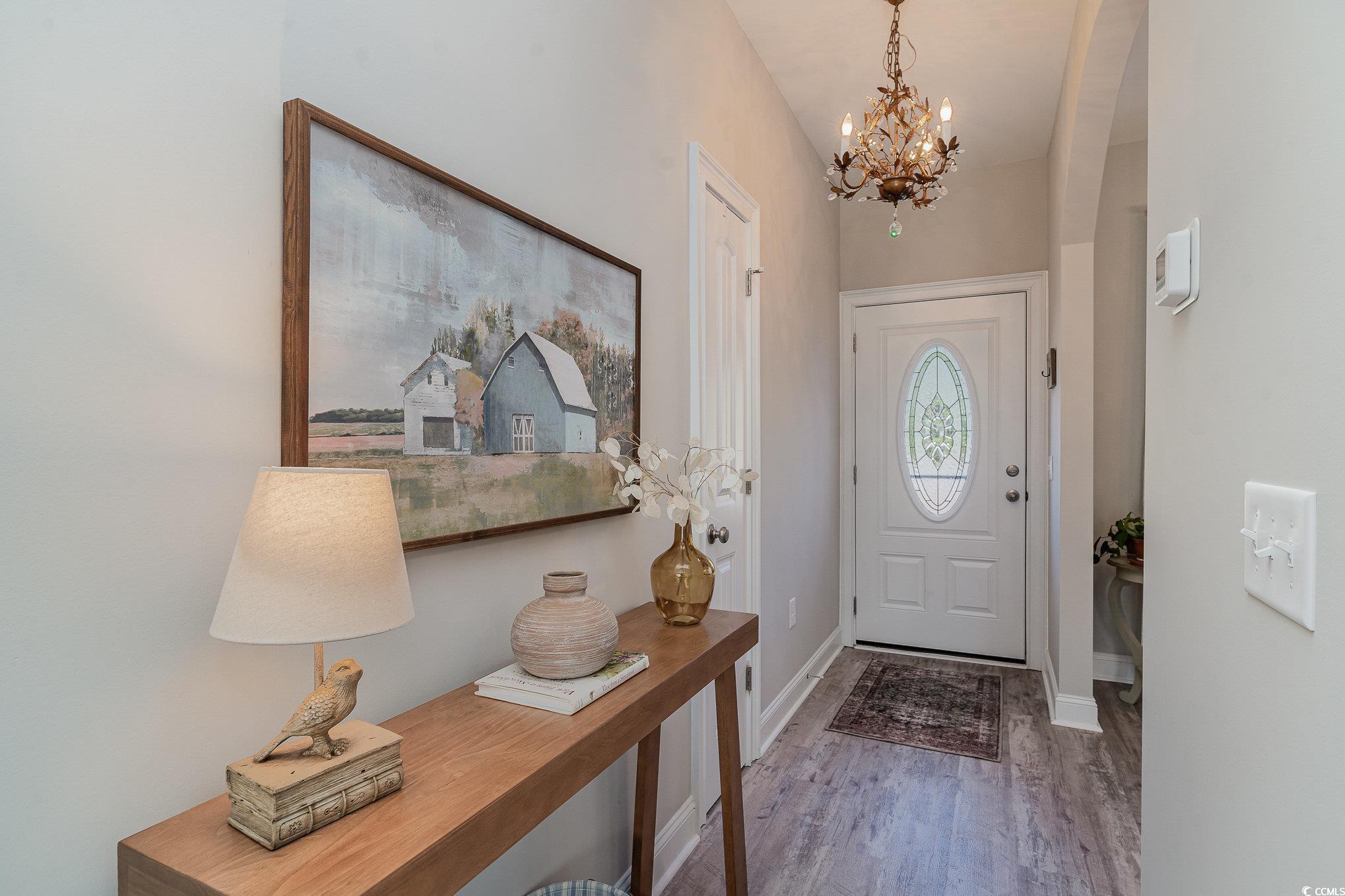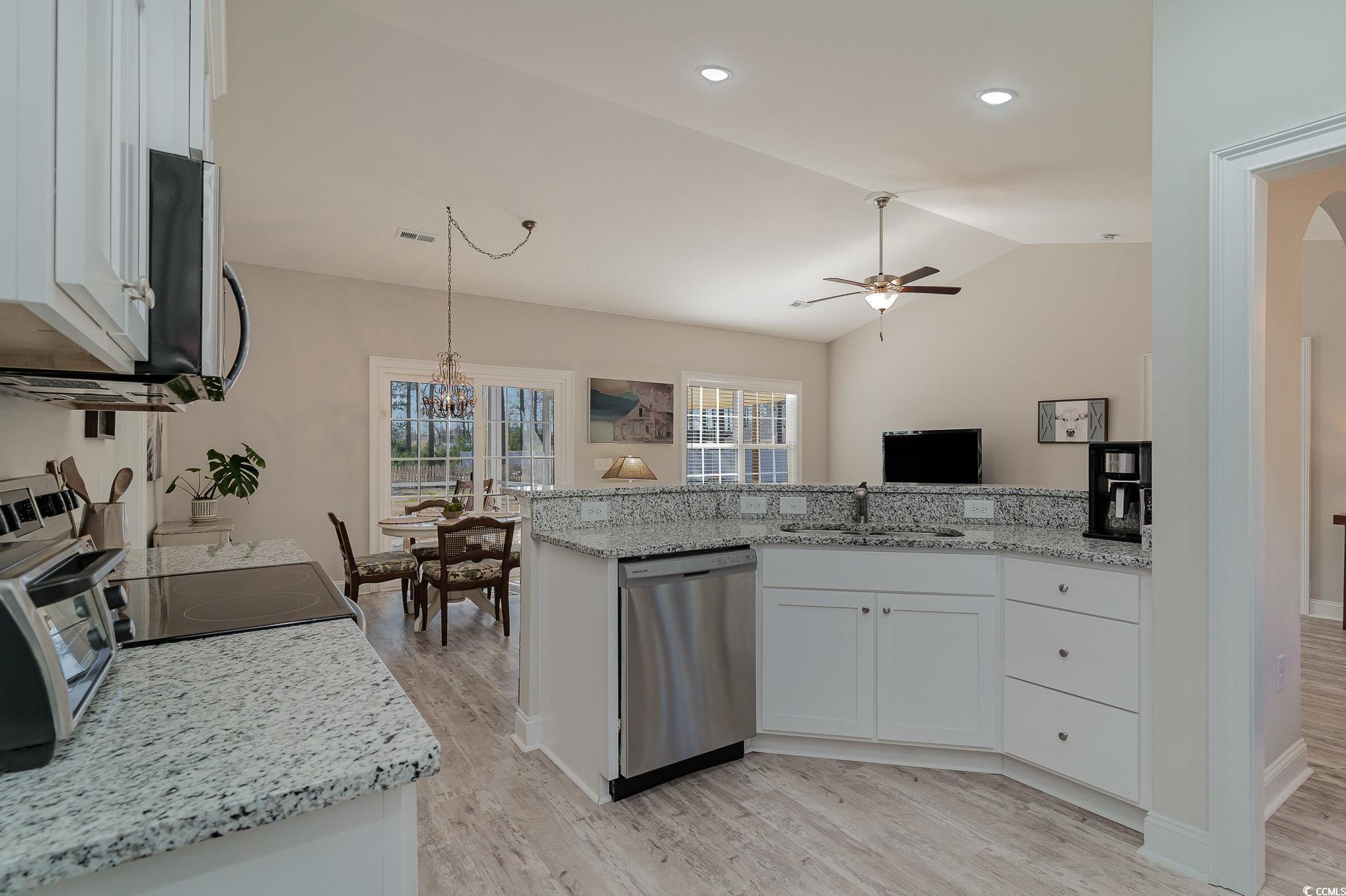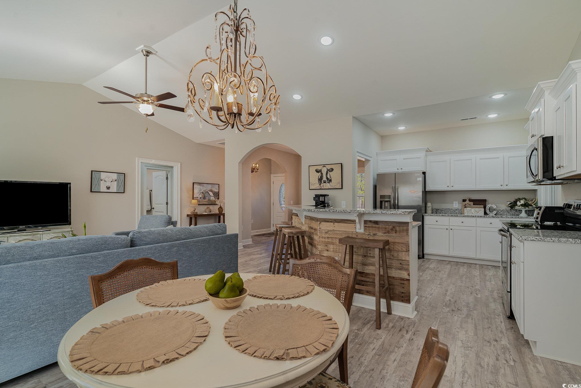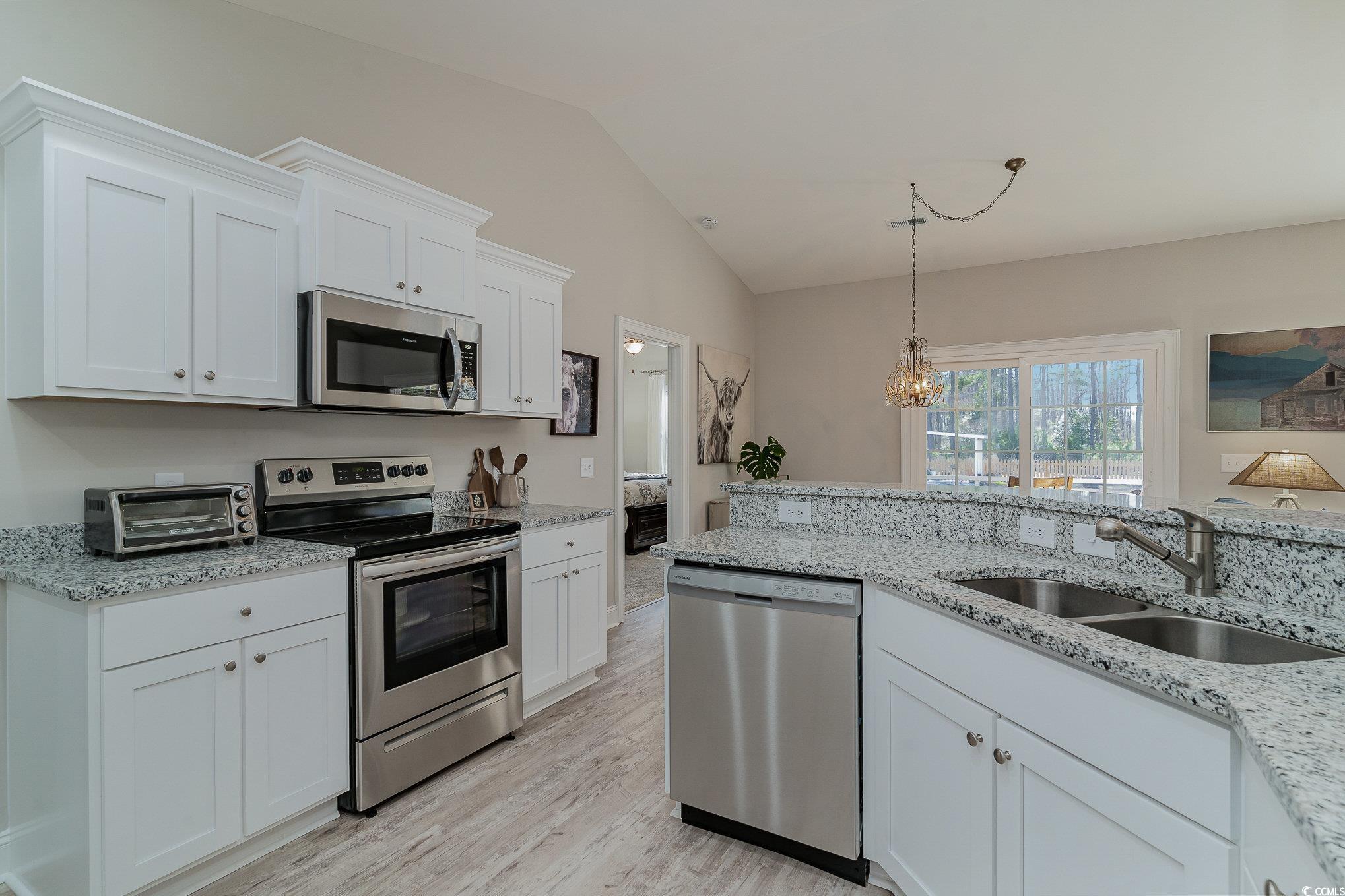 Welcome to this beautifully crafted 3-bedroom, 2-bathroom home, built in 2023 and situated on a spacious 0.76-acre lot in the sought-after Mt. Pillar Estates. From the welcoming front porch to the thoughtfully designed interior, this home combines modern elegance with everyday functionality. As you step inside, you'll find a formal dining room with a tray ceiling and arched entryway, flowing seamlessly into the open living area featuring vaulted ceilings and a ceiling fan. The kitchen is equipped with granite countertops, stainless steel appliances, a breakfast bar, recessed lighting, and has a charming breakfast nook. Sliding glass doors from the nook lead to a screened-in porch and a large concrete patio with a shaded area and a fire pit, perfect for outdoor gatherings. The owners suite is situated in the rear of the home with vaulted ceilings, a ceiling fan, a spacious walk-in closet, and an ensuite bath that includes double sinks, a large vanity, a walk-in shower, a linen closet, and plenty of natural light. Two additional bedrooms, both with ceiling fans, are conveniently located near the guest bath. A large pantry is located in the laundry room. Luxury Vinyl Plank (LVP) flooring runs throughout the living areas and bathrooms, while carpeting adds comfort to the bedrooms. The two-car garage features an epoxy-coated floor, built-in shelving, and pull-down stairs for attic storage. The outdoor space is impressive with a fully fenced yard, an irrigation system, and a 10x10 shed equipped with electricity and water. This home offers the tranquility of small-town living while being just minutes from downtown Loris, the Nature Park, shopping, dining, and medical facilities. Combining modern design with exceptional functionality, this home is the perfect place to live, entertain, and relax. Schedule your showing today!***Be sure to ask about special interest rate***